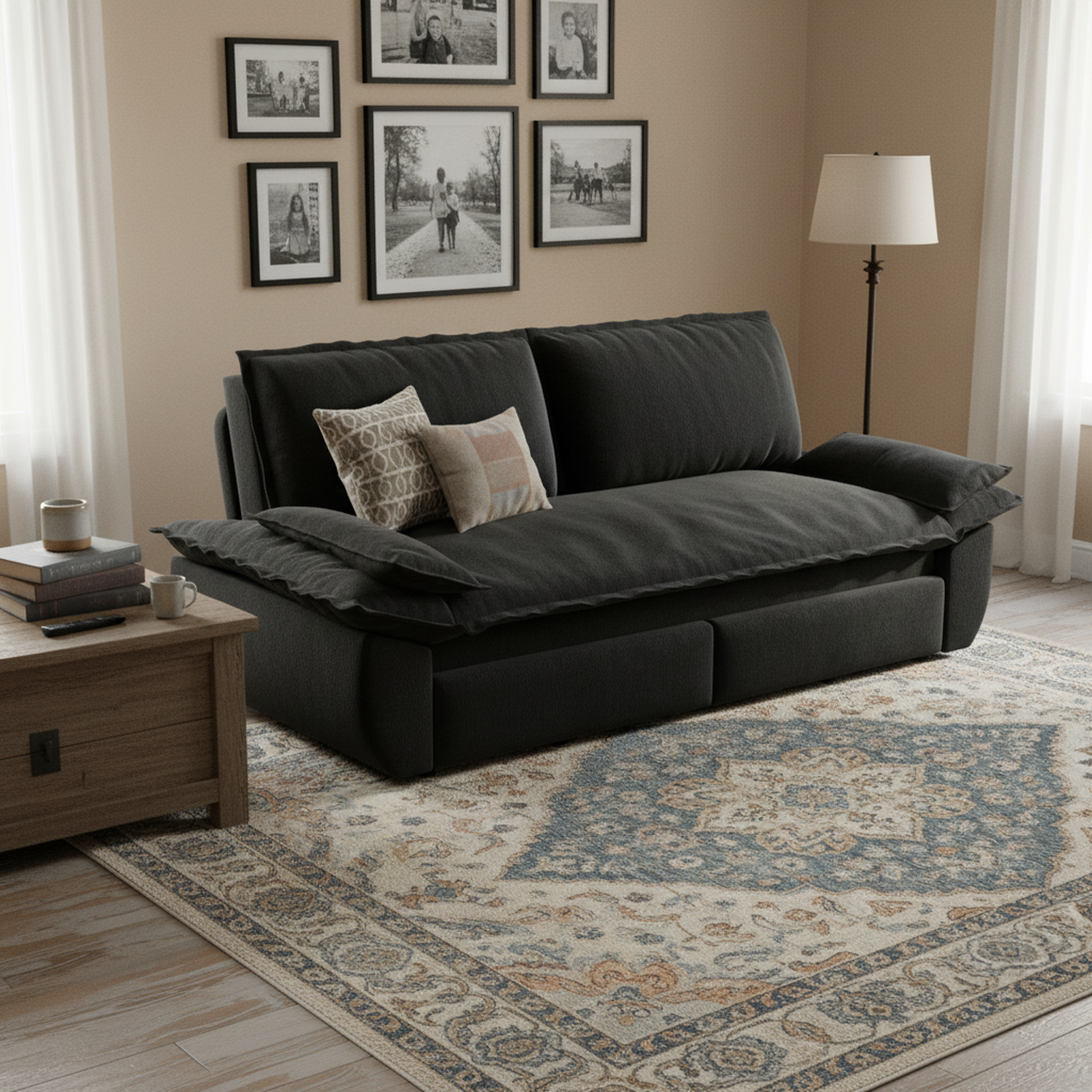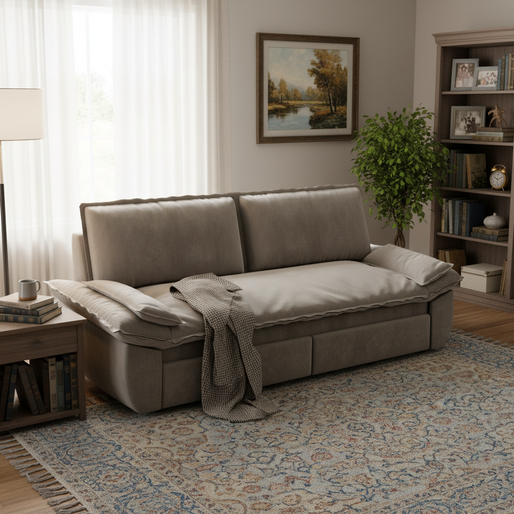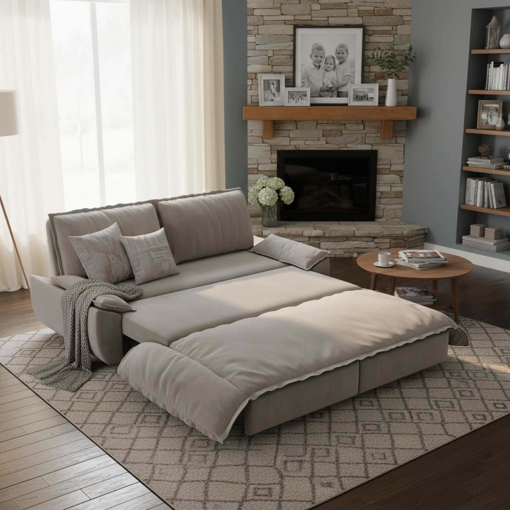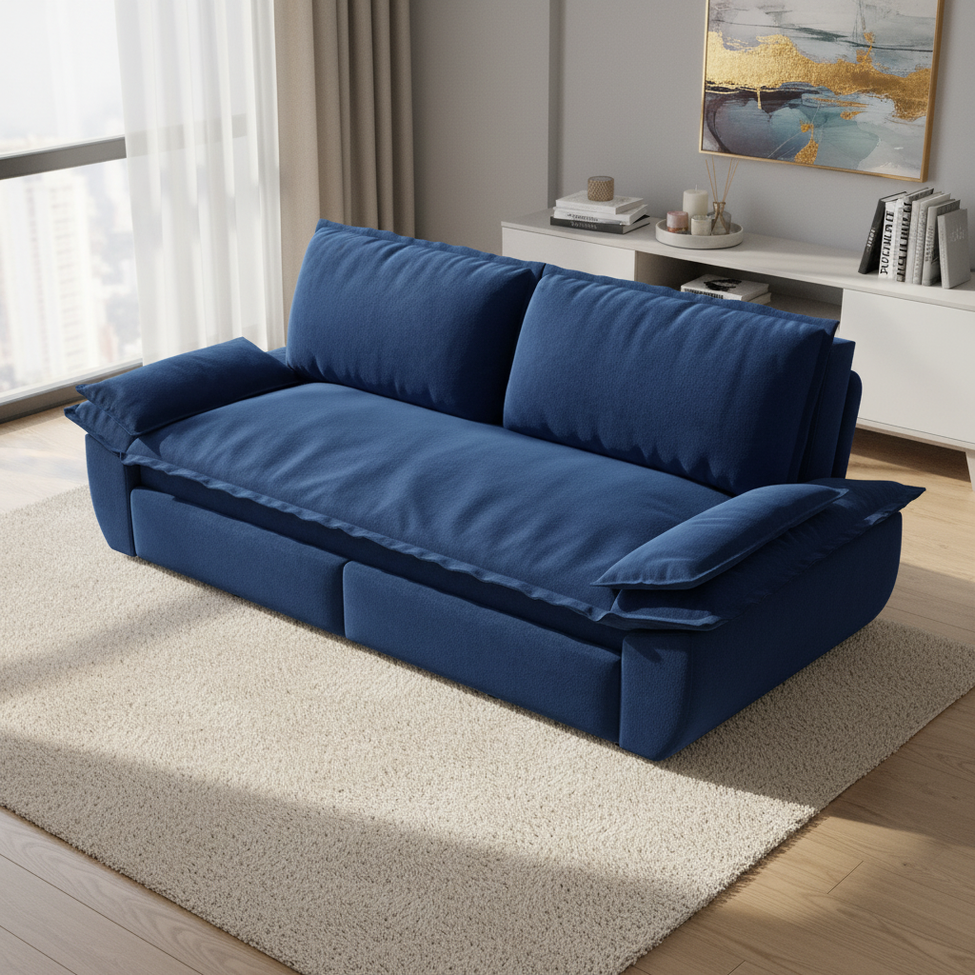 Space-saving small 3-seater velvet sleeper sofa with a hydraulic pull-out queen bed, plush wide armrests, and soft high-resilience sponge. Available in four colors, this convertible design is perfect for modern living rooms, guest rooms, or apartments.