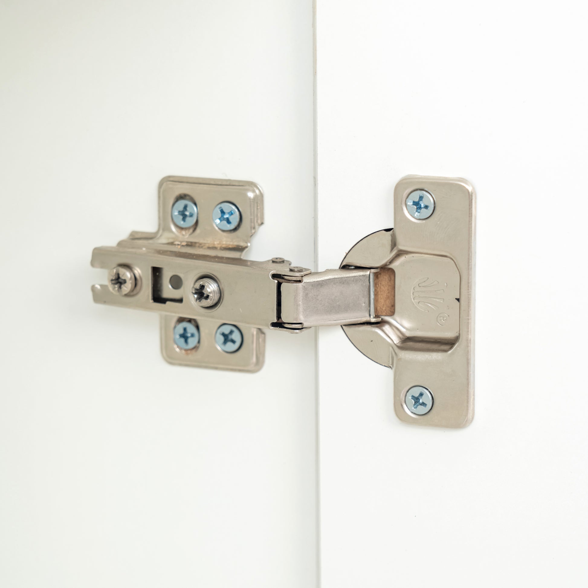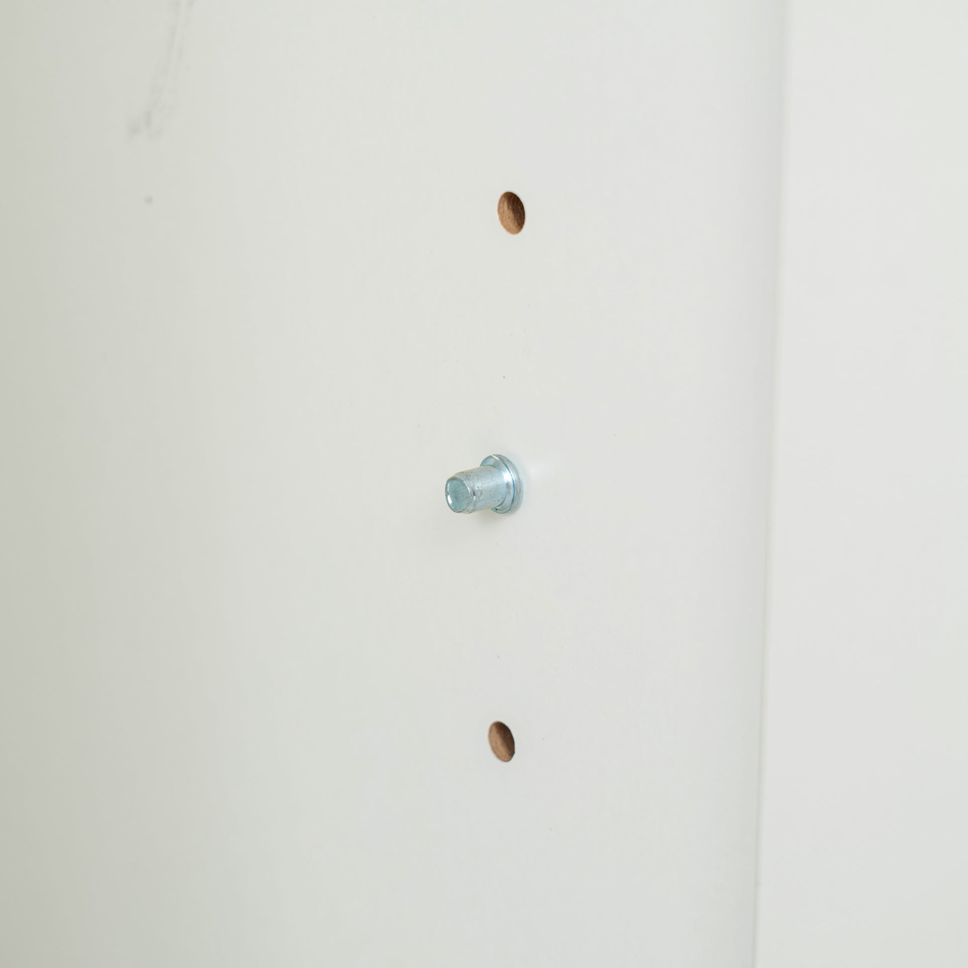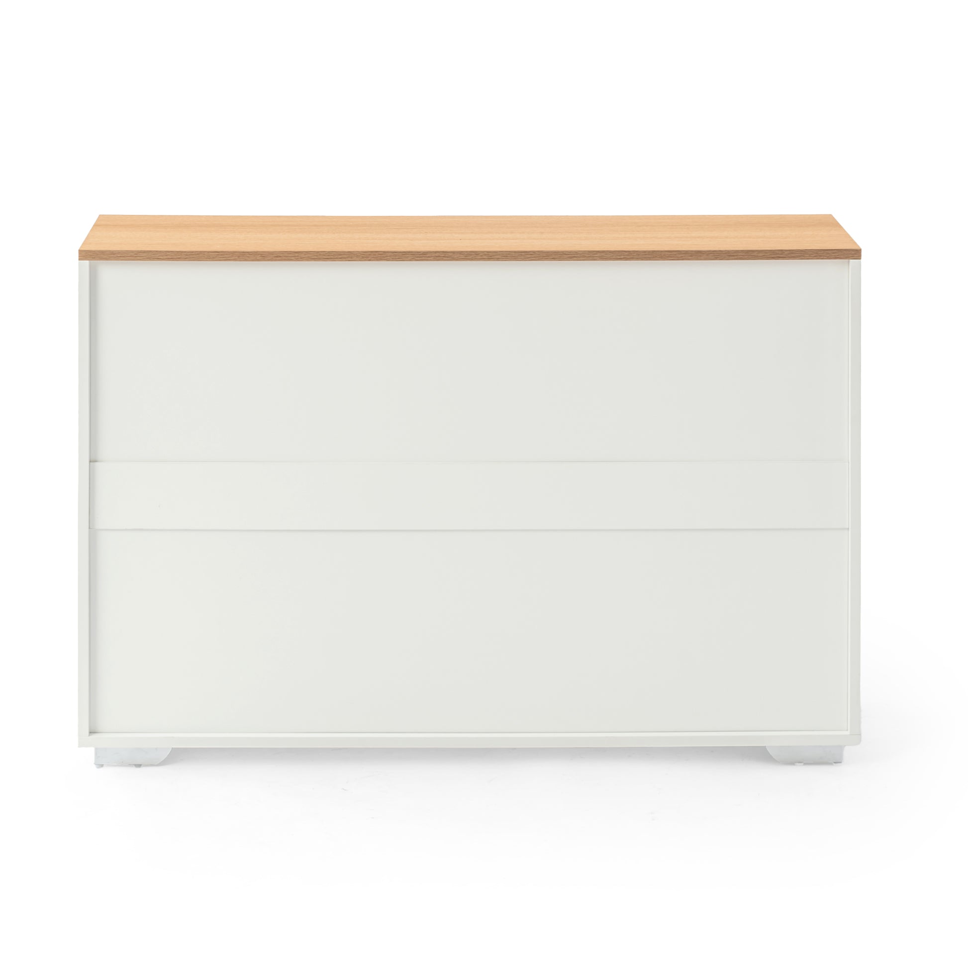 White sideboard with oak look top, one drawer and four doors. Organizes dinnerware and linens for dining room or entry and keeps daily clutter hidden and off the floor.