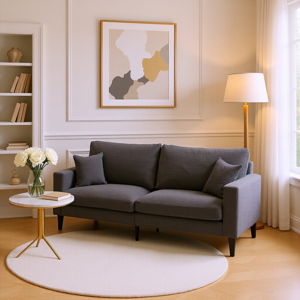 Relax in style with this modern dark gray corduroy three-seater sofa, featuring a spacious design, plush high-resilience cushions, and a sturdy wooden frame for lasting comfort in any living space.