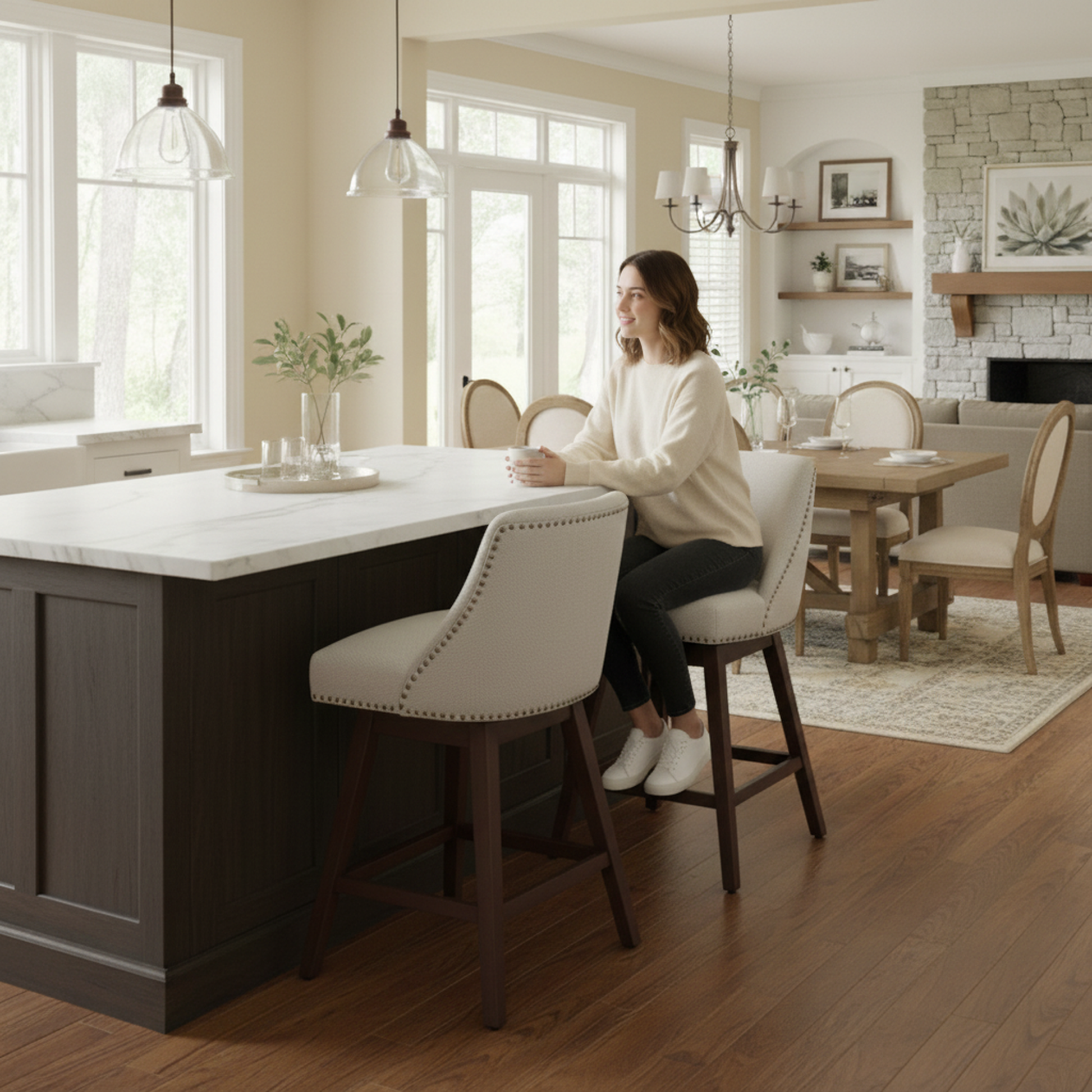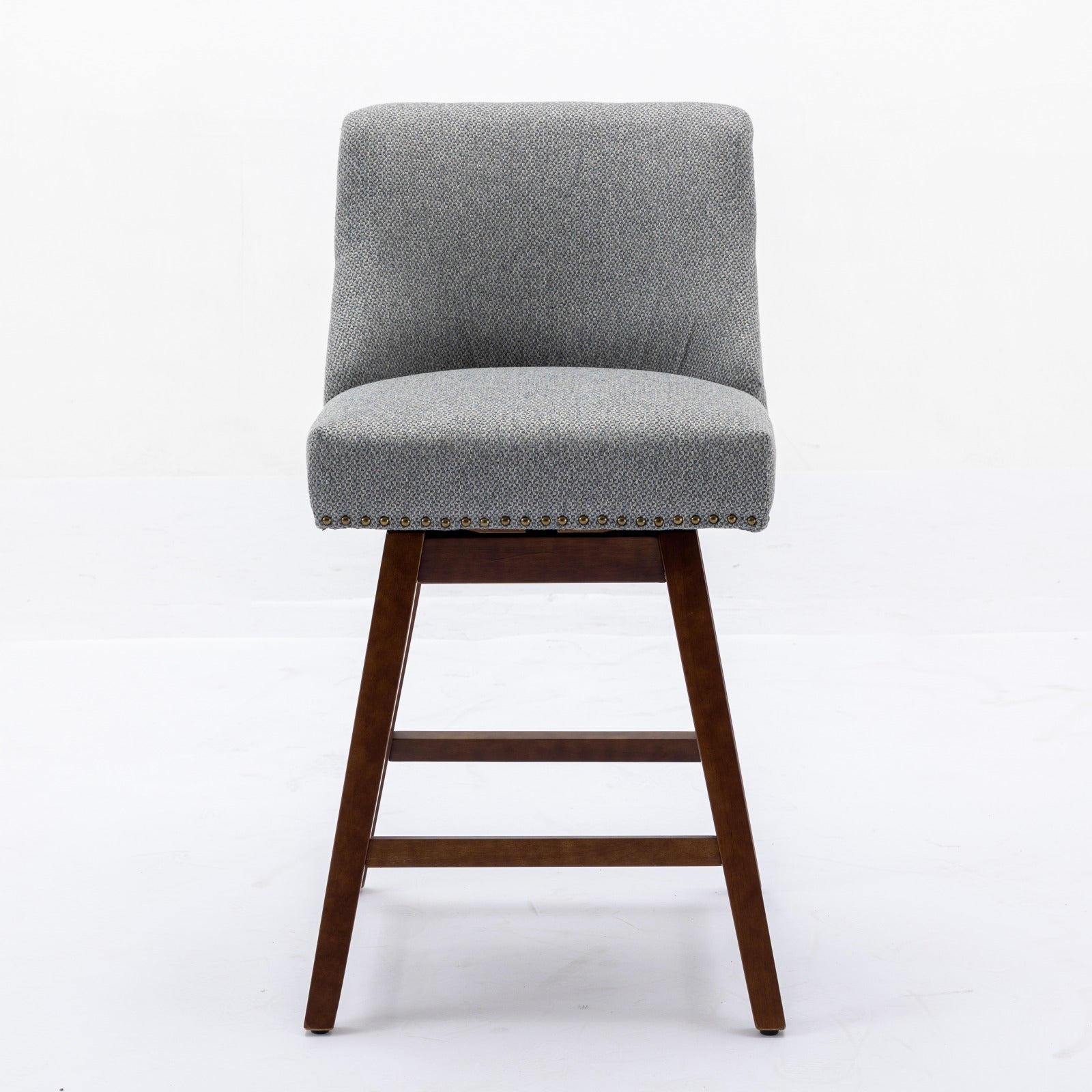 Set of 2 upholstered counter height swivel bar stools with solid rubber wood legs, curved backrest, and 26" seat height - perfect for kitchen islands, breakfast bars, and casual dining spaces.