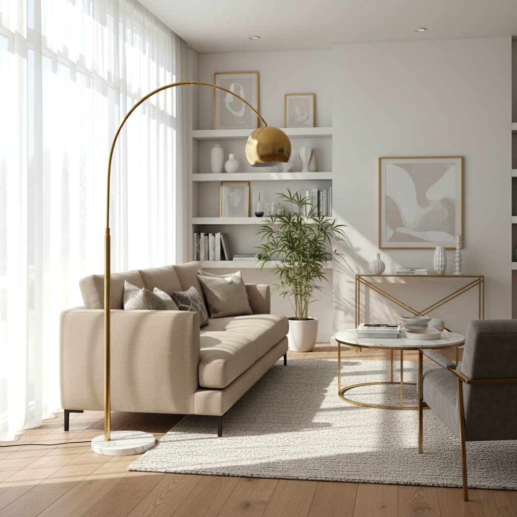 Brighten your space with the Oasis Long Arm Gold Brass Adjustable Floor Lamp, featuring a sleek arched design, brushed gold finish, and a round white marble base for a touch of modern elegance and versatile lighting.