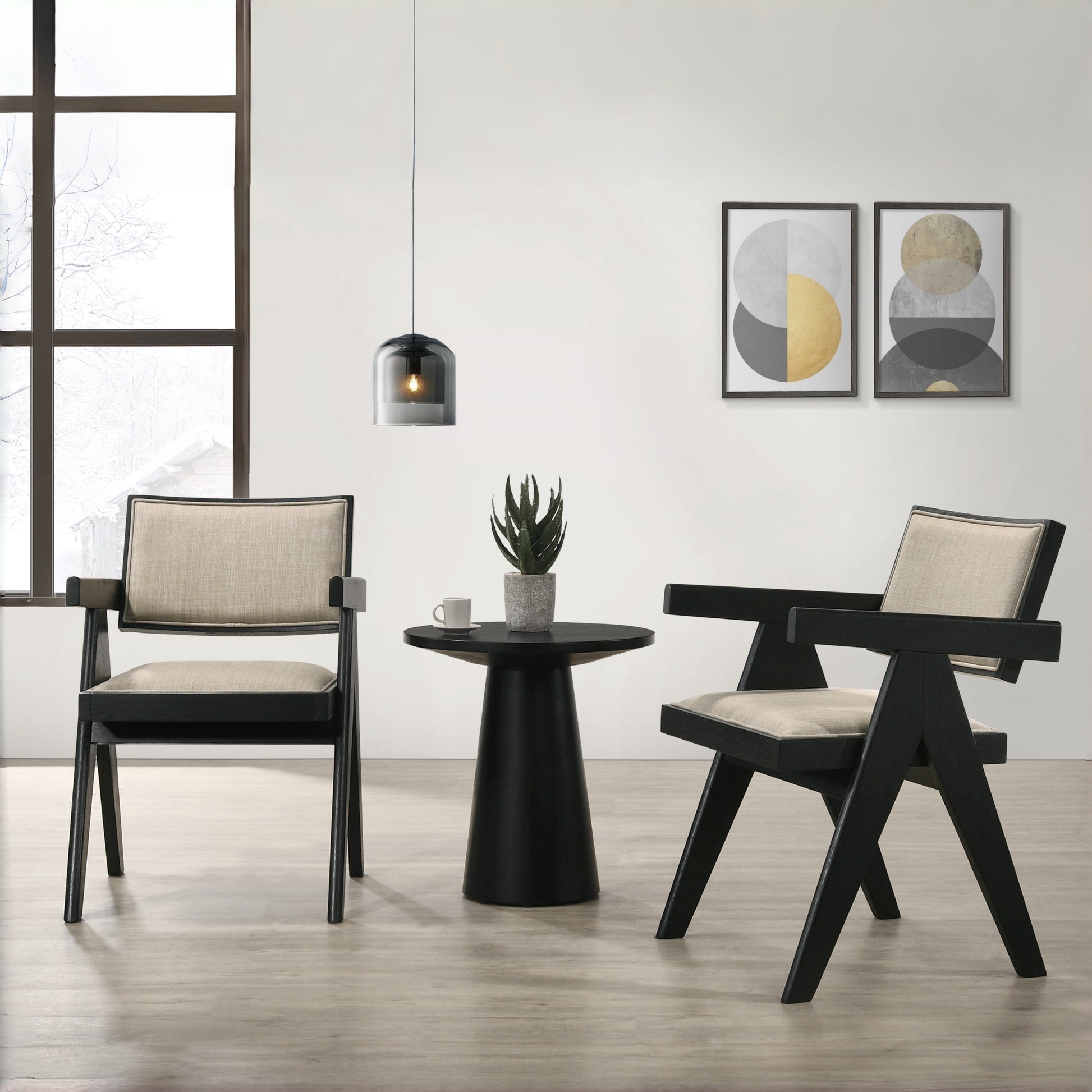 Modern 3-piece set featuring two sculpted black wood armchairs with upholstered seats and a matching round pedestal side table. Perfect for reading nooks, entryways, or living rooms seeking a stylish, compact conversation area.