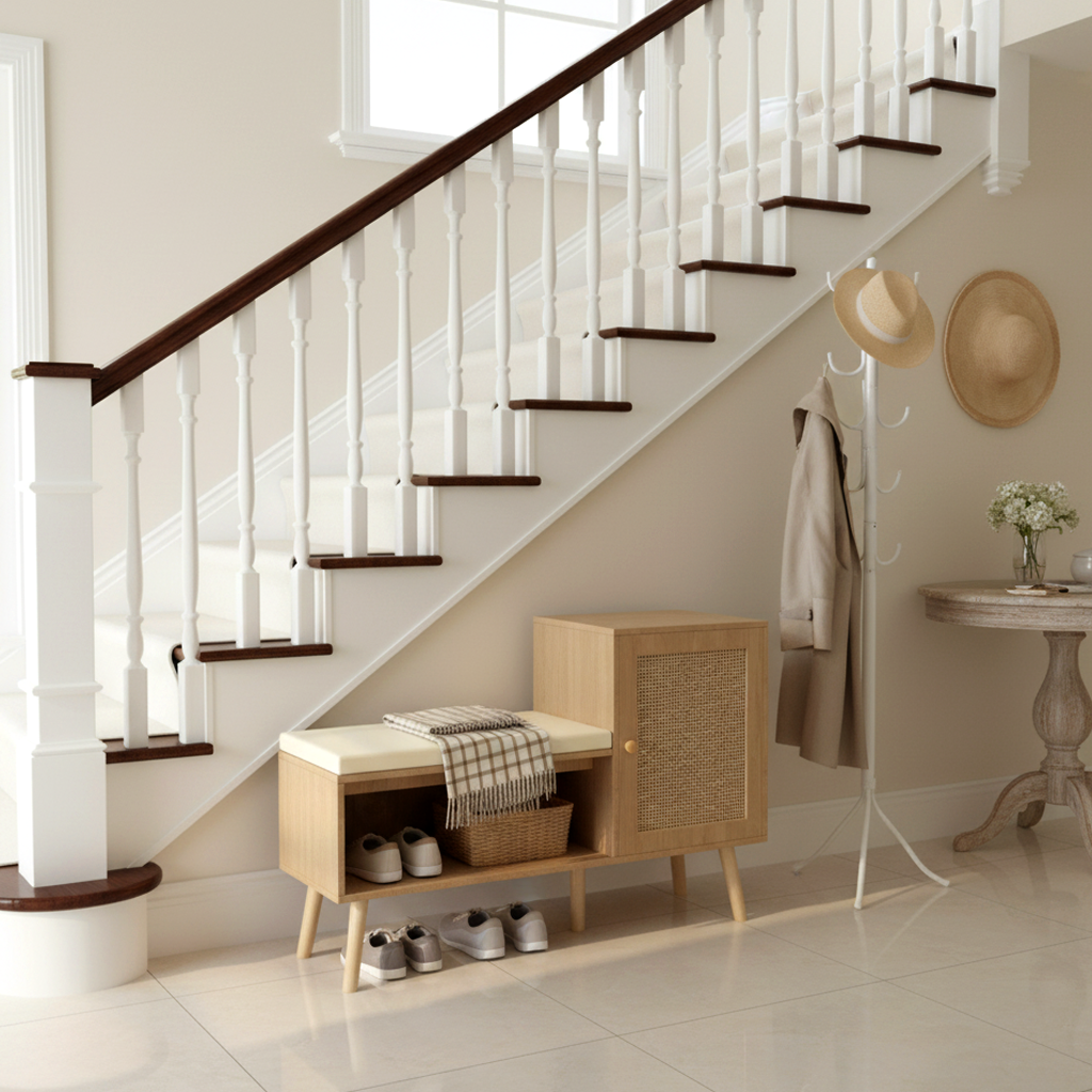 A versatile shoe bench with adjustable shelving and a cushioned seat, designed to keep your entryway tidy and welcoming.