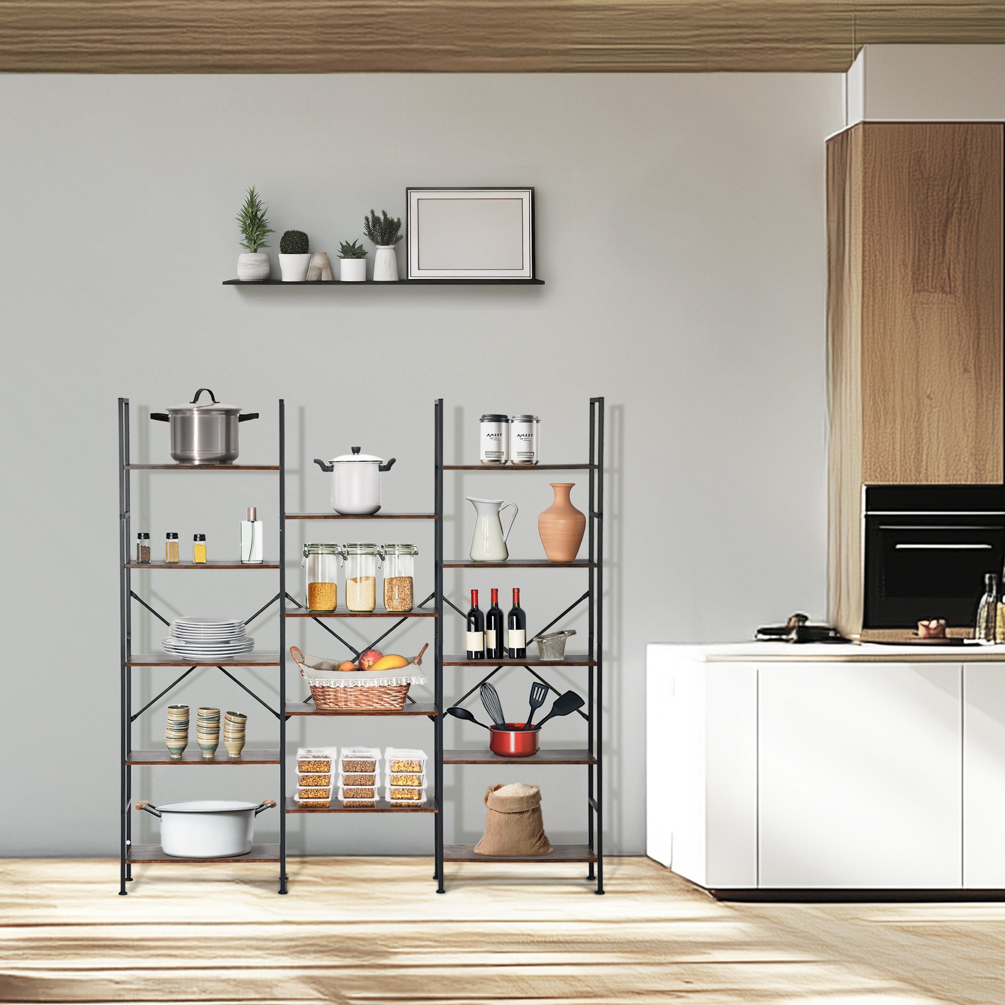 Three integrated sections provide symmetry and abundant shelving, making it suitable for both storage and decorative use