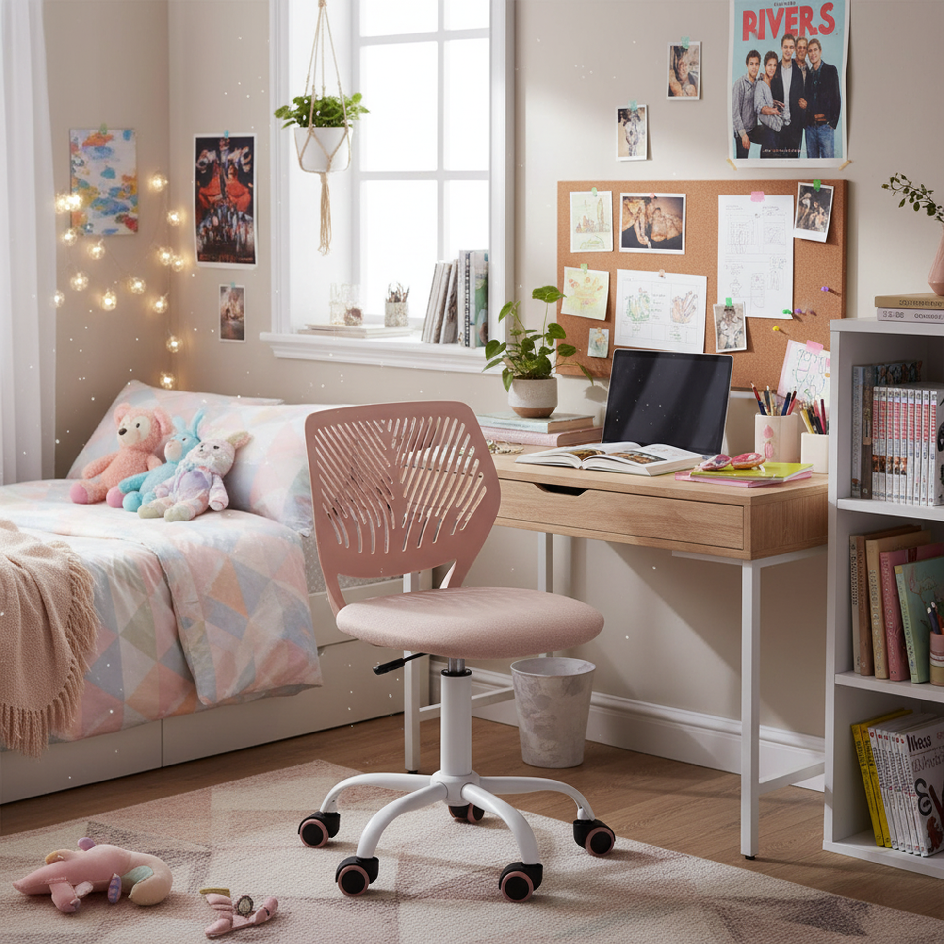 This modern pink office chair features a soft fabric seat, ergonomic backrest, and smooth-rolling PU casters. Perfect for home offices, study corners, or creative studios, it combines comfort and style for any workspace. (159 characters)