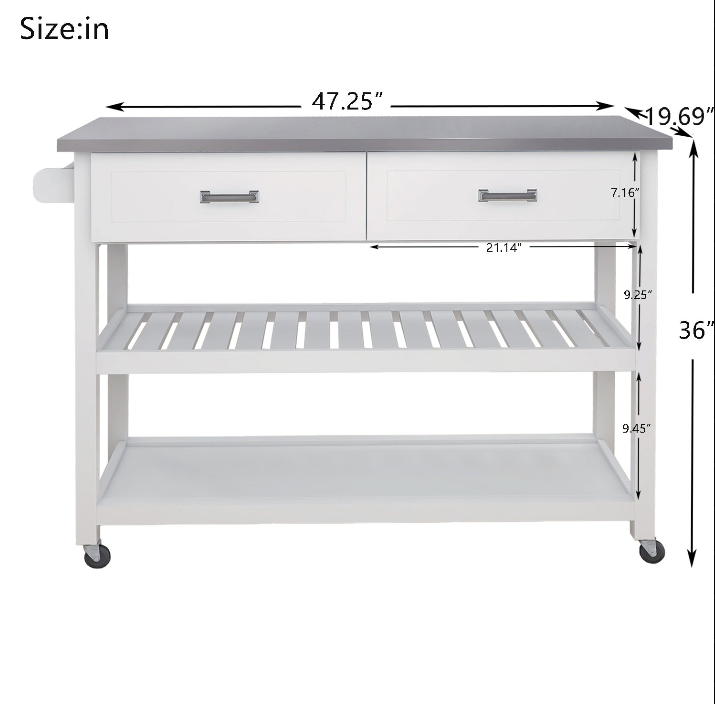 This versatile kitchen cart brings practical storage and dependable workspace to any living room, bedroom, office, apartment, dorm, home, or small space. The stainless steel tabletop offers a clean, durable surface for daily food prep, while the MDF frame provides reliable stability for everyday use. Two drawers keep utensils neatly organized, and open shelves hold larger kitchen essentials for quick access. Its simple white finish blends easily with modern or traditional décor, making it a functional solution for compact homes, shared spaces, and multipurpose work areas.
