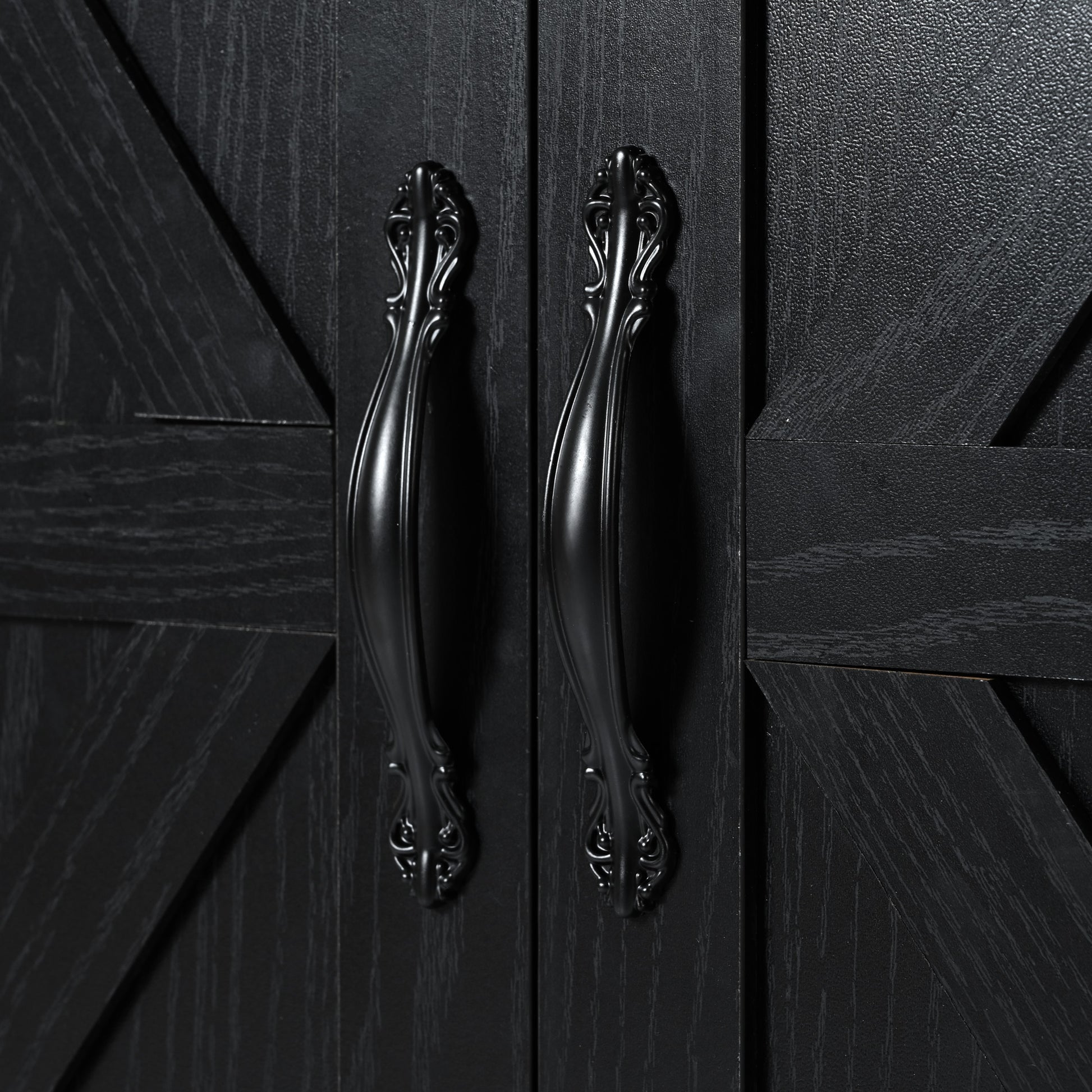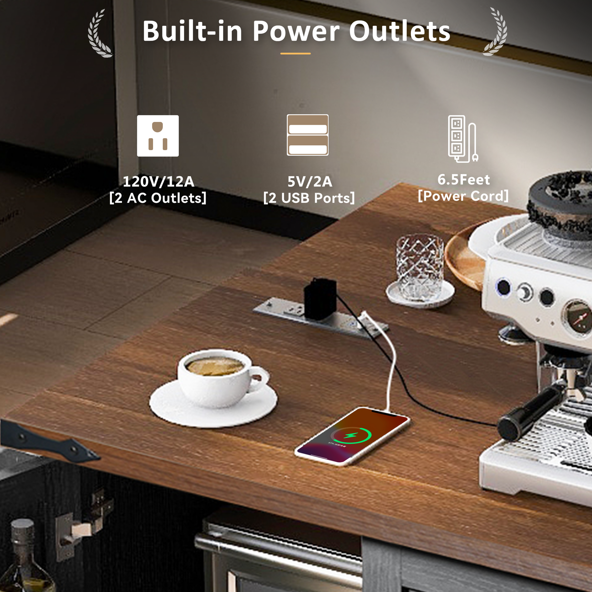 Farmhouse kitchen island with power outlet, drop leaf, spice rack, 3 drawers, 2 barn doors, and 5 wheels. Offers ample storage, sturdy structure, and easy mobility.
