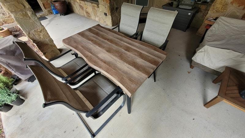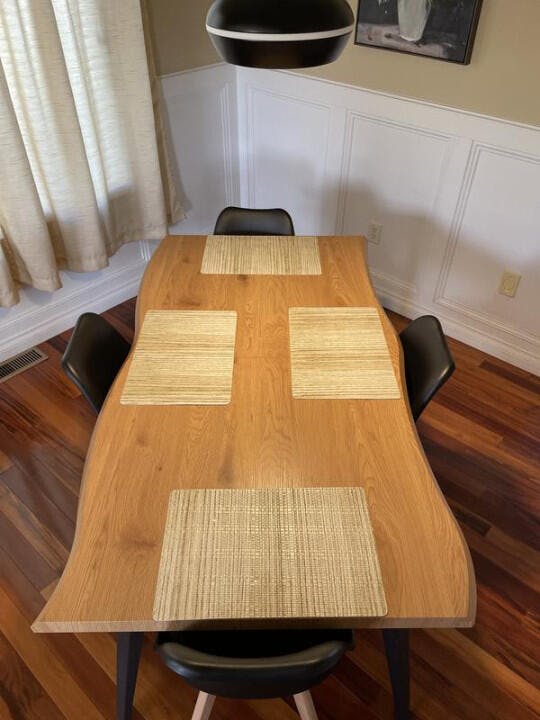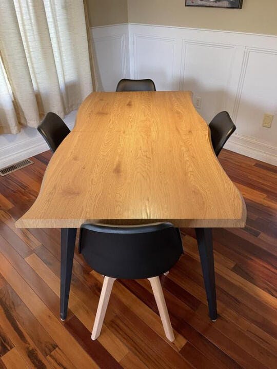 Lancelot modern wooden dining table features a rustic live edge top, black steel legs, and scratch-resistant surface - ideal for family meals or stylish home offices.