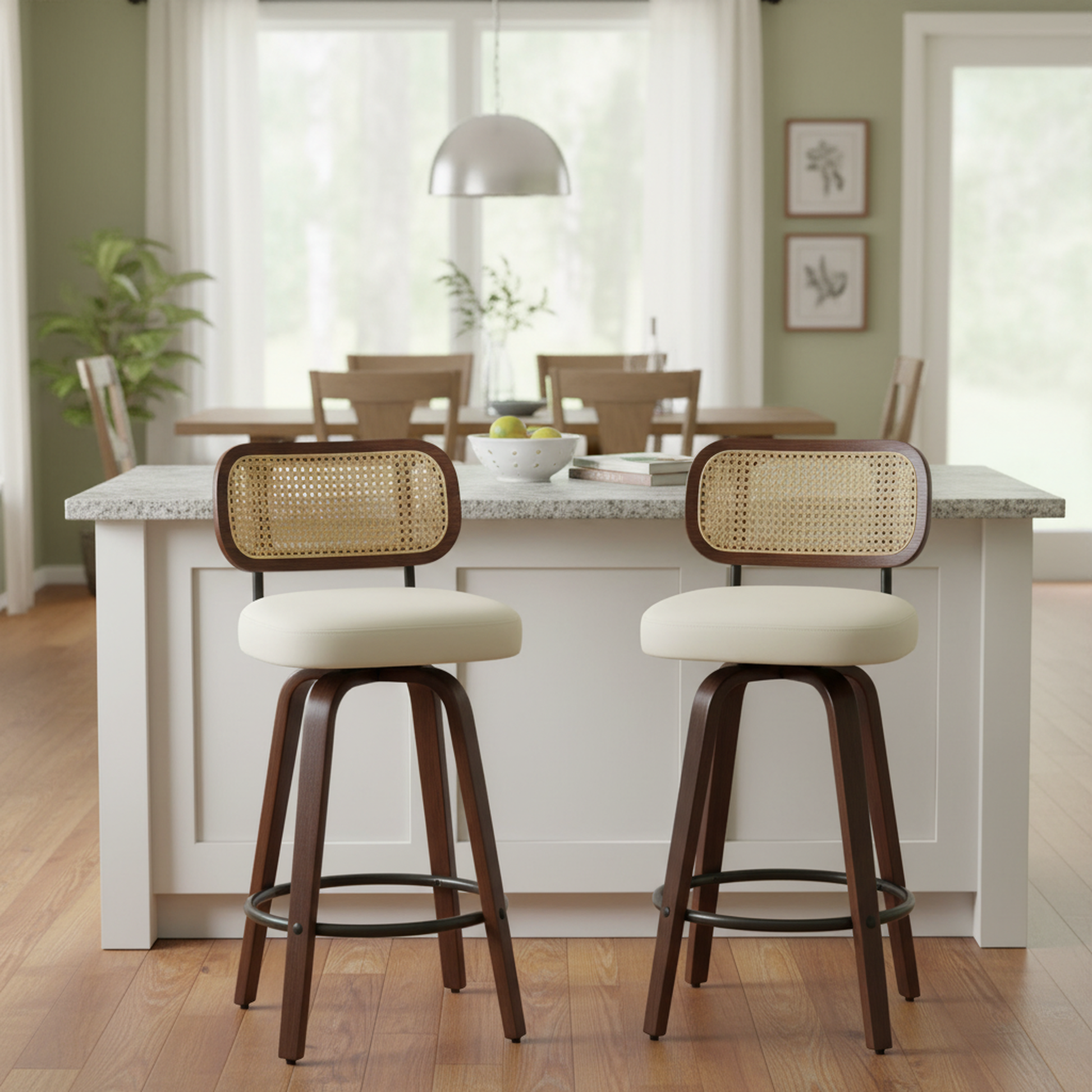 Set of 2 counter height bar stools with a rattan cane back, plush PU leather seat, and 360° swivel. Mid-century modern design with sturdy walnut wood legs and a supportive wing back, perfect for kitchen islands or dining spaces.