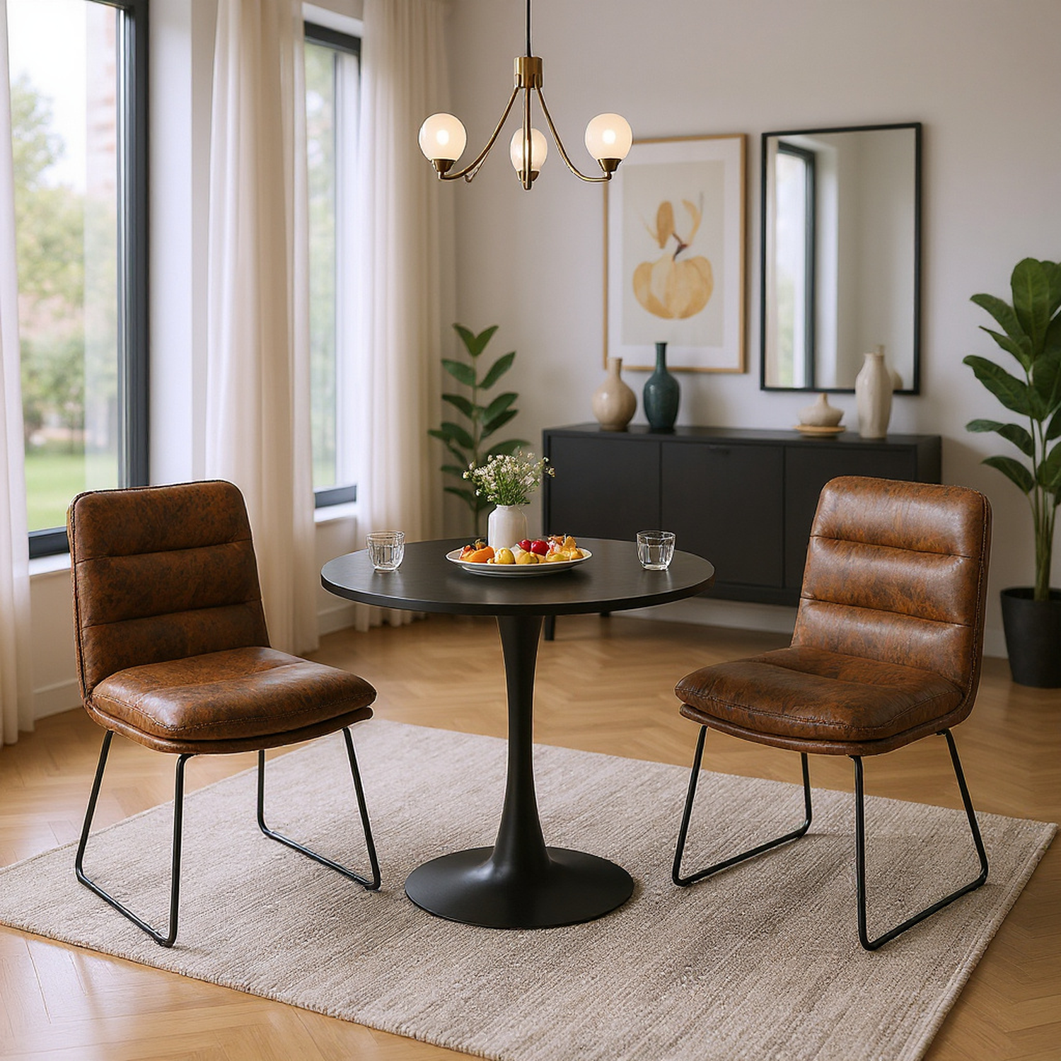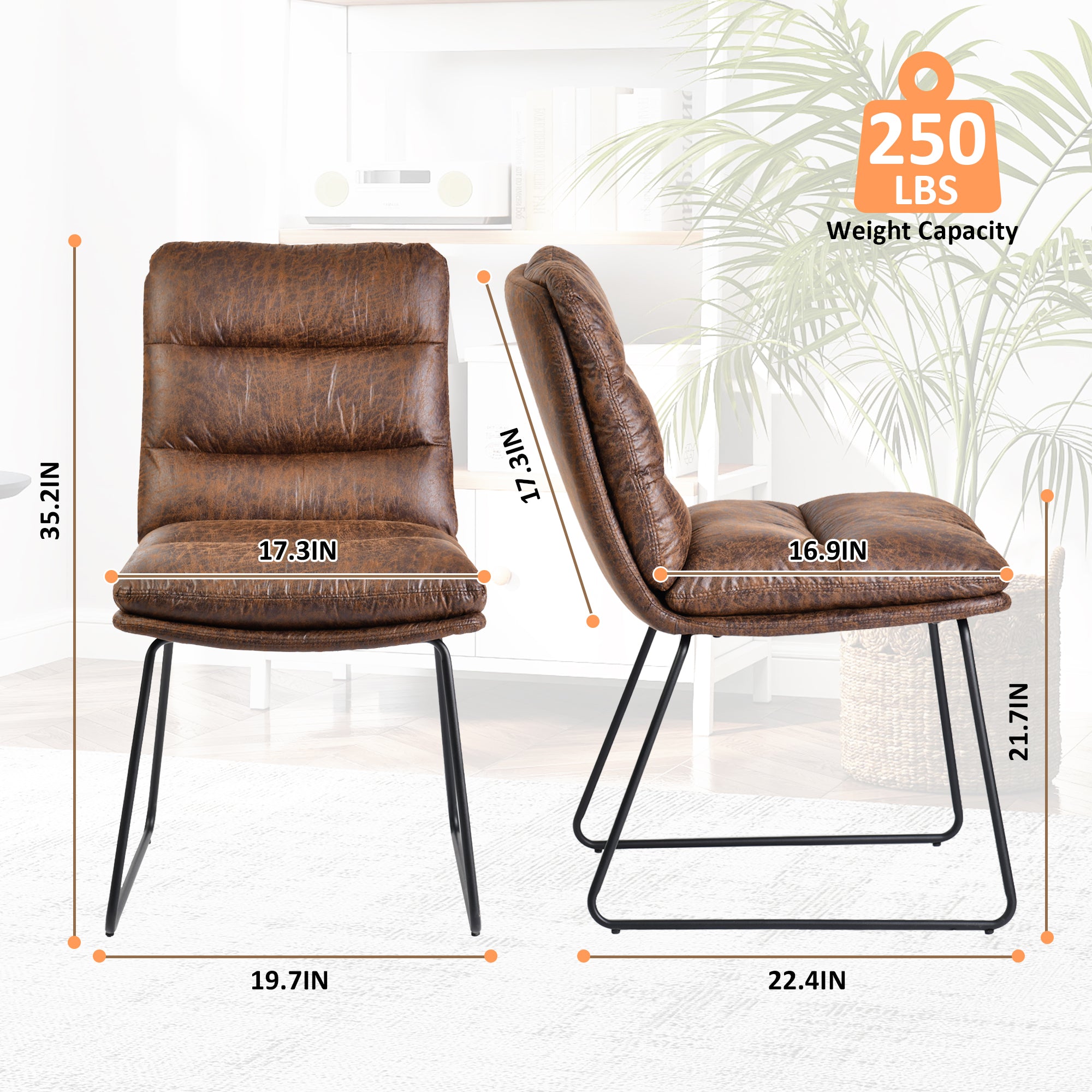 Set of 2 mid-century modern dining chairs with plush, tufted faux leather upholstery, sled-style black metal legs, and ergonomic design. Perfect for adding comfort and style to dining rooms, kitchens, or breakfast nooks.