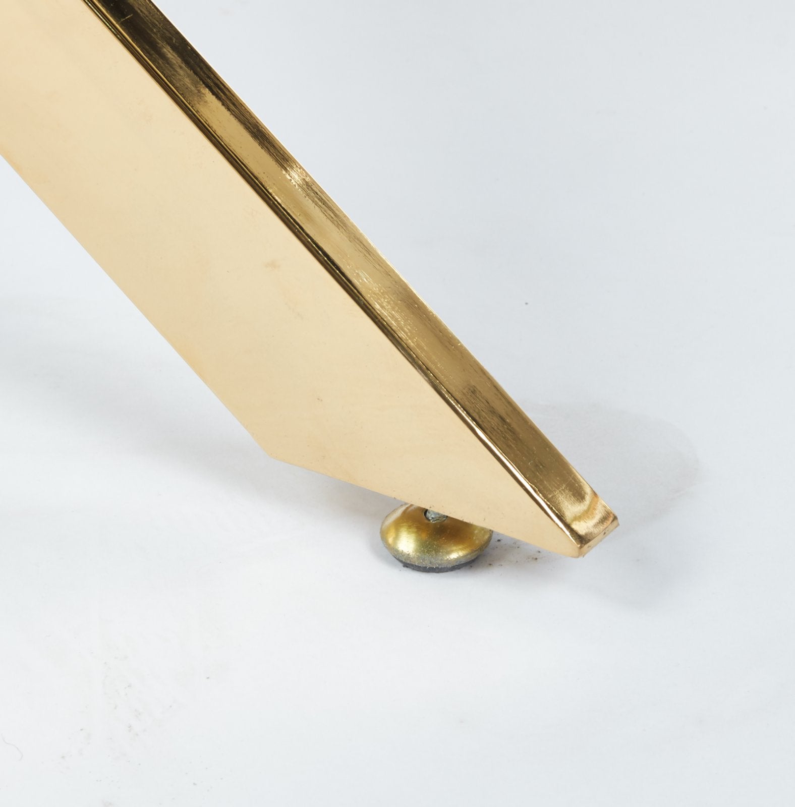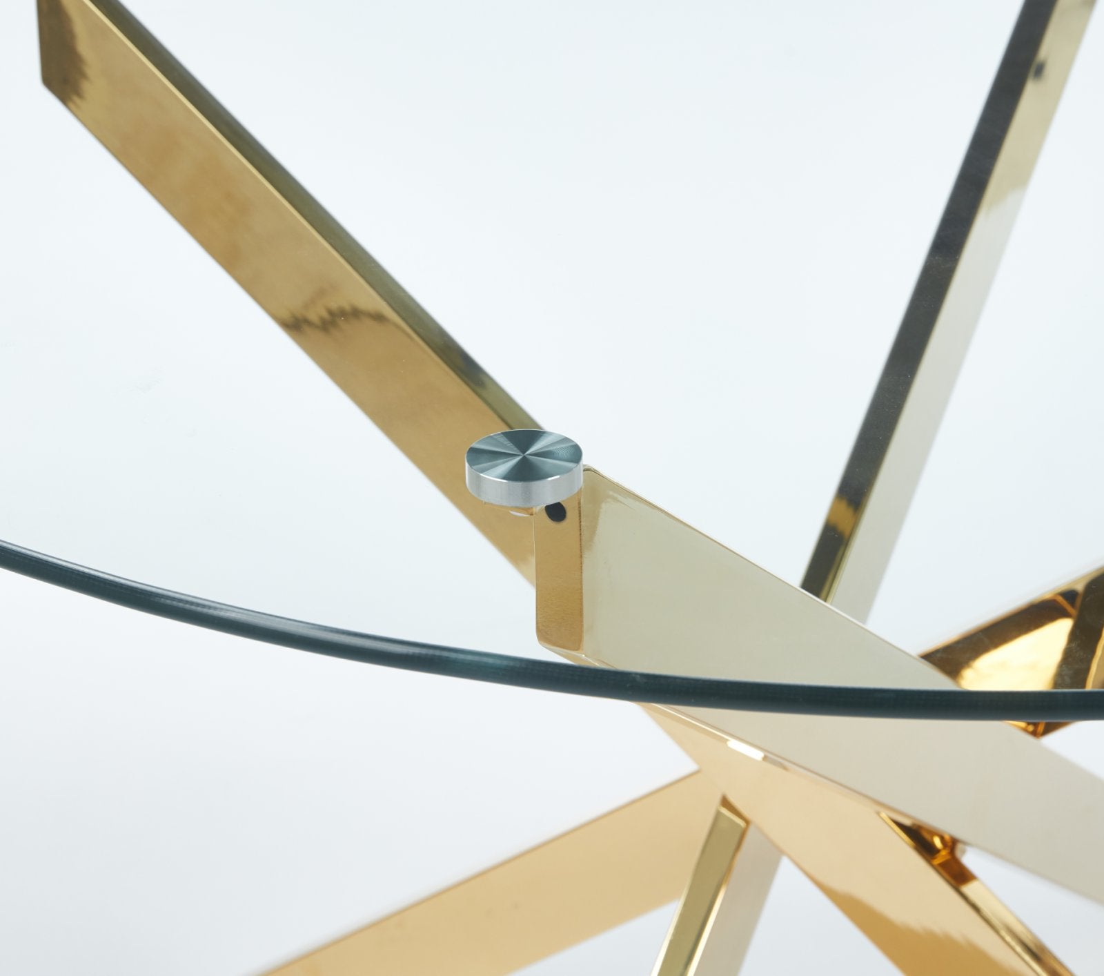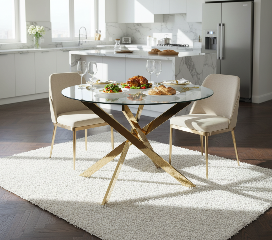 Make a statement in your dining area with this modern golden dining table, featuring a clear glass top and striking cross metal legs for a blend of elegance, stability, and contemporary style.