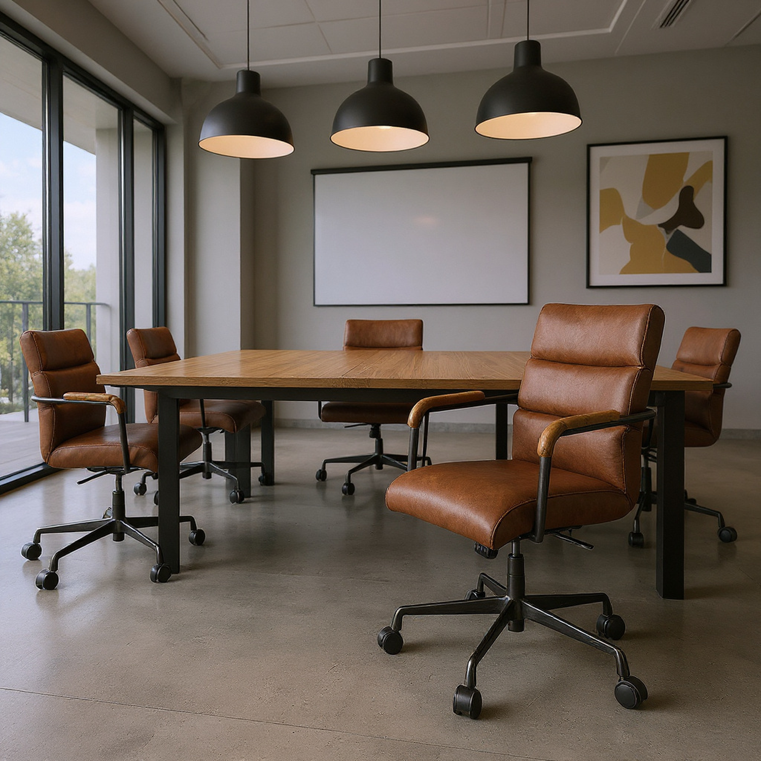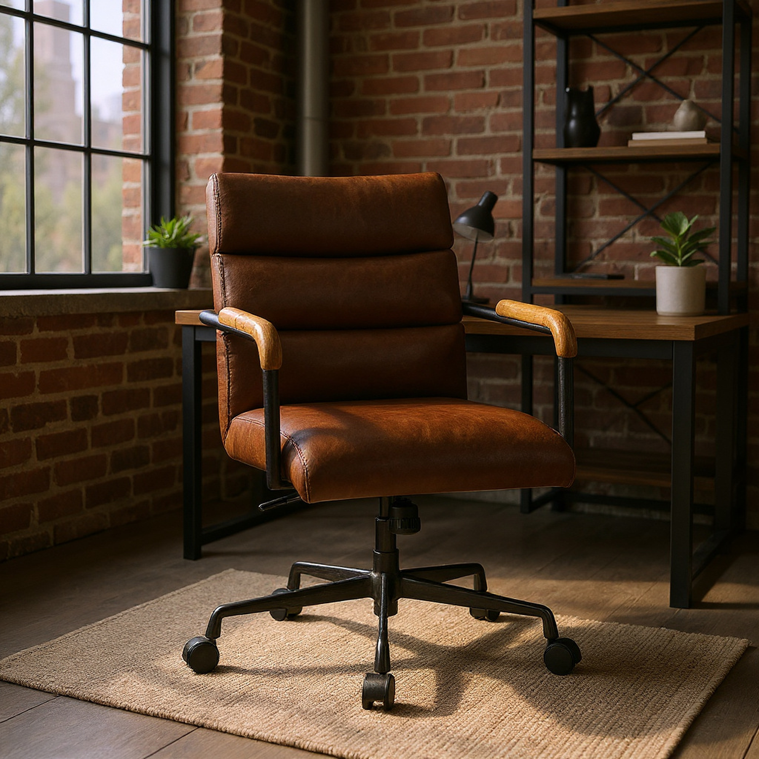 Retro brown office chair in genuine leather with smooth swivel and casters. Thick cushions and a metal five star base give comfort and strength for daily work.