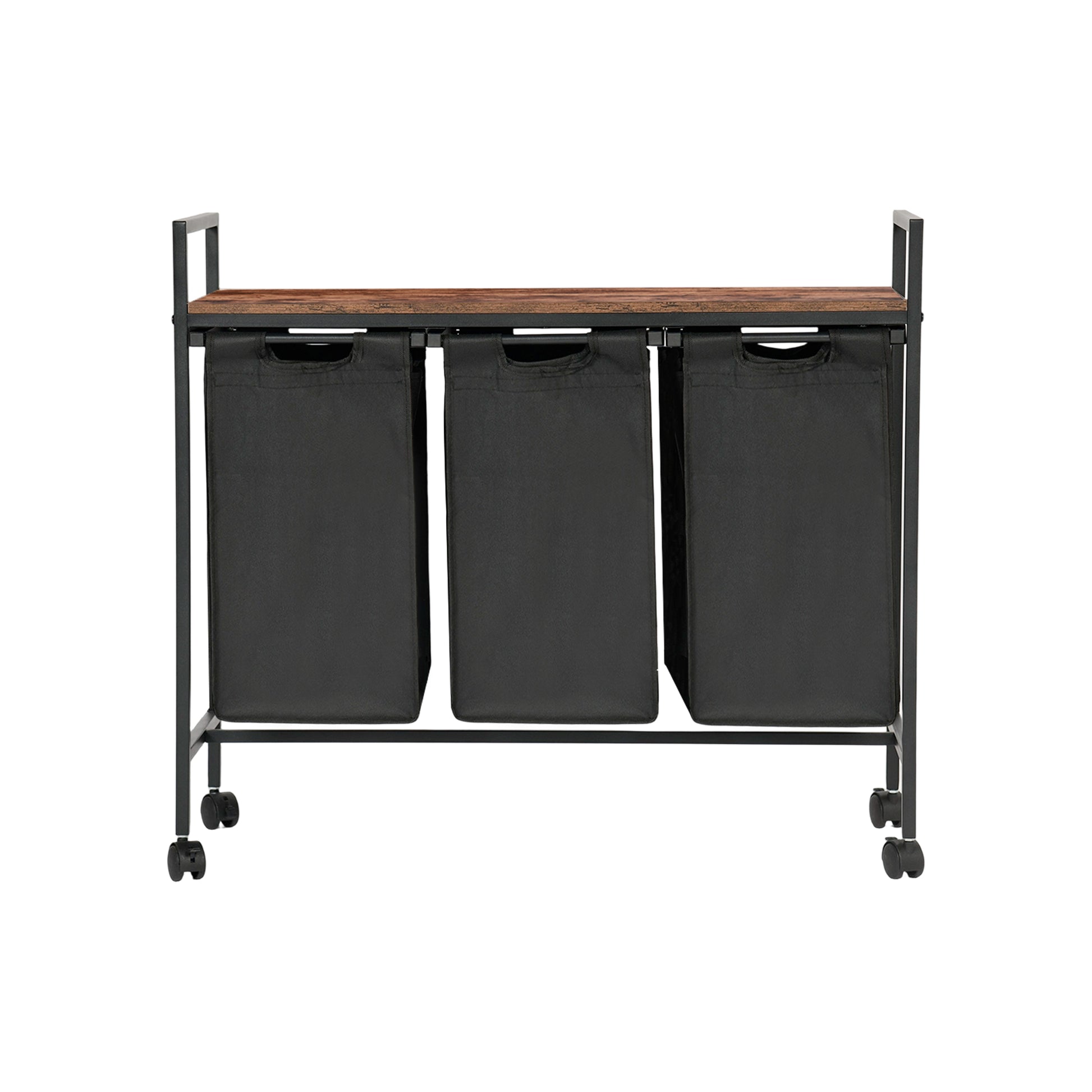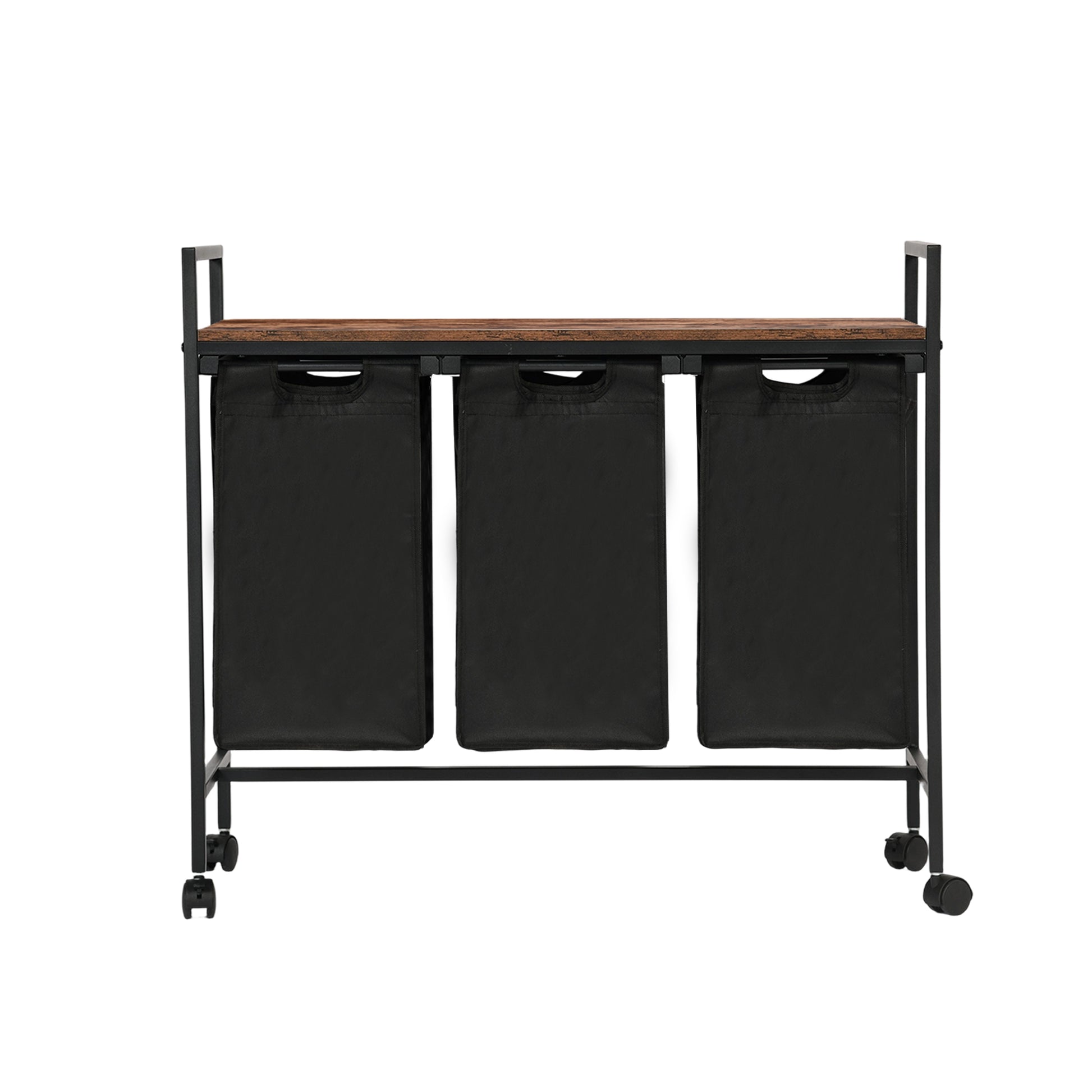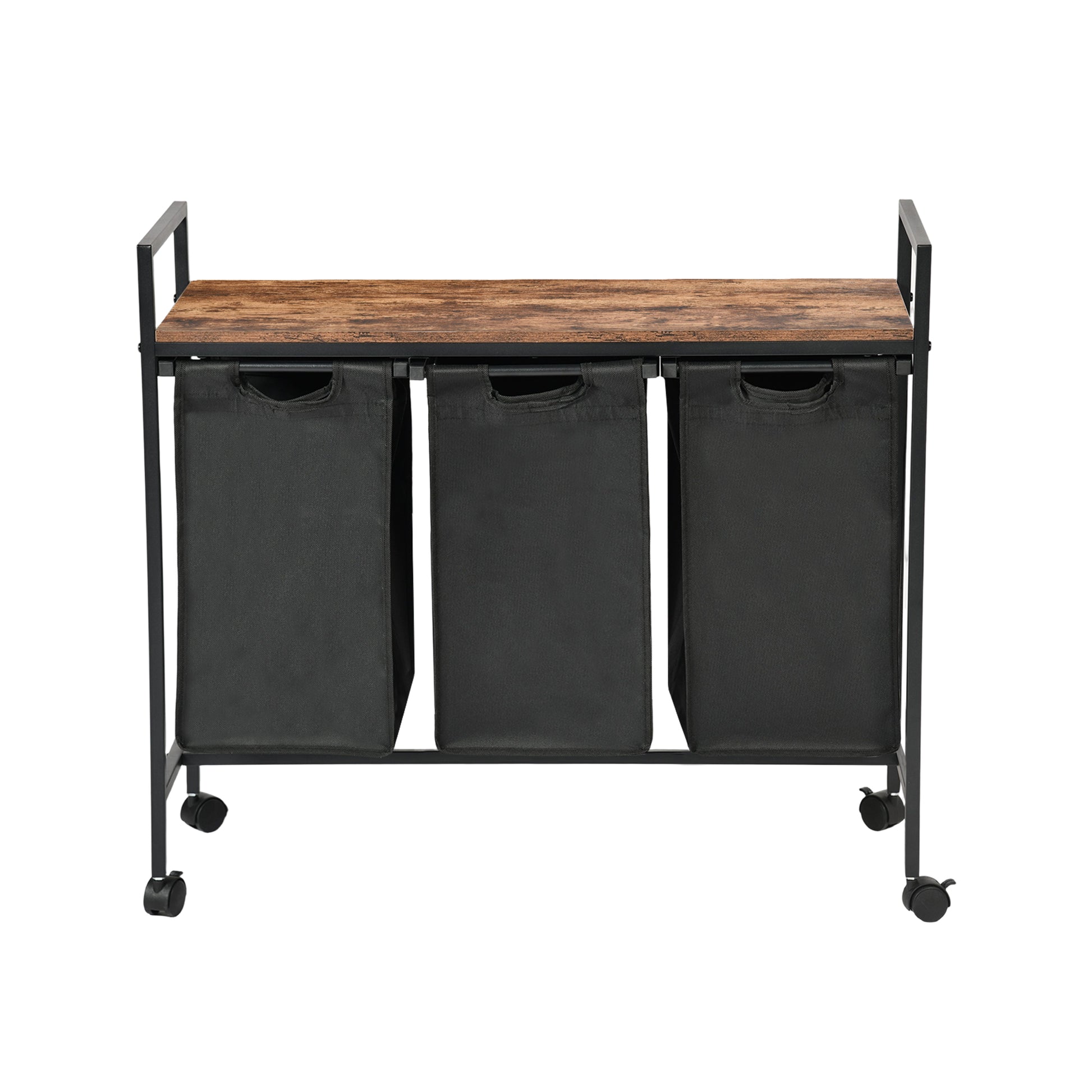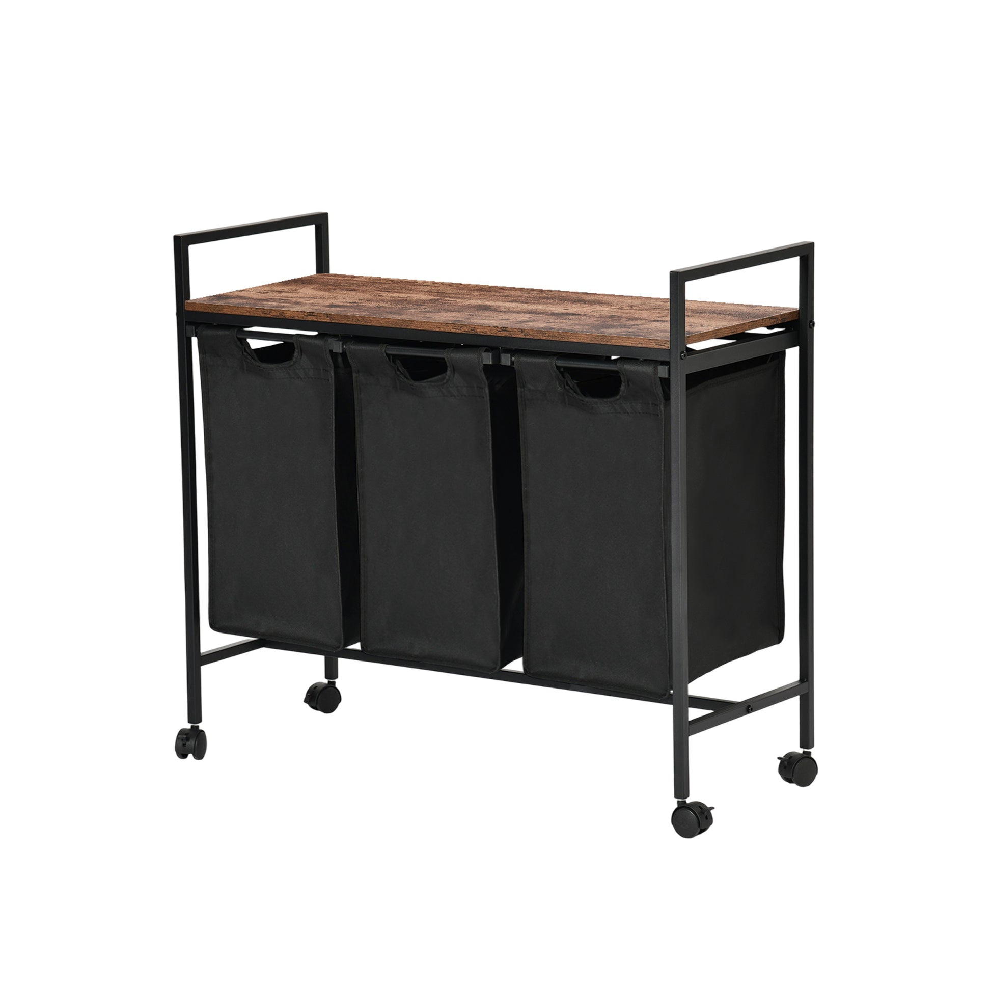Rolling laundry sorter with 3 removable bags and a rustic wood top. Locking casters move and park with ease while a steel frame keeps loads steady.