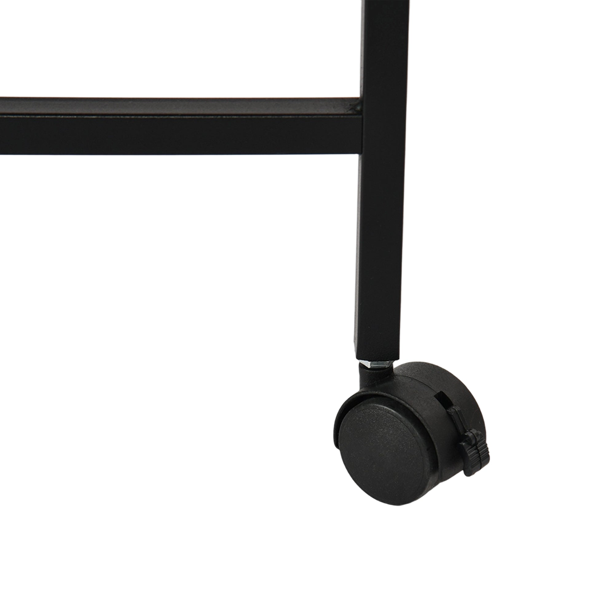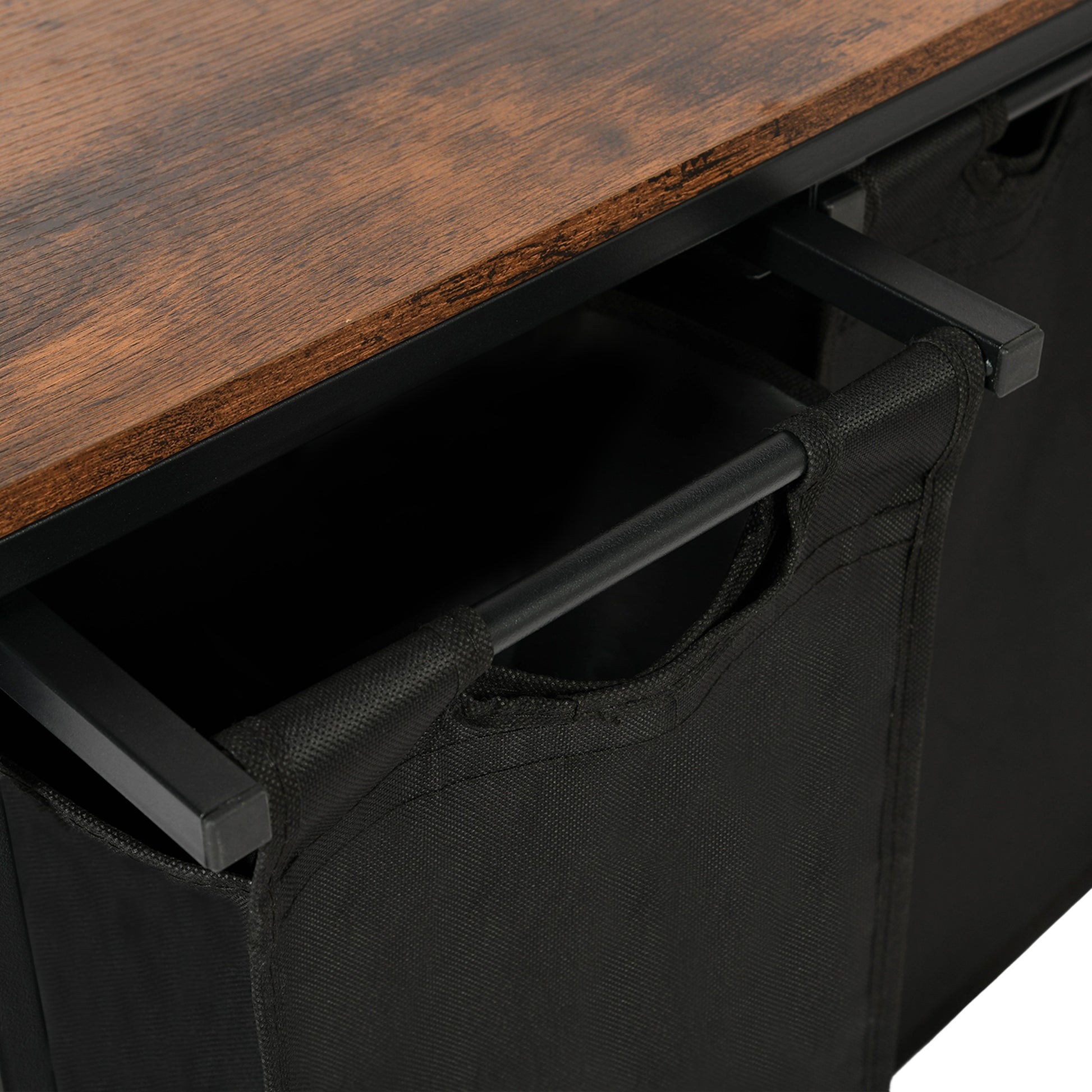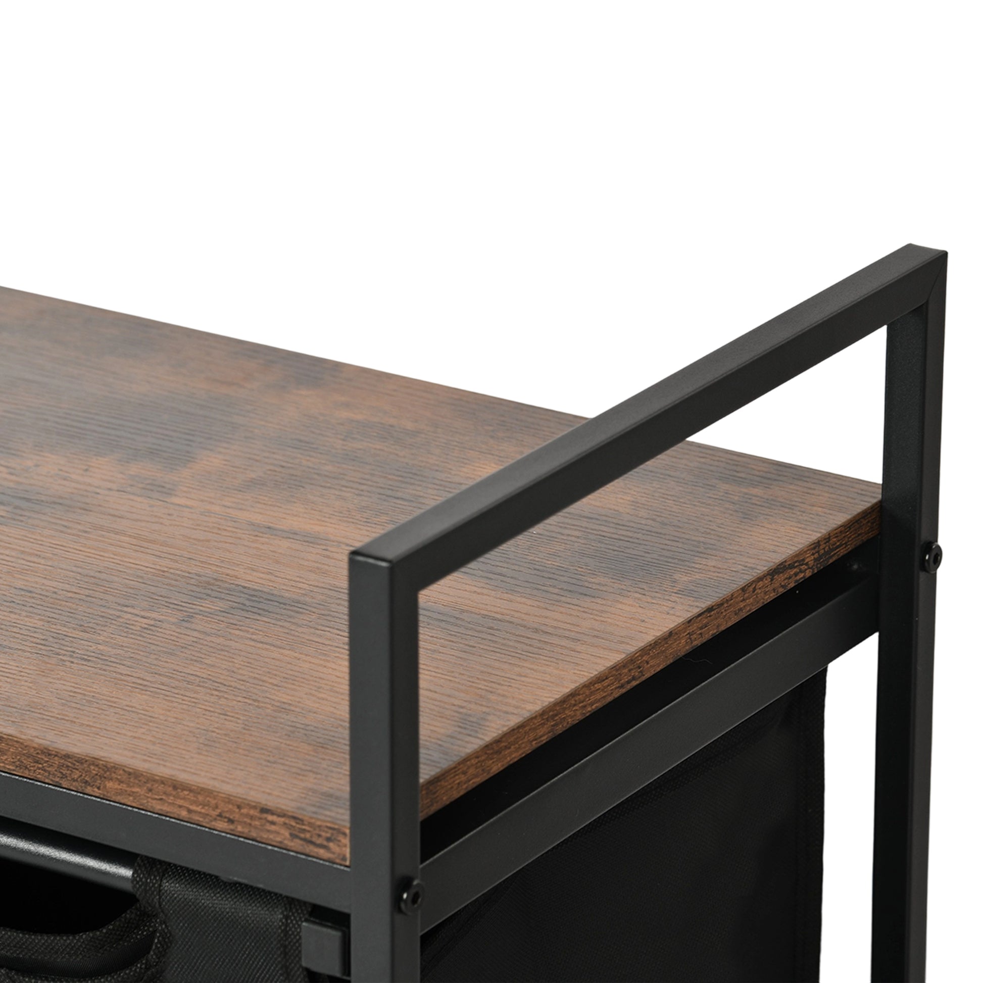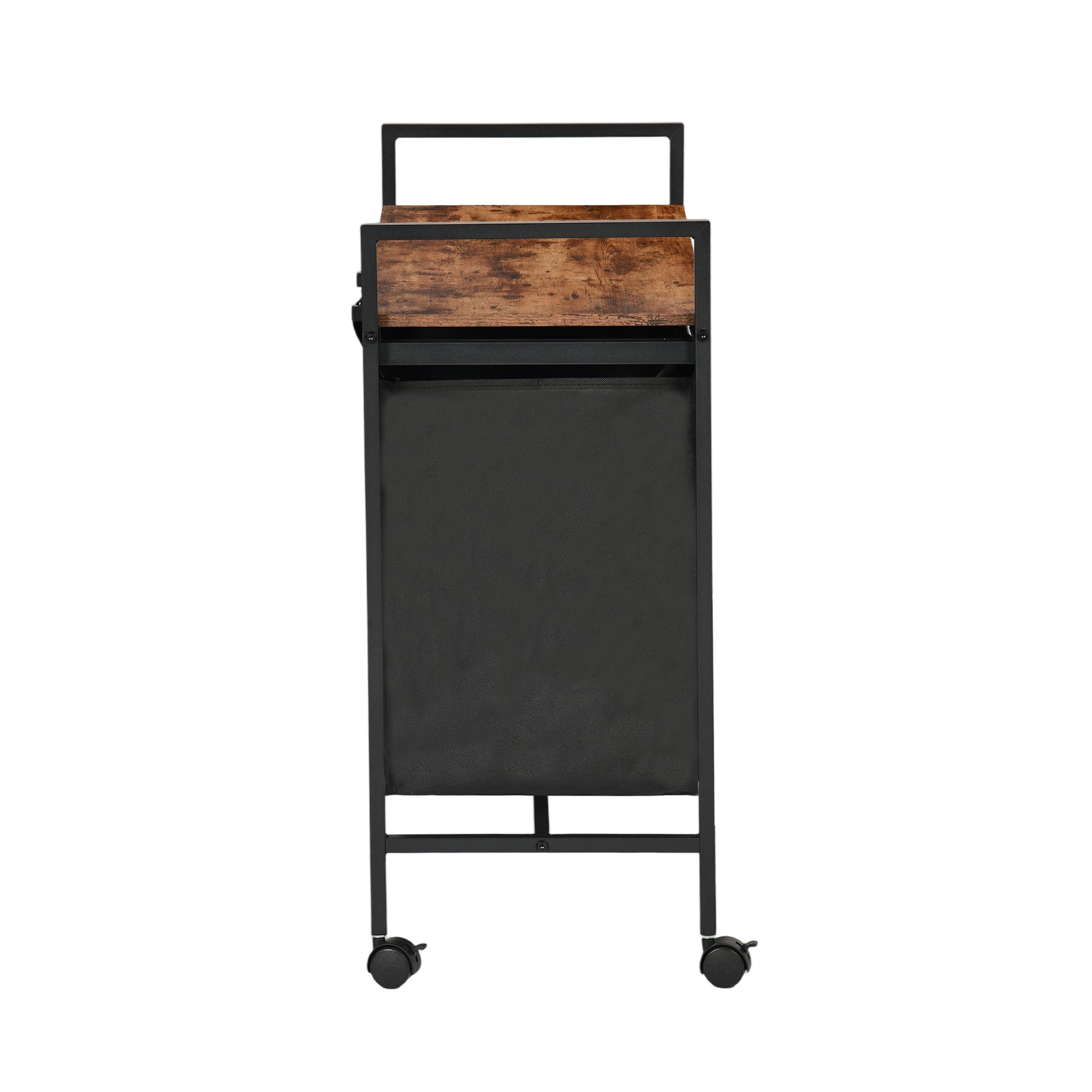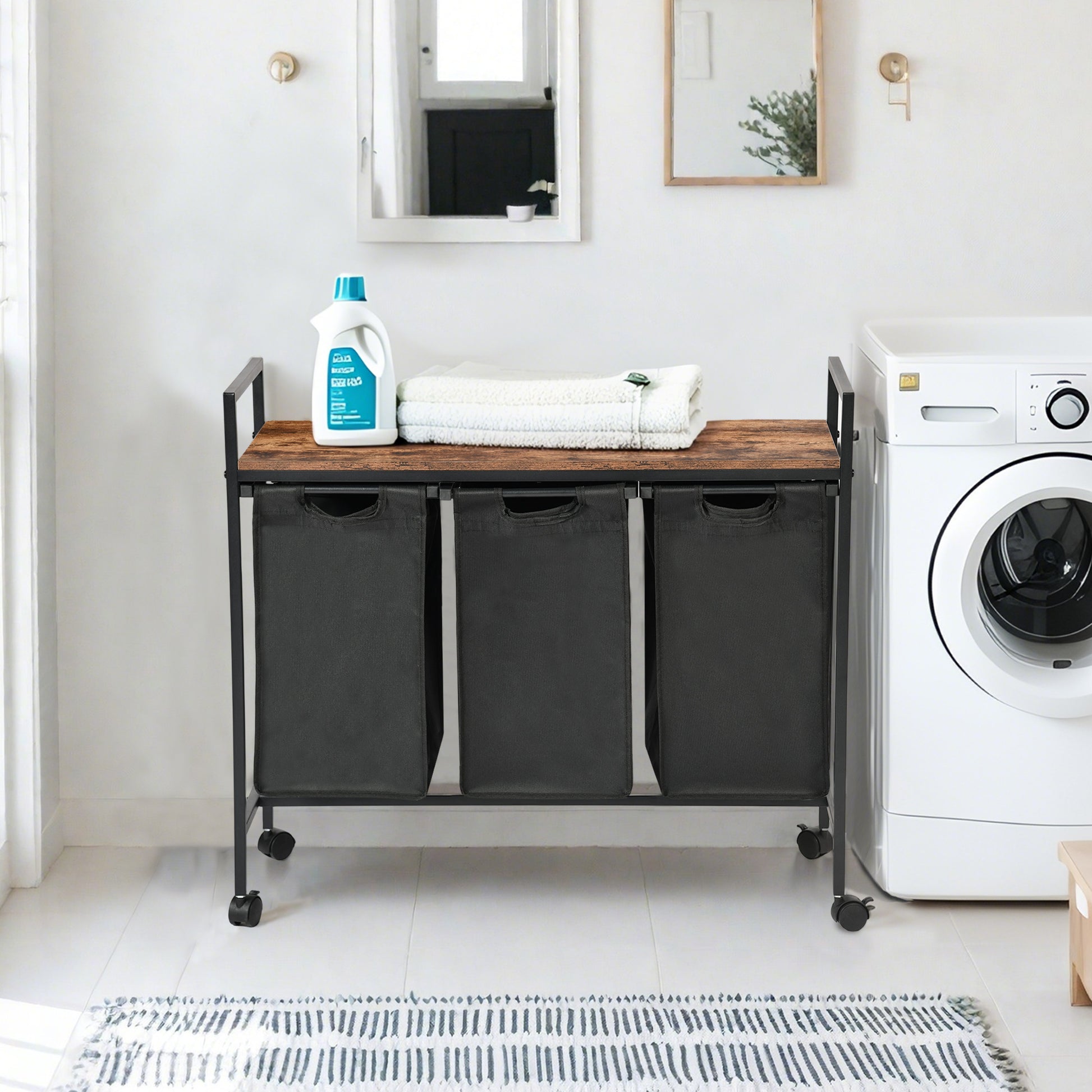 Rolling laundry sorter with 3 removable bags and a rustic wood top. Locking casters move and park with ease while a steel frame keeps loads steady.