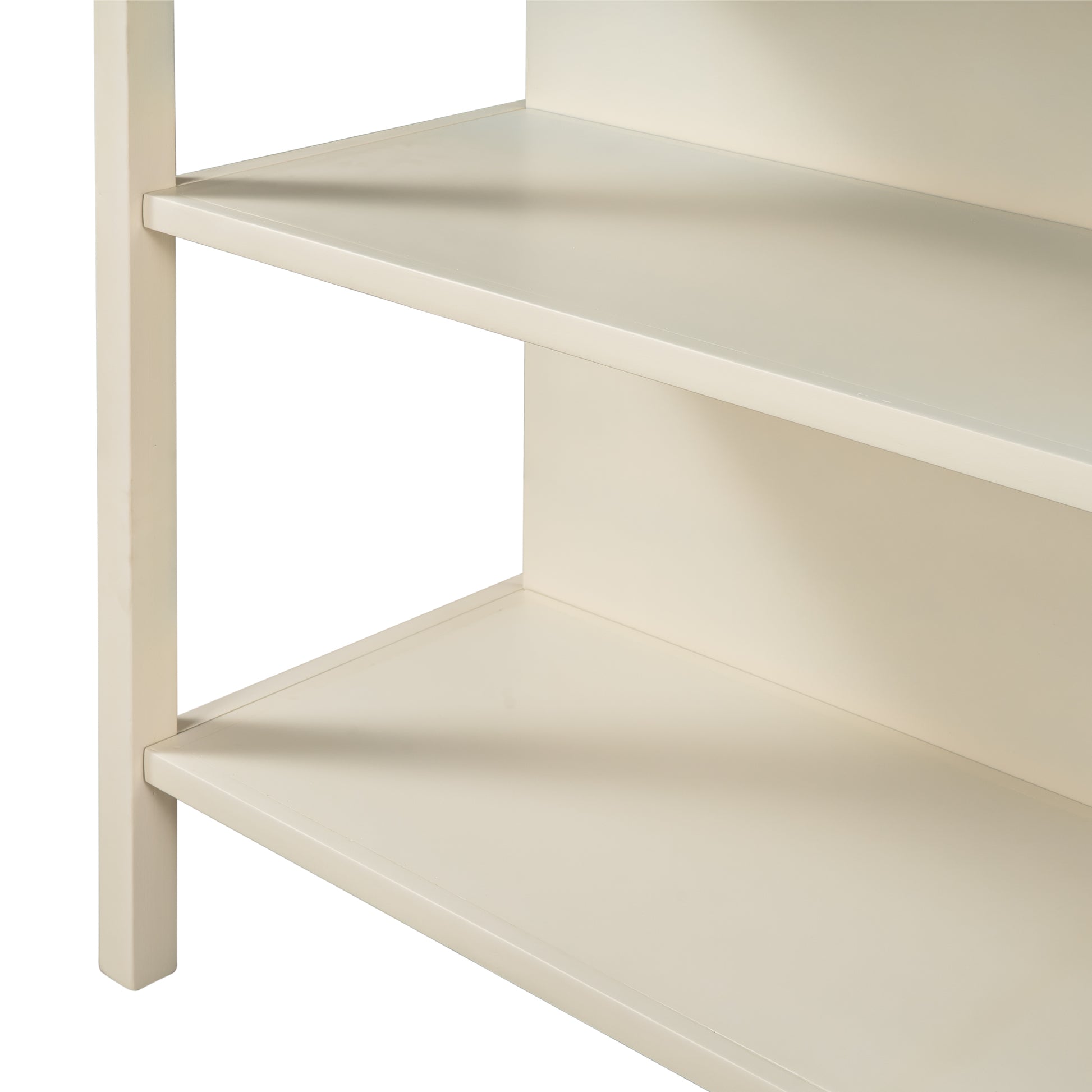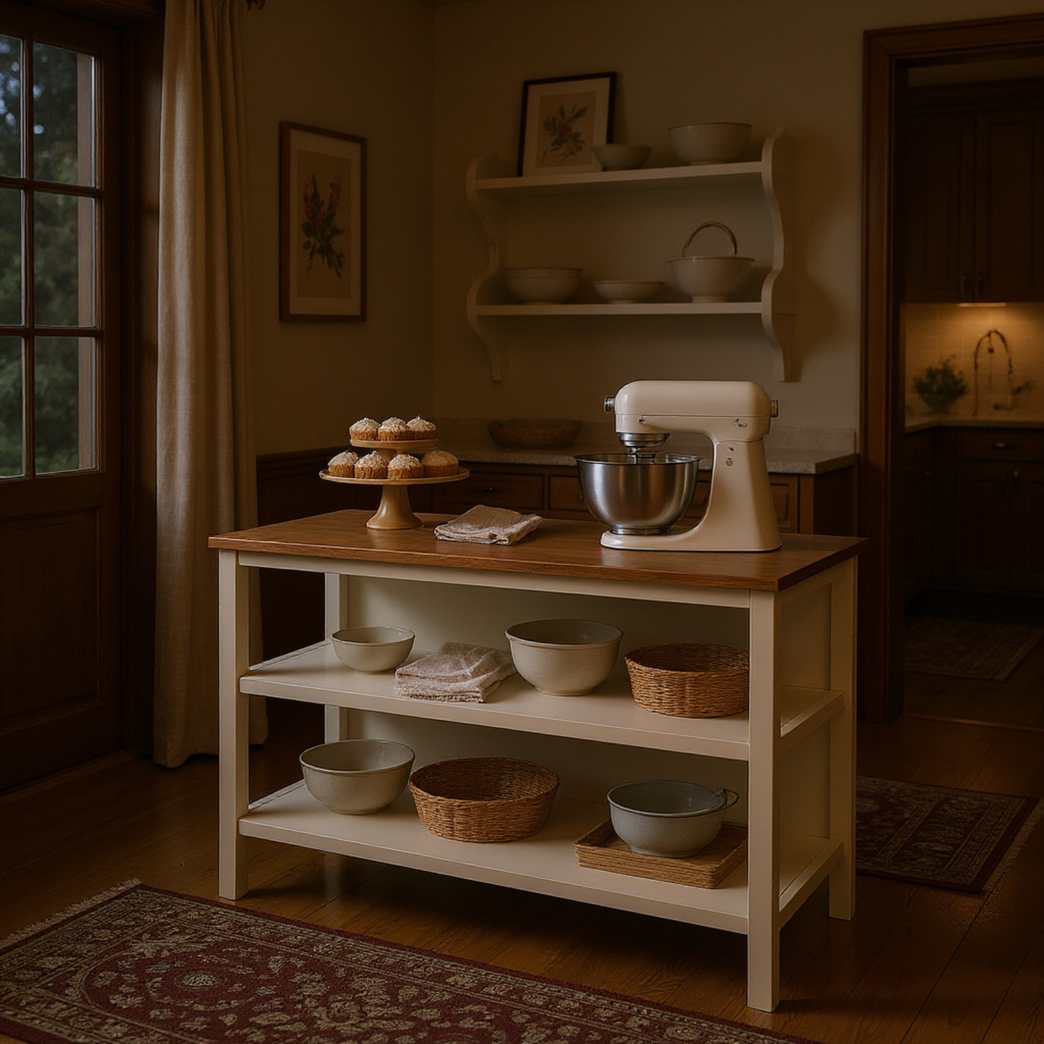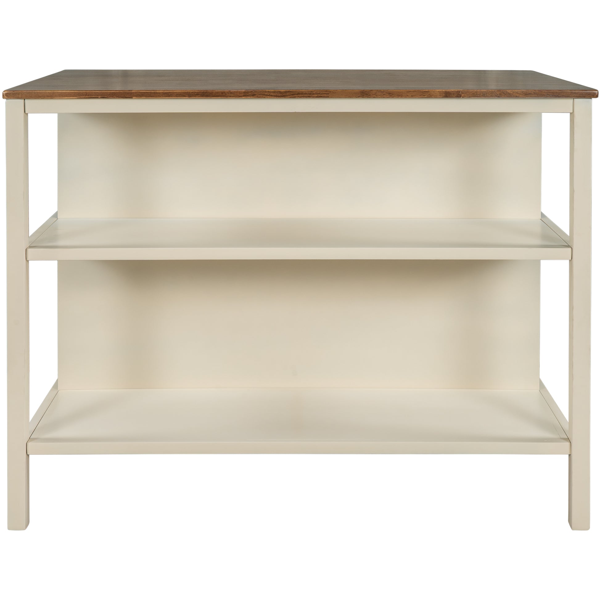 45 inch solid rubberwood kitchen island with walnut butcher block top and two open shelves. Cream base suits farmhouse kitchens. Compact prep and dining surface for small spaces.
