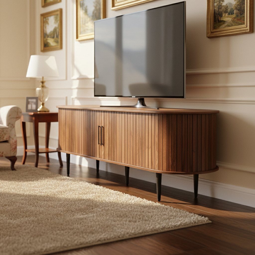 The Valletta Sliding Door TV Stand Media Console features a mid-century modern silhouette, fluted sliding doors, and a warm walnut finish, offering versatile storage and stylish functionality for living rooms, bedrooms, or offices.