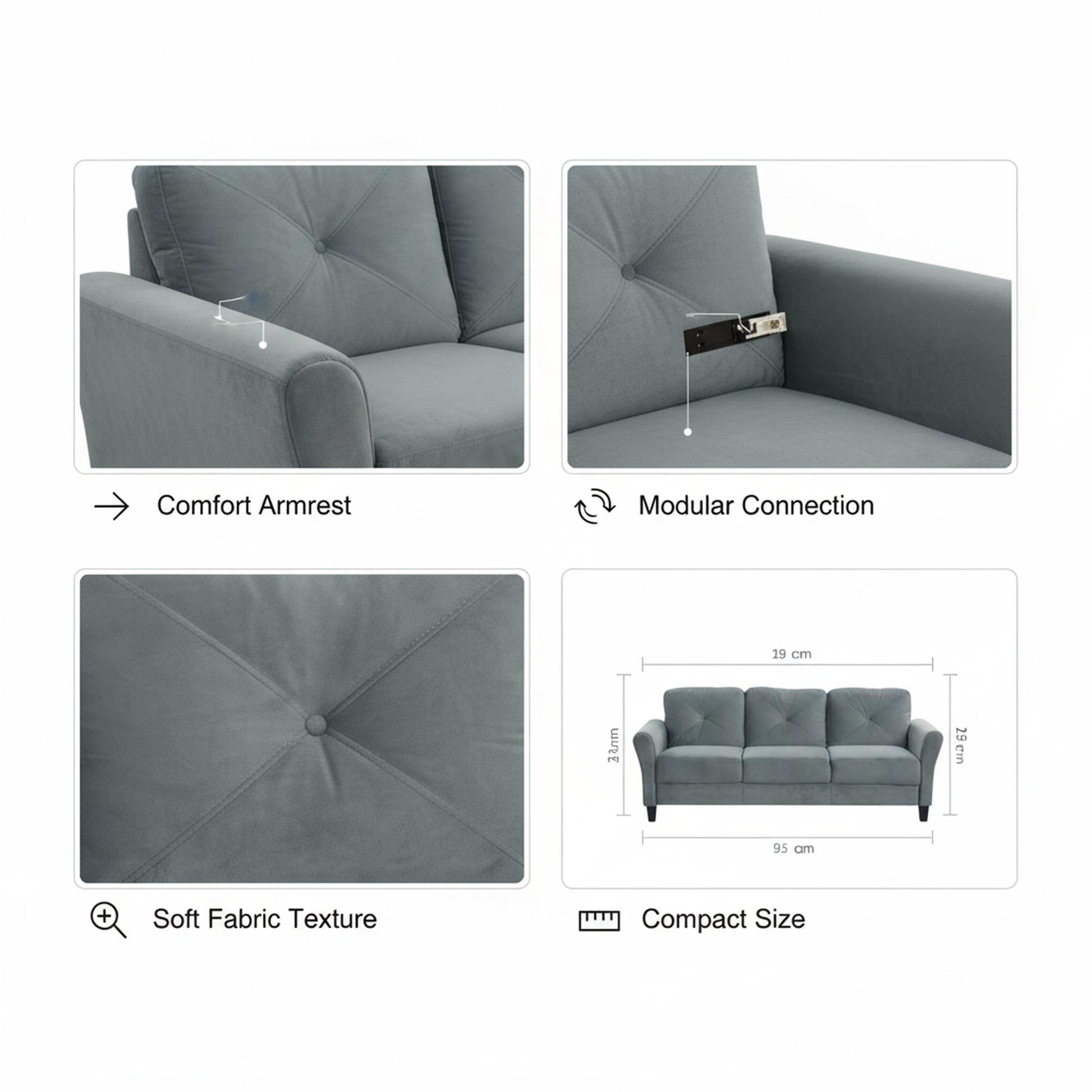1-Pack Gray Sectional Sofa, Modern Space-Saving Furniture, Velvet Upholstery with Thick Cushions, Modular Detachable Design for Living Room, Bedroom, Office, Easy Assembly, Durable and Comfortable Seating