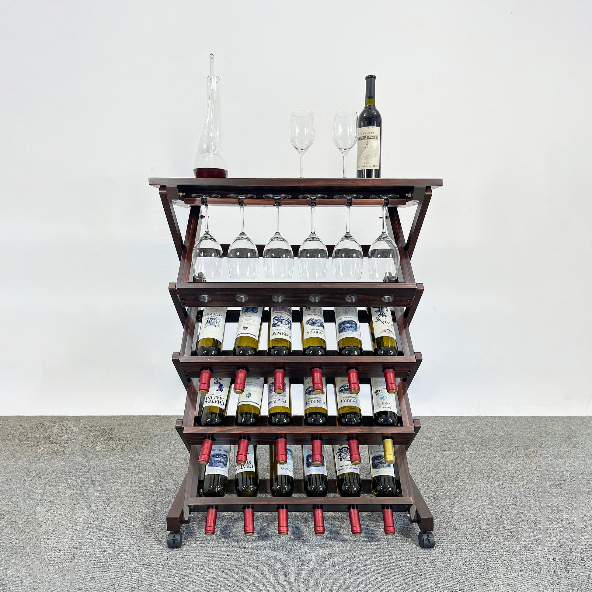 Walnut pine wine rack with bar top, stemware holder, and angled shelves. Freestanding storage for up to 26 bottles or 18 bottles plus 6 glasses on smooth casters.