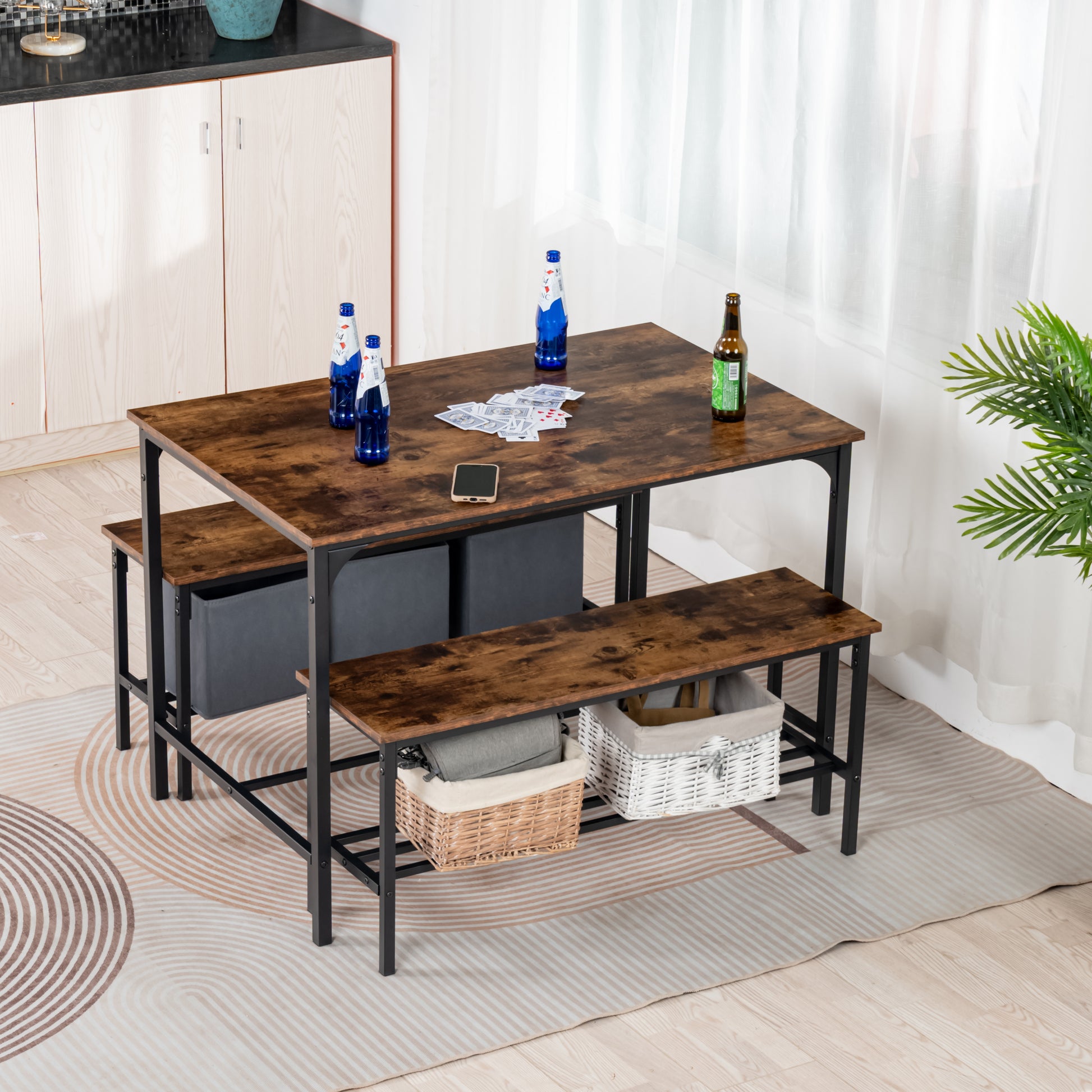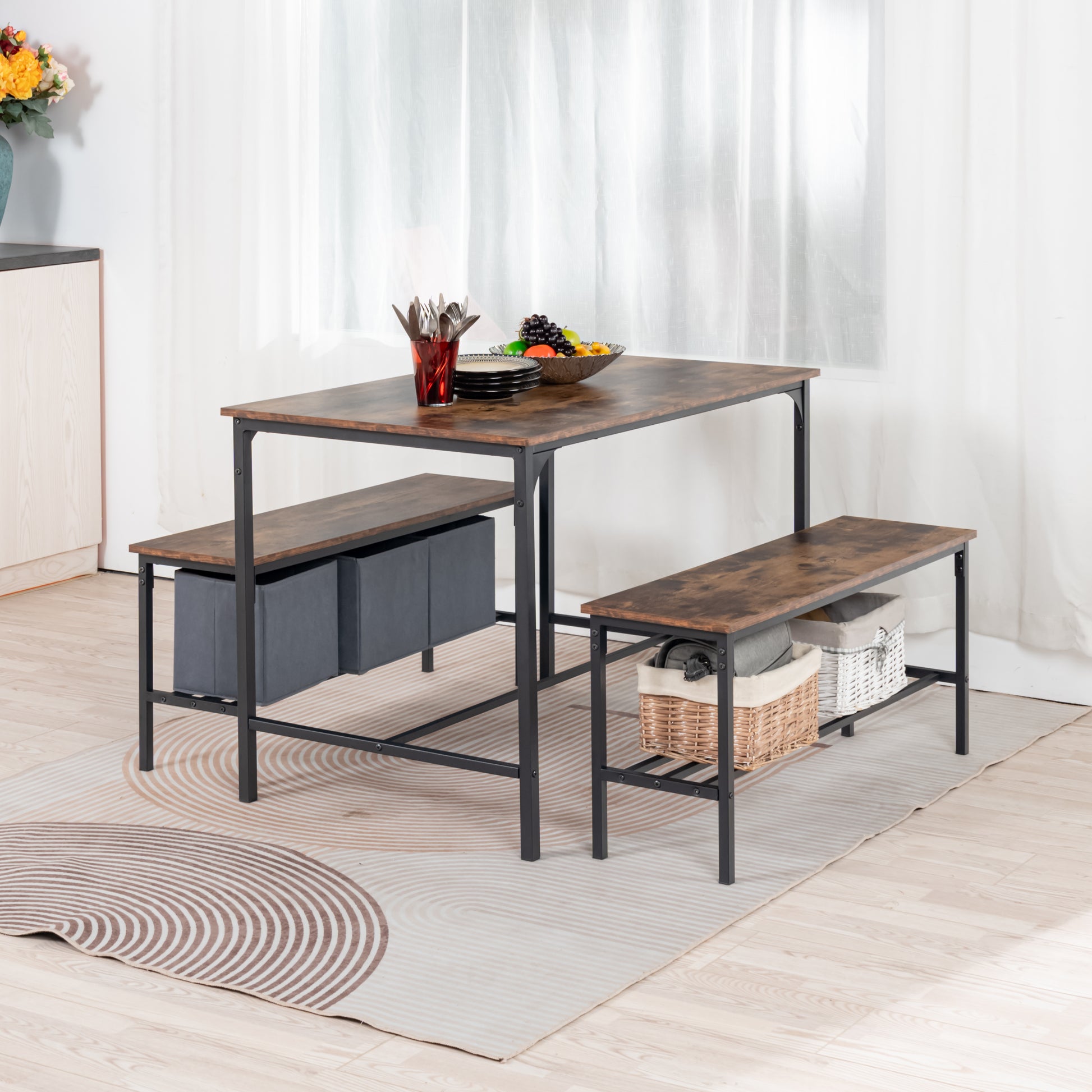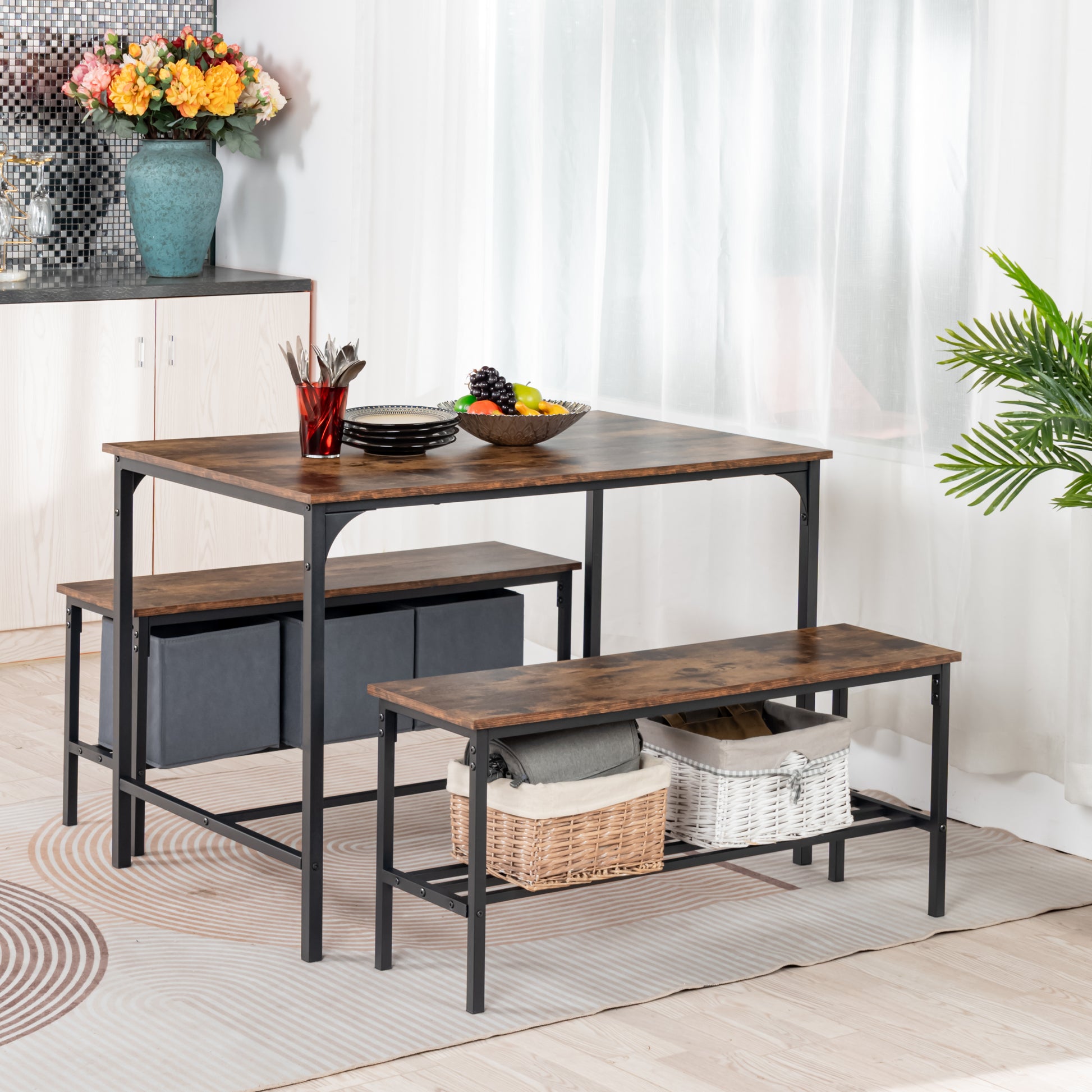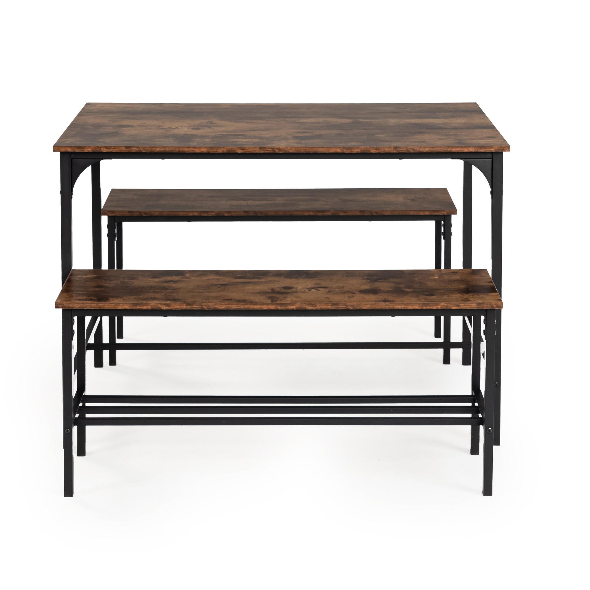 3 piece dining set with table and two benches. Rustic wood look tops and steel frames. Benches slide under the table to save space and seat four comfortably.