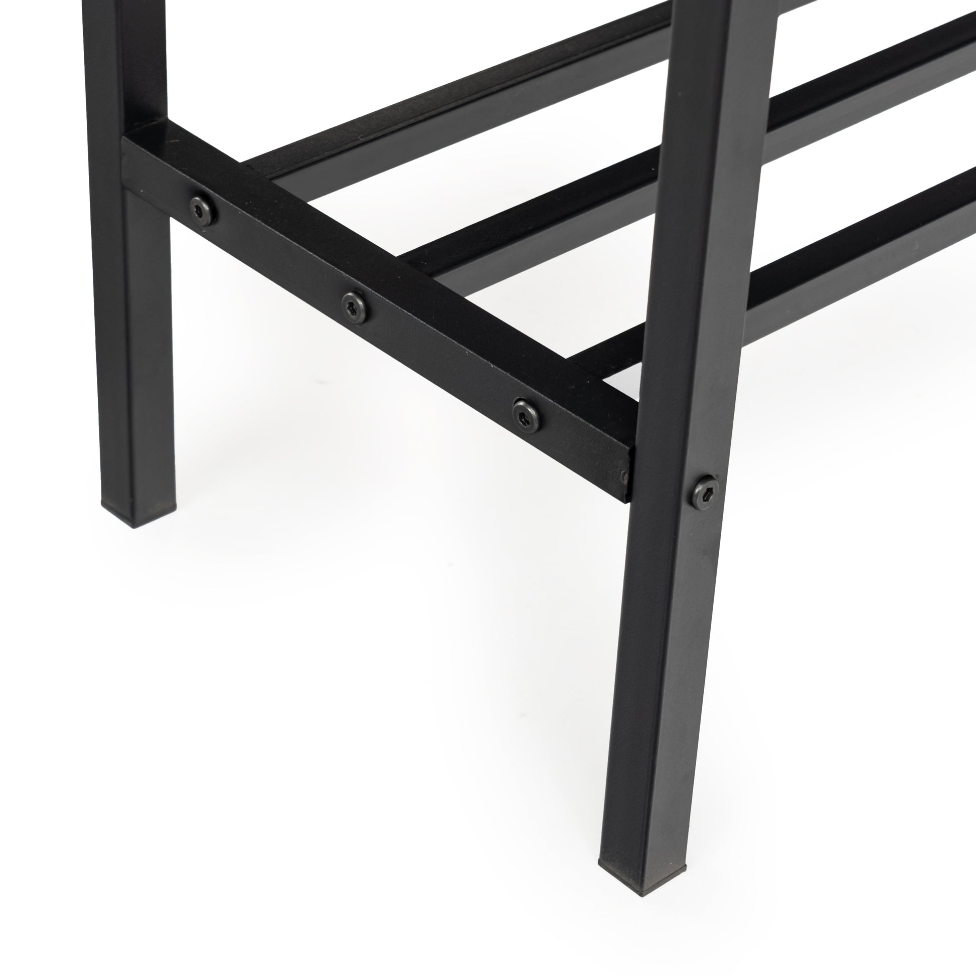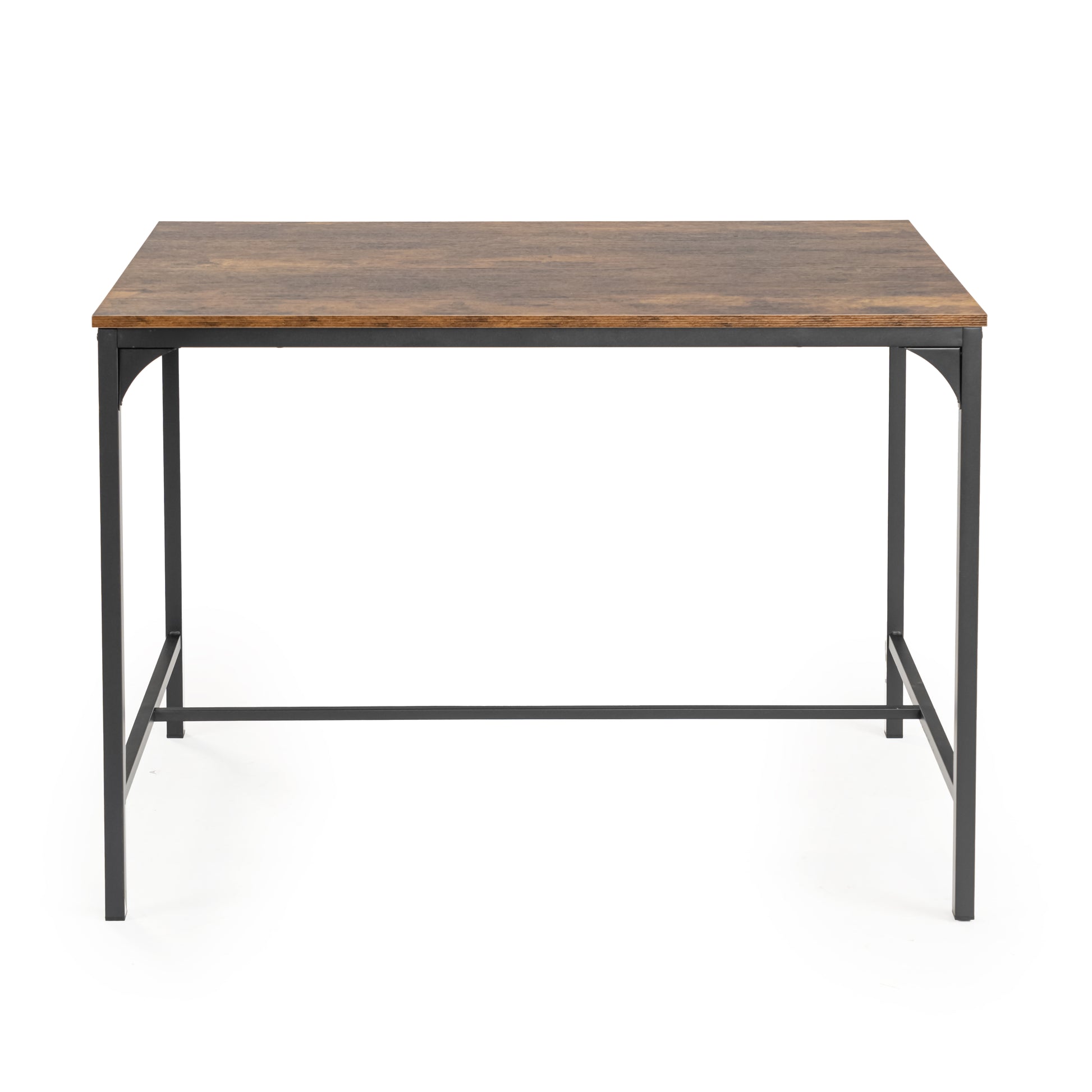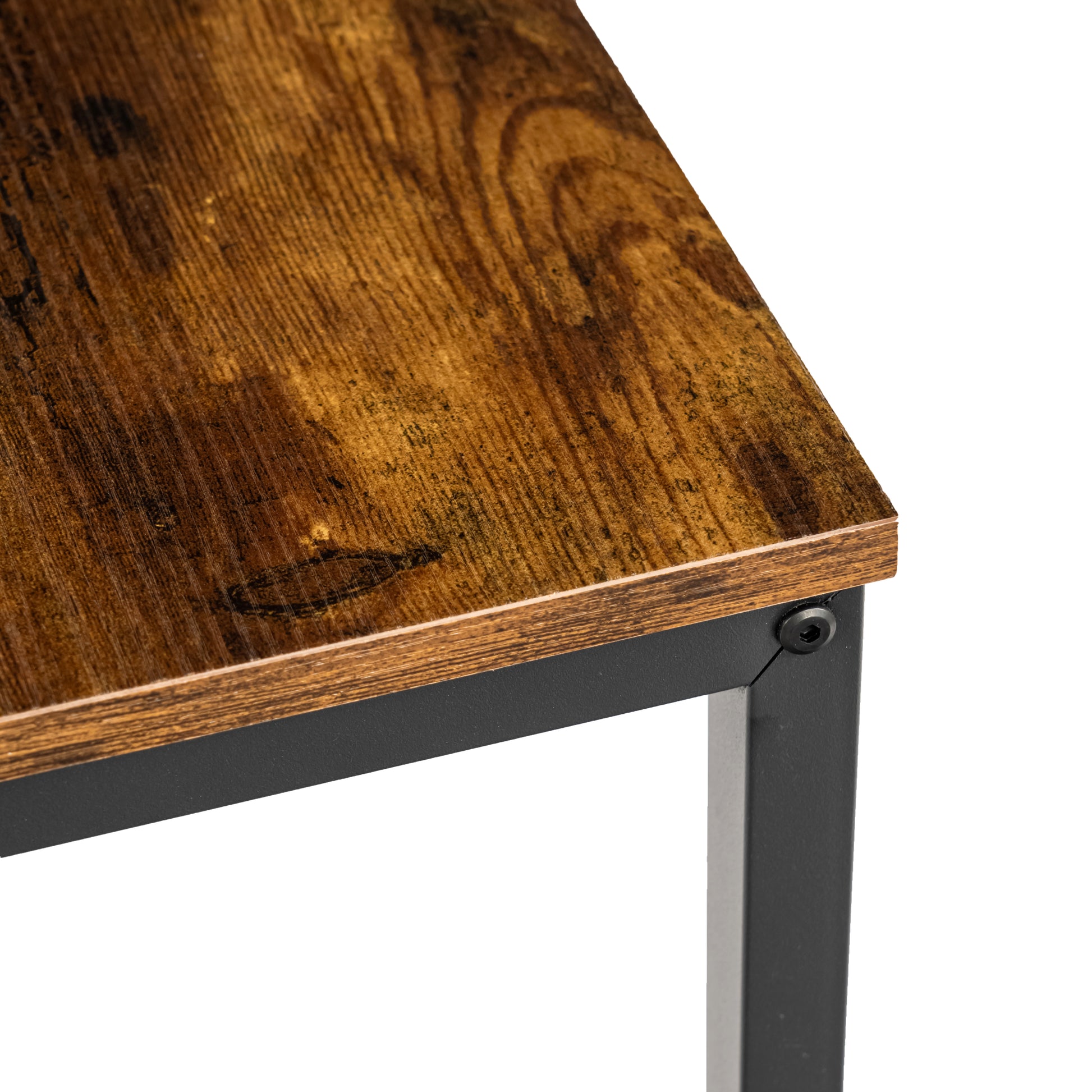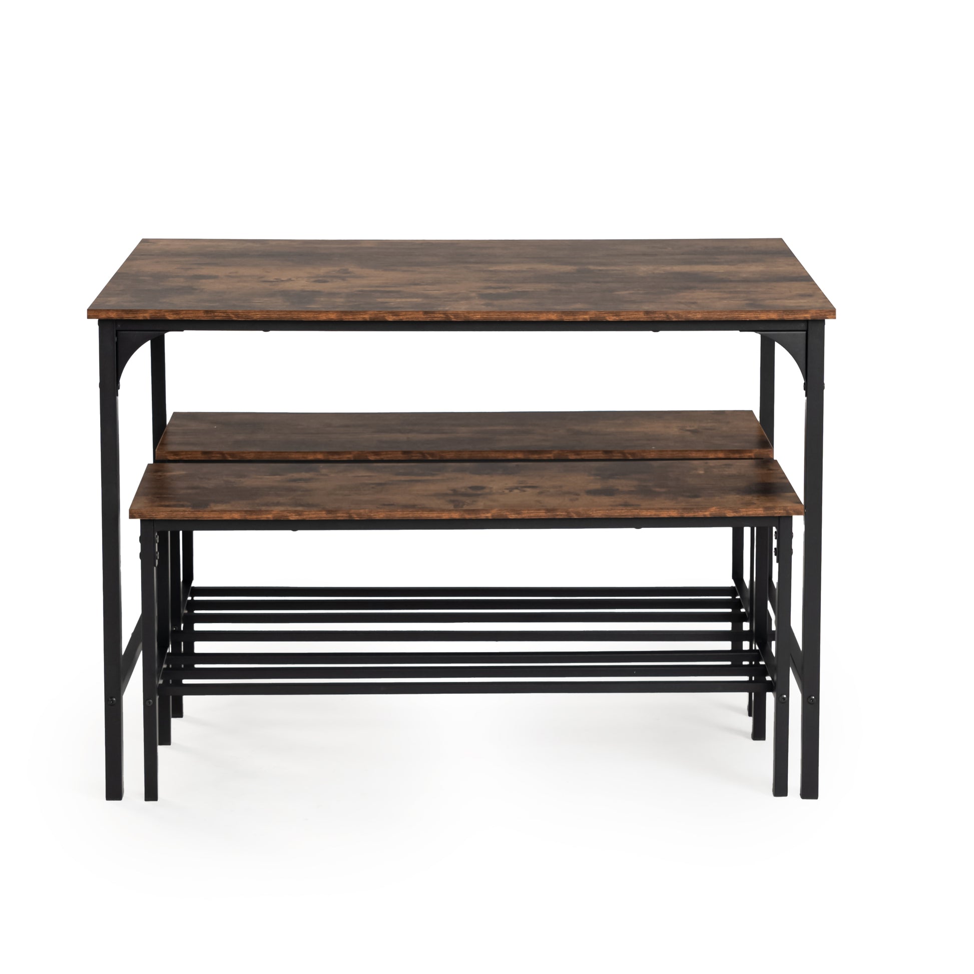 3 piece dining set with table and two benches. Rustic wood look tops and steel frames. Benches slide under the table to save space and seat four comfortably.