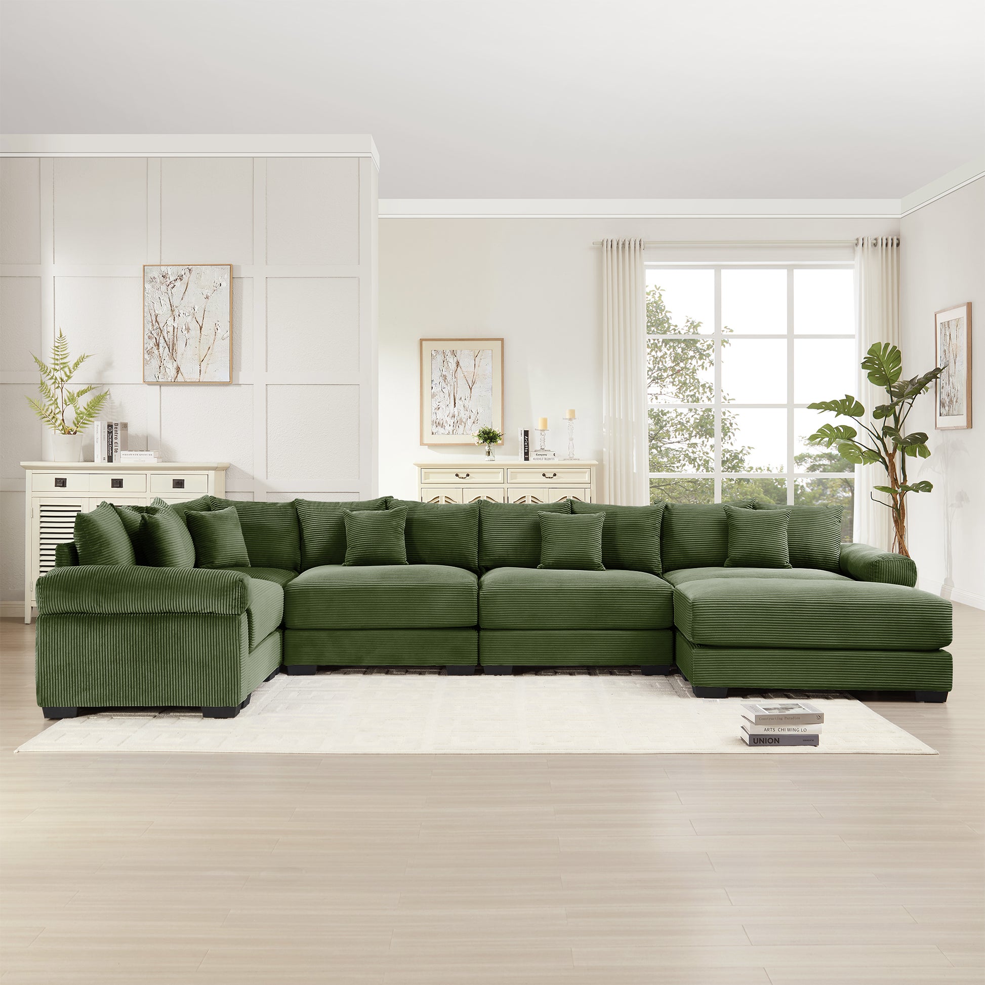Albany 155 inch modular corduroy oversized U shaped sectional sofa with ottoman features deep seating soft cushions and flexible layout design creating a cozy cloud like lounging experience for modern living rooms and family spaces.