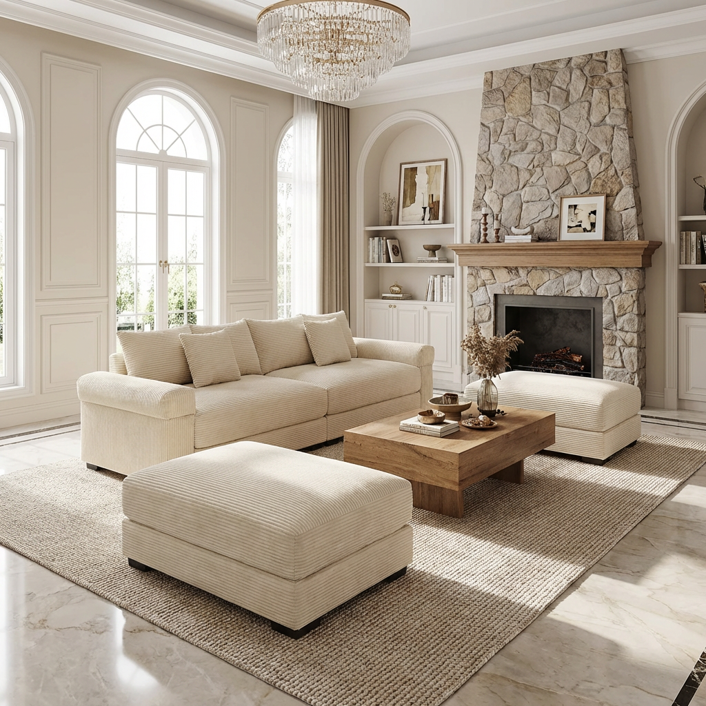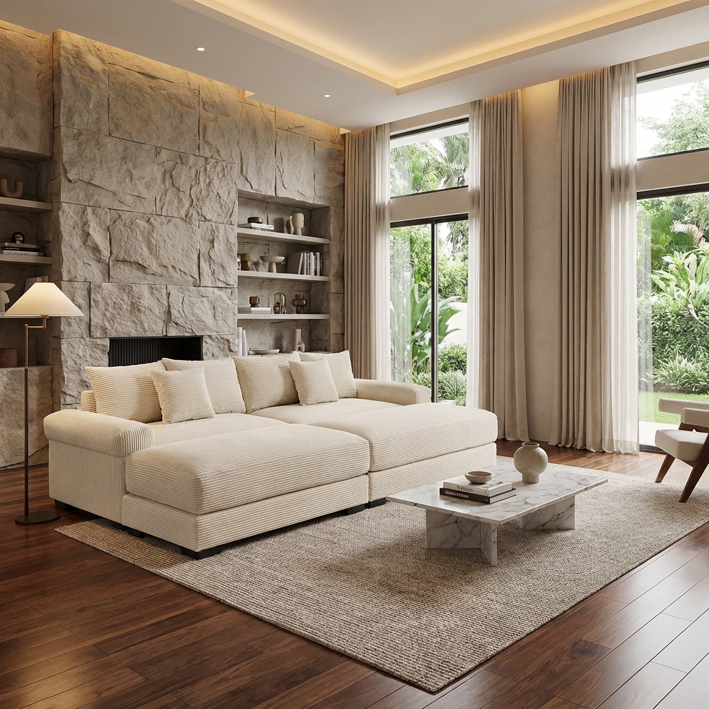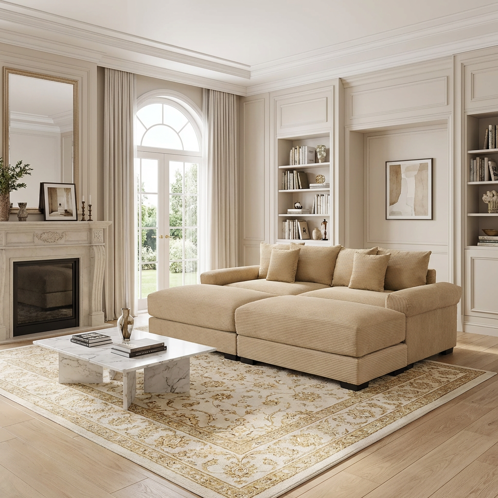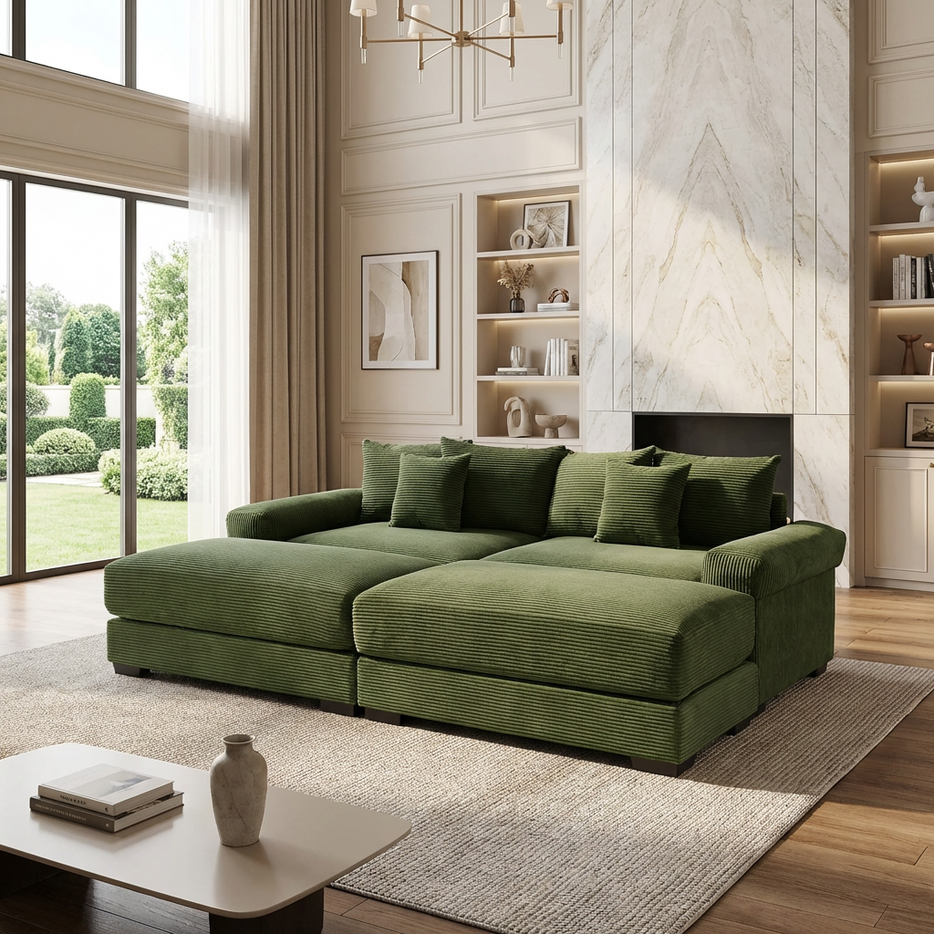 This oversized Albany modular corduroy sofa features deep seating, extra thick armrests, and flexible ottoman pieces, delivering cloud-like comfort and adaptable layouts for modern living rooms.