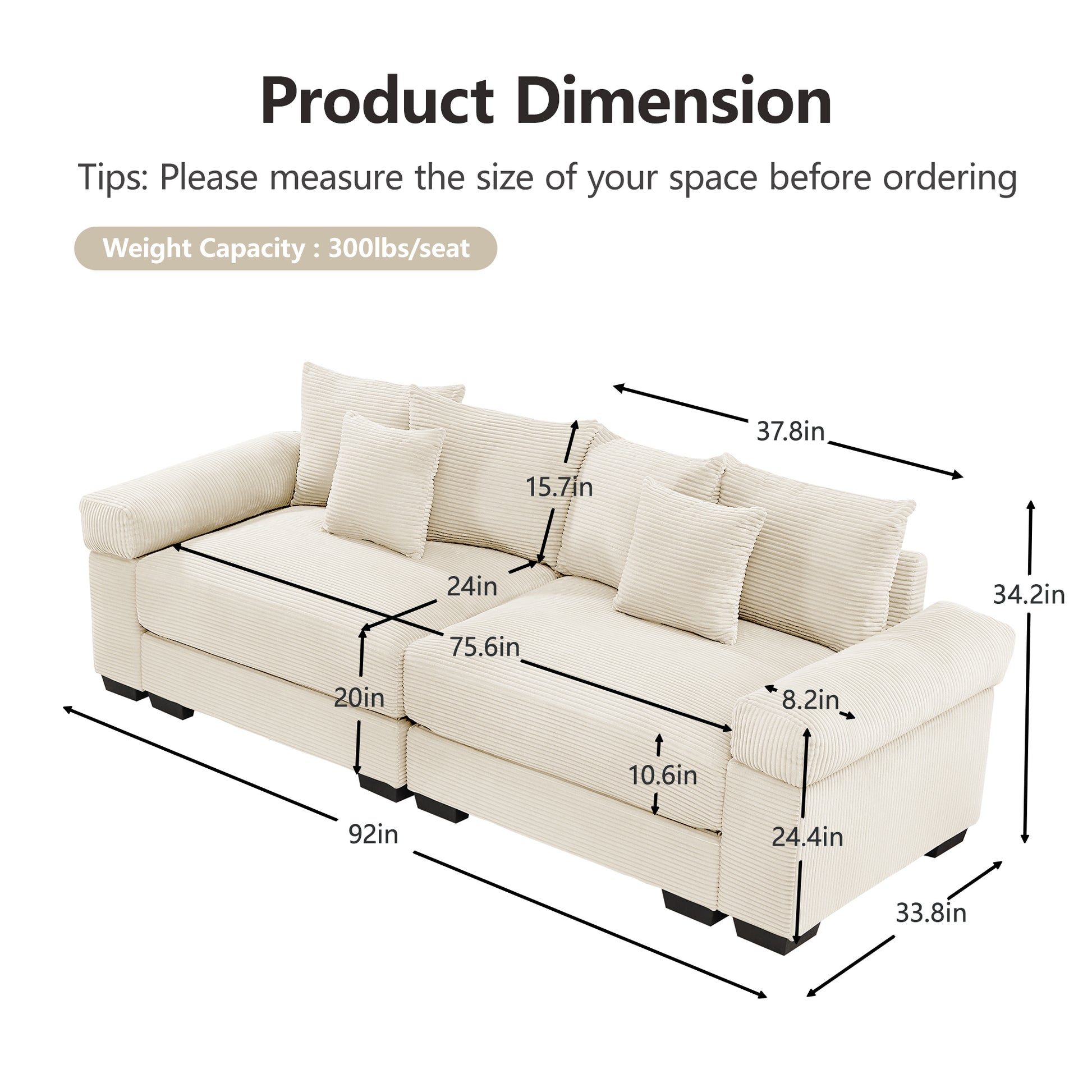 Albany 92" Modular Corduroy Cloud 3-Seater Sofa with Extra-Wide Armrests
