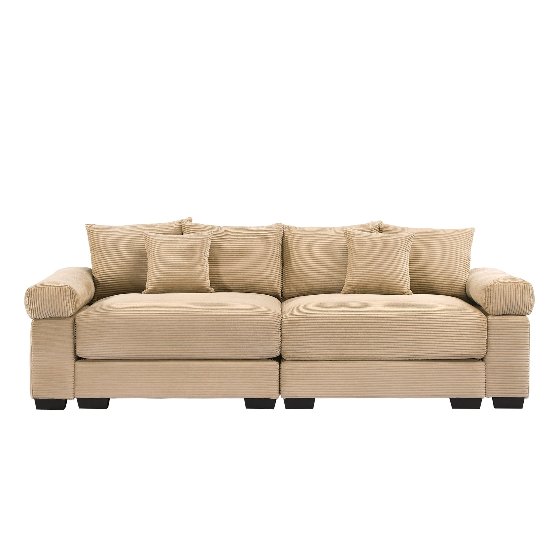 This 92 inch modular corduroy cloud sofa features extra wide armrests deep seating and plush cushions creating a relaxed lounging experience with flexible modular comfort for modern living spaces.