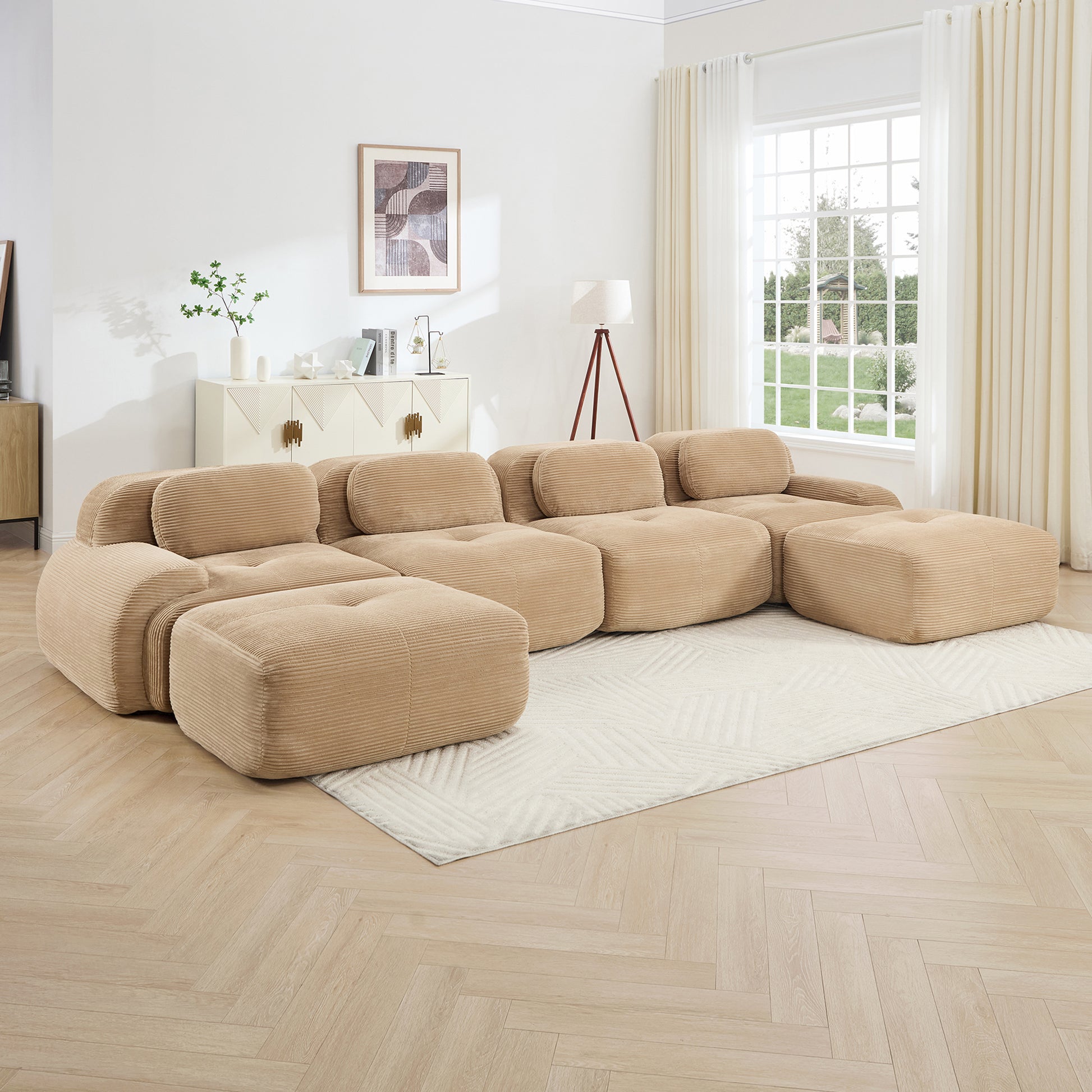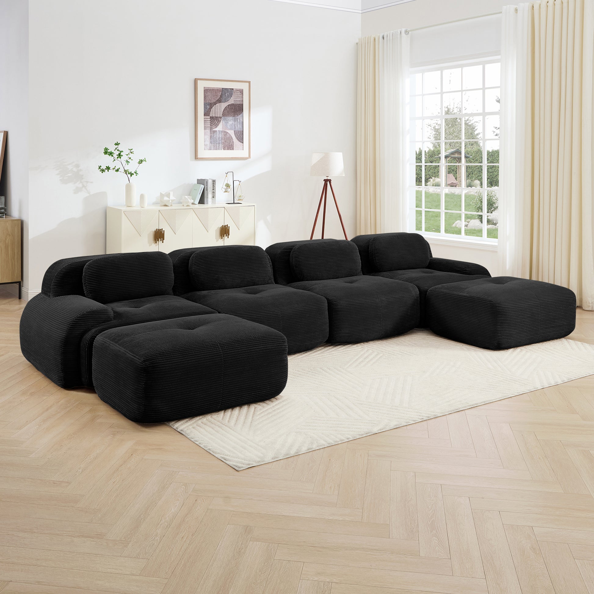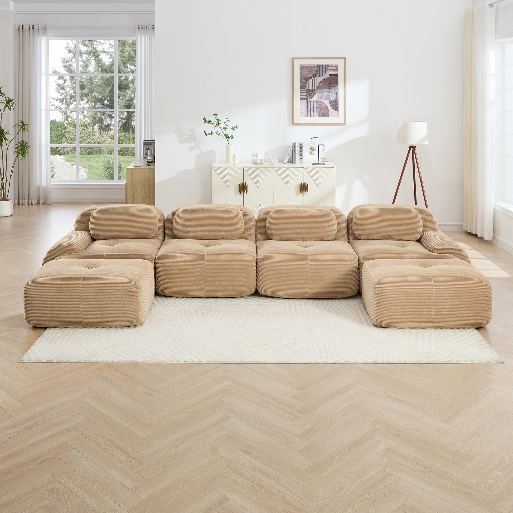 This 152 inch Anchorage modular corduroy U shaped sectional sofa features deep cushioned seating extra wide curved armrests and a plush cloud like structure offering immersive comfort and flexible layouts for large living spaces.