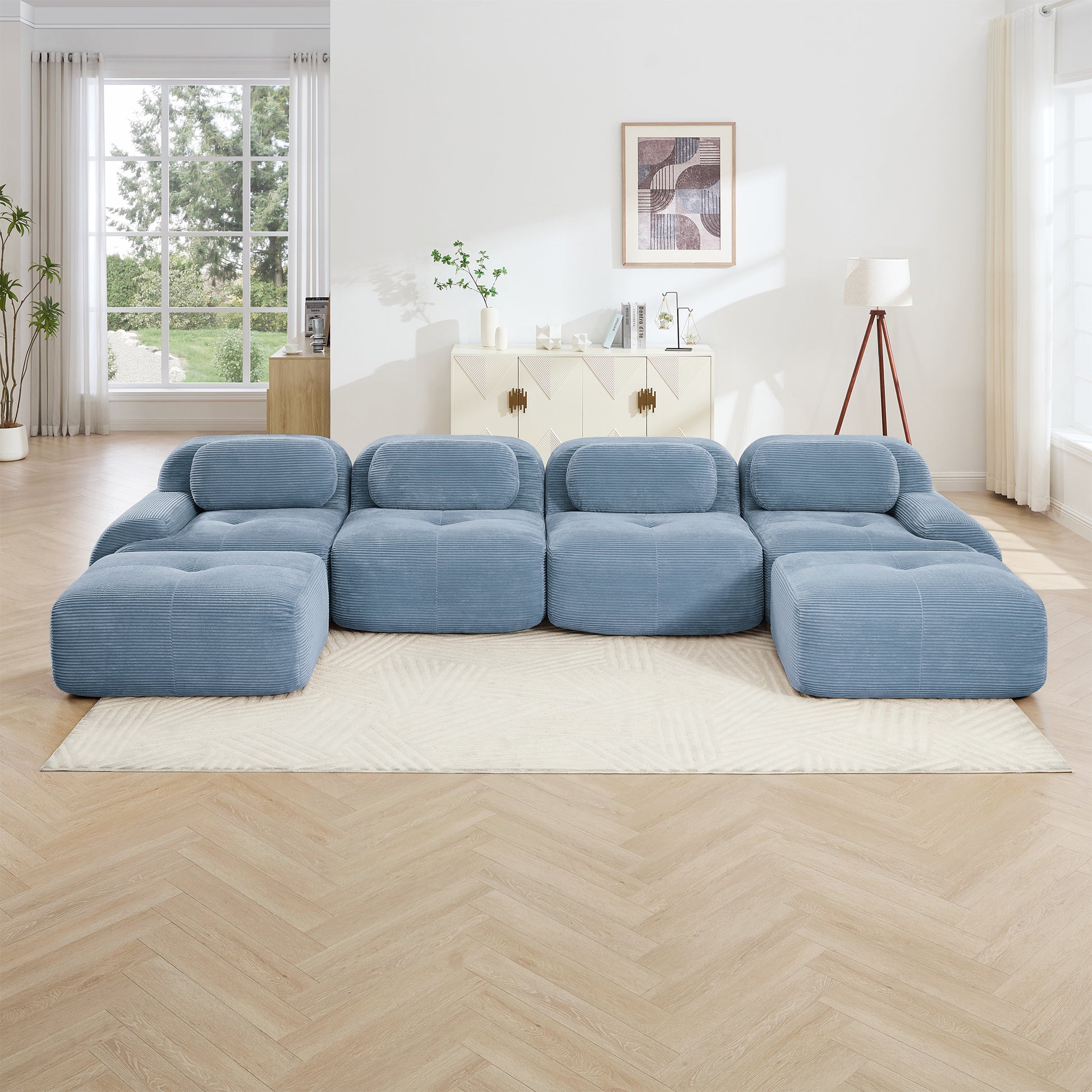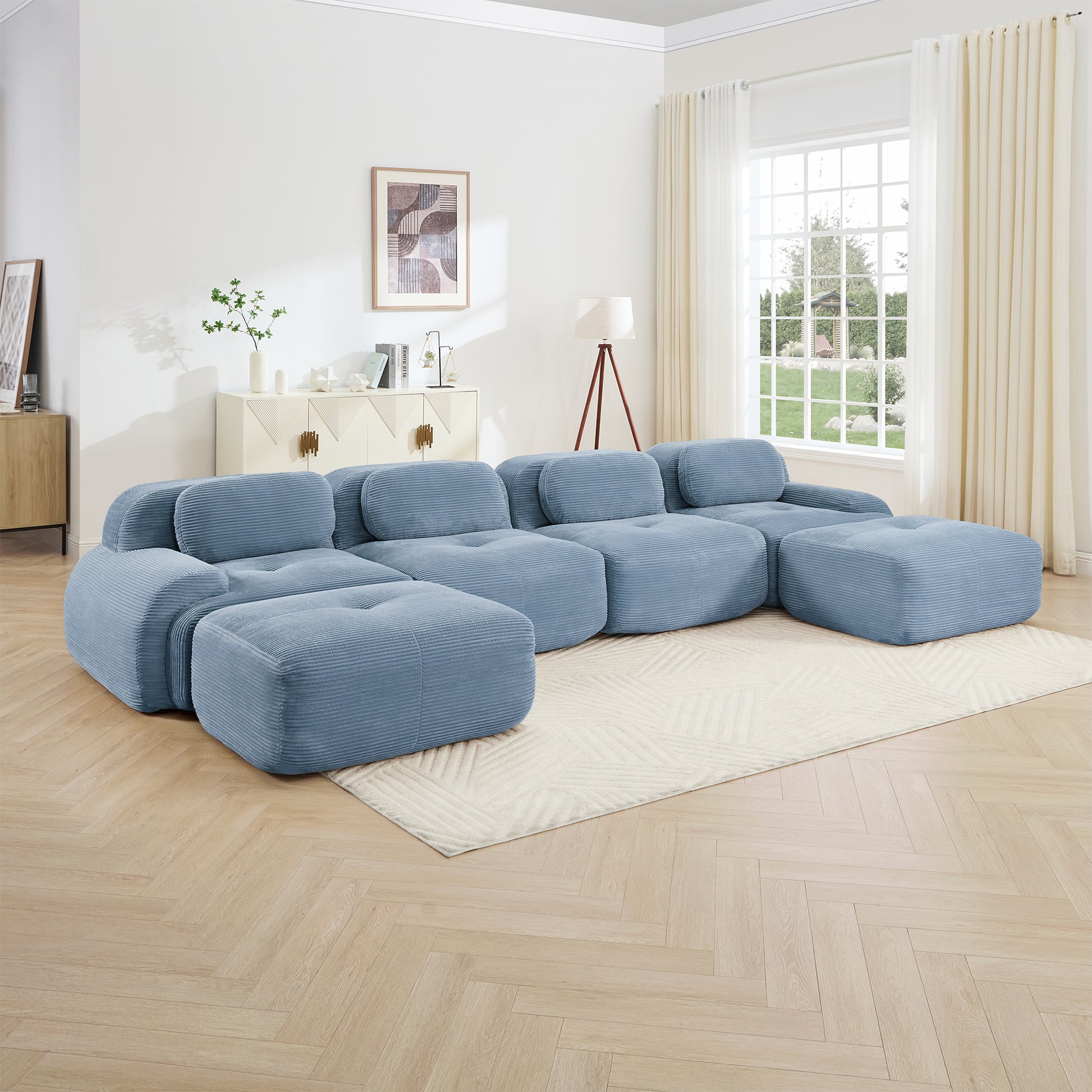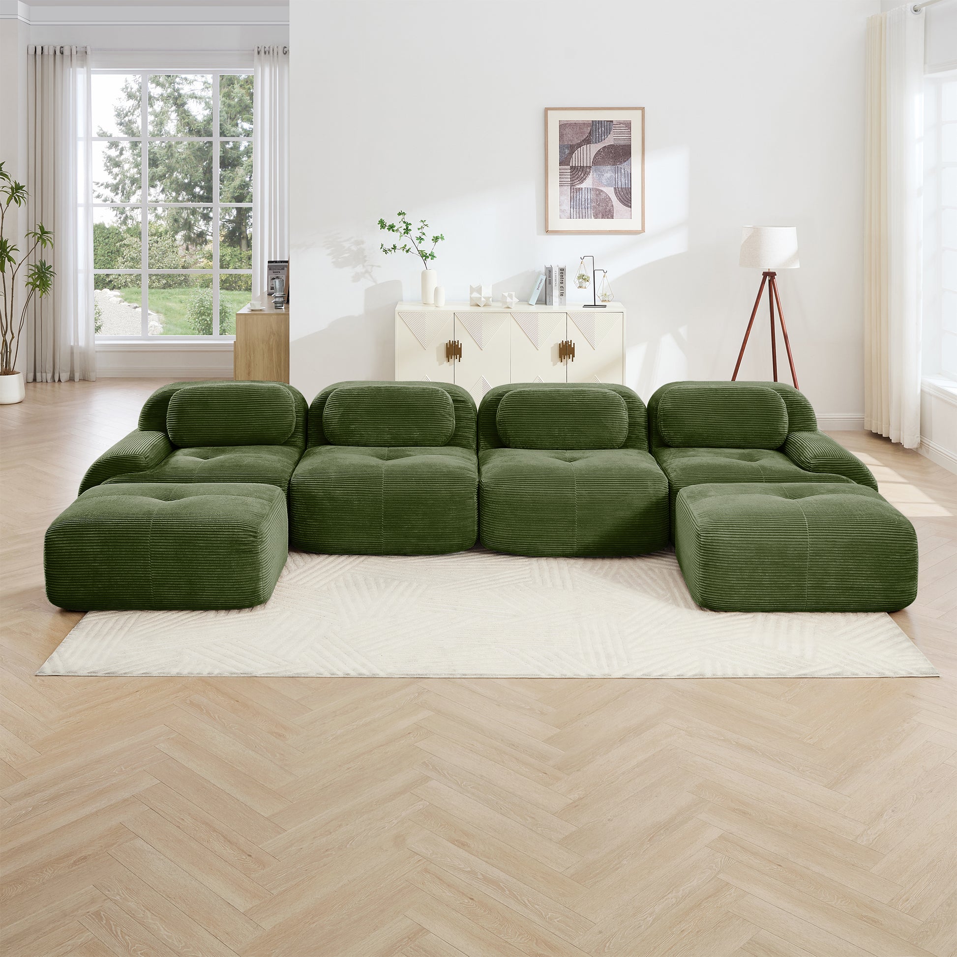 This 152 inch Anchorage modular corduroy U shaped sectional sofa features deep cushioned seating extra wide curved armrests and a plush cloud like structure offering immersive comfort and flexible layouts for large living spaces.