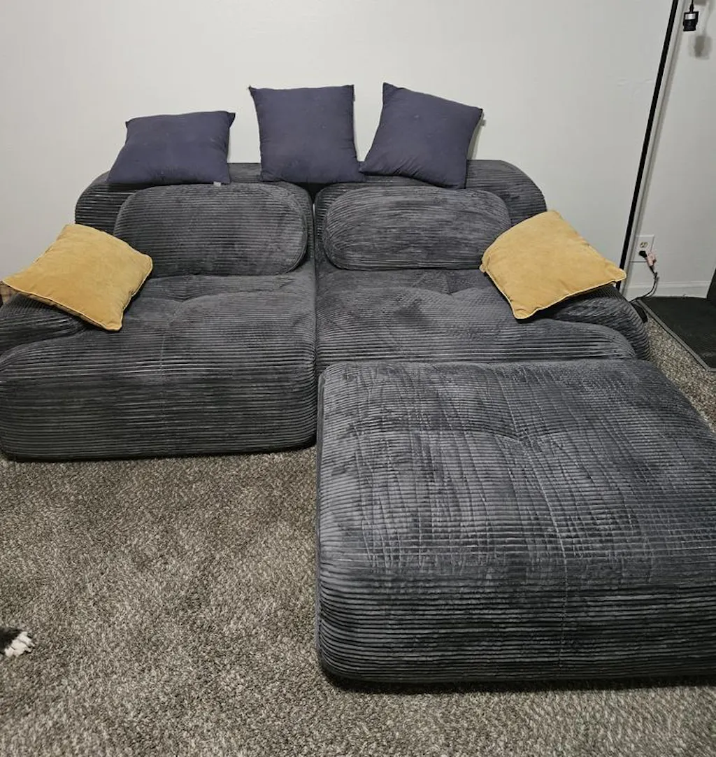 Anchorage 80 inch L shaped modular corduroy cloud sofa features plush ribbed fabric deep seating and curved armrests with an ottoman design that creates flexible comfort for modern living rooms apartments and lounging spaces.