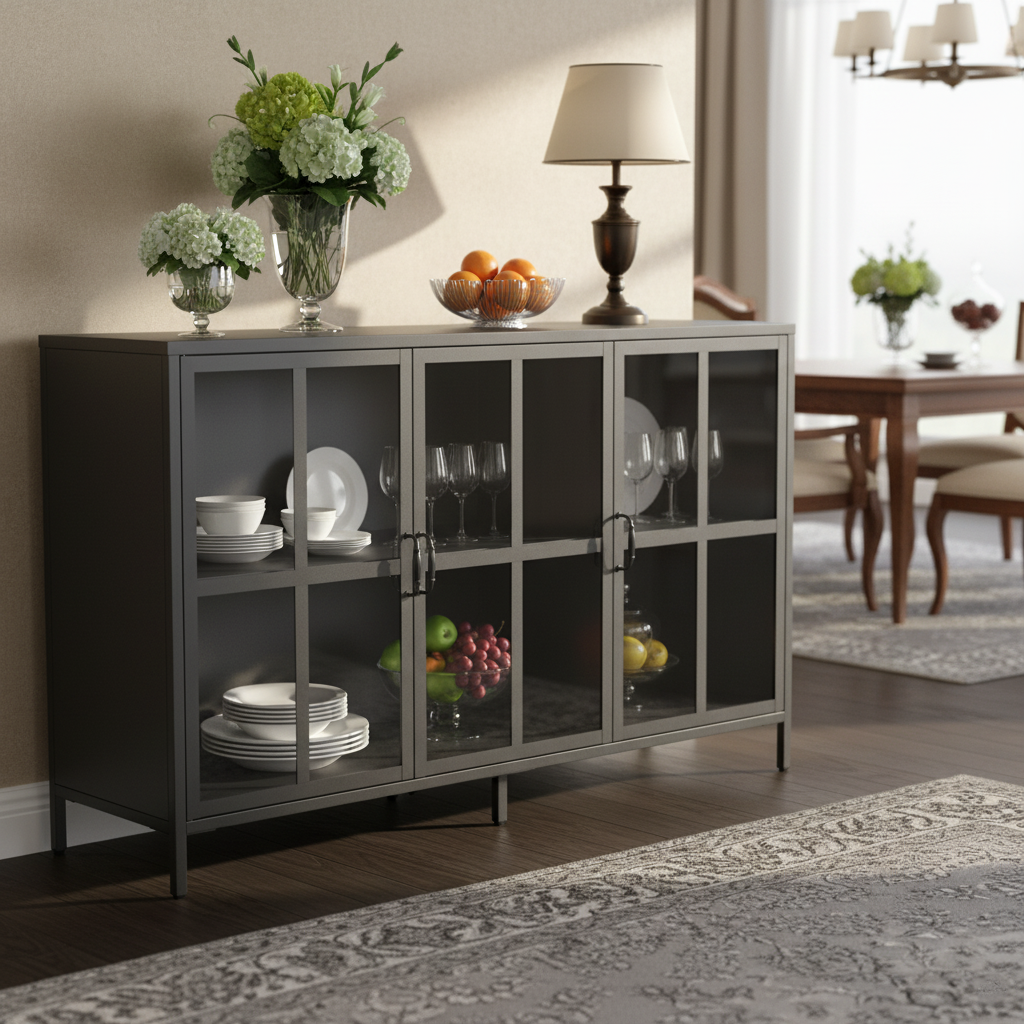 Upgrade your storage with this heavy duty modern sideboard buffet cabinet, featuring premium steel construction, tempered glass doors, and adjustable feet for versatile, large-capacity organization in any room.