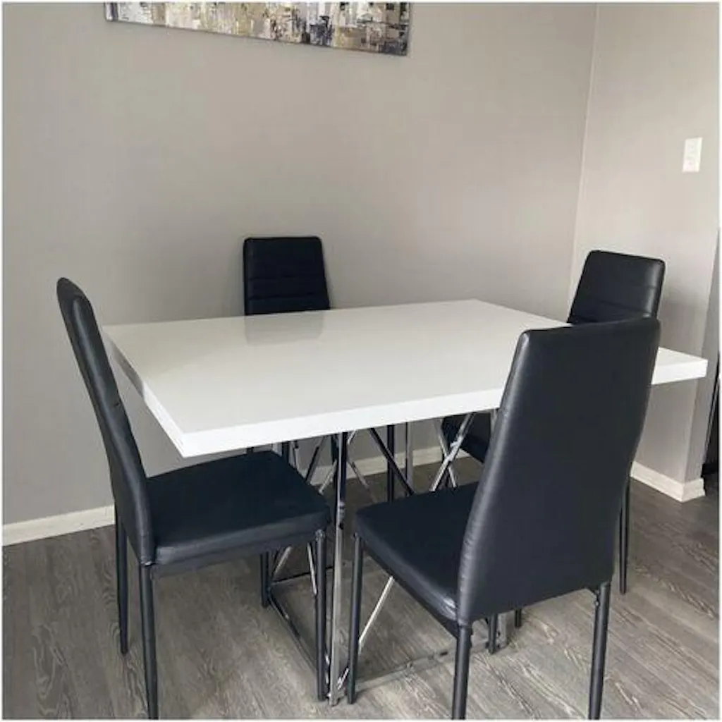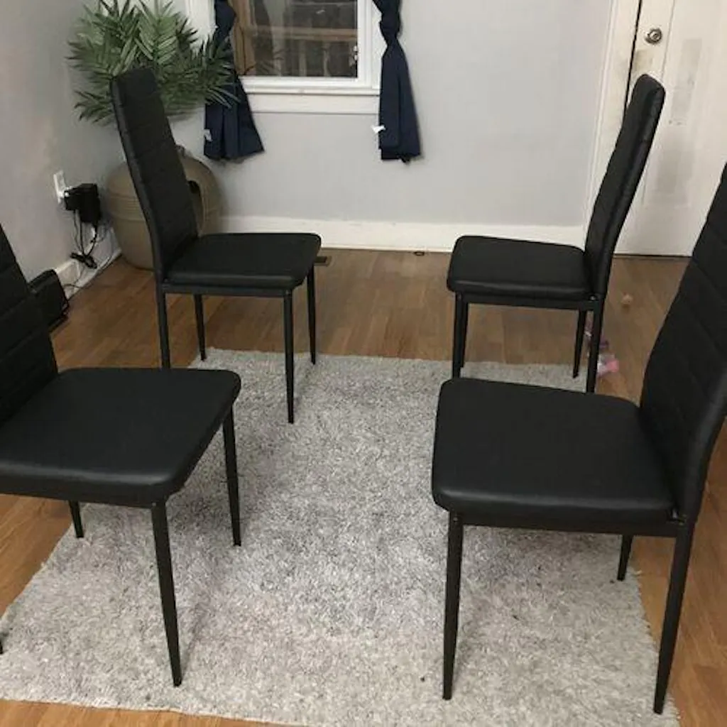 This modern set of 2 black PVC dining chairs adds a sleek, minimalist touch to any dining area. With ergonomic support and durable construction, they combine comfort and style for everyday meals or special occasions.