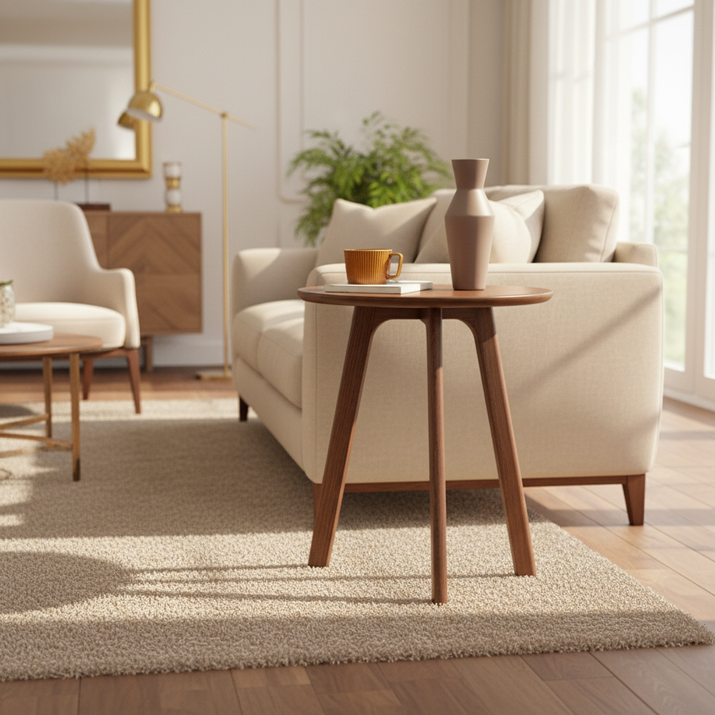 Crafted from 100% solid oak, the Aspen Round End Table features a minimalist round design, sturdy three-legged structure, and a warm walnut finish, making it a versatile and elegant accent for any living space.