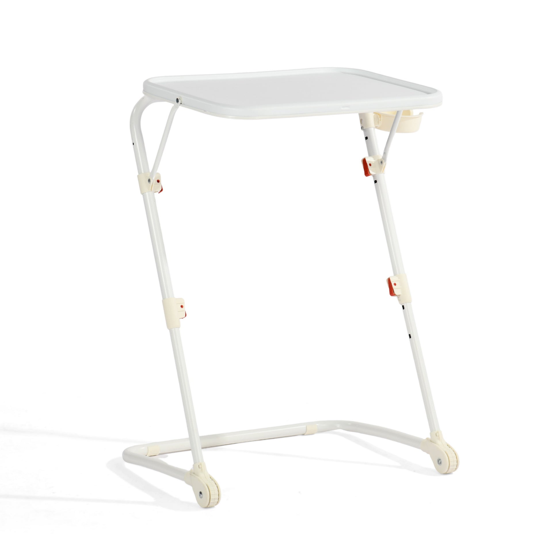 Portable folding side table with rolling base, adjustable height and tilt, handy cup holder, easy to move and store for sofa, bed and small spaces.