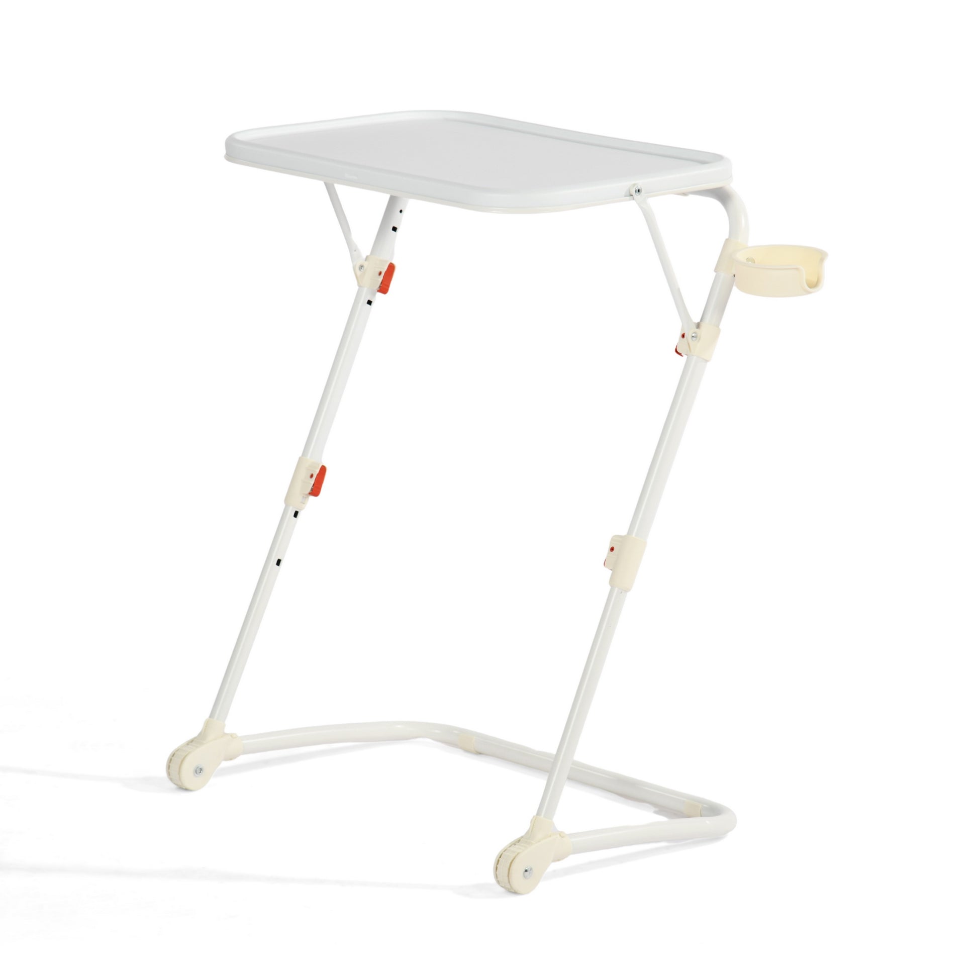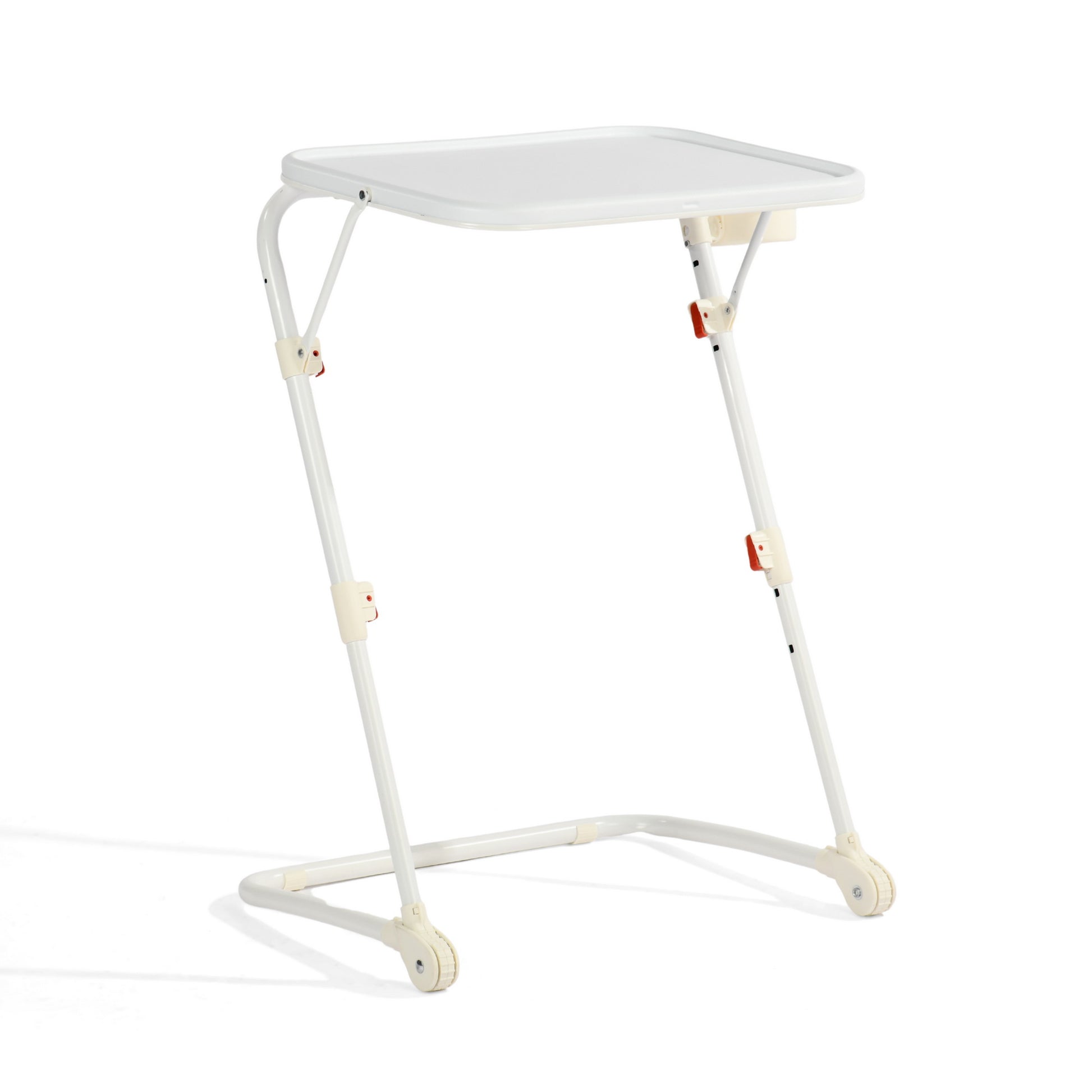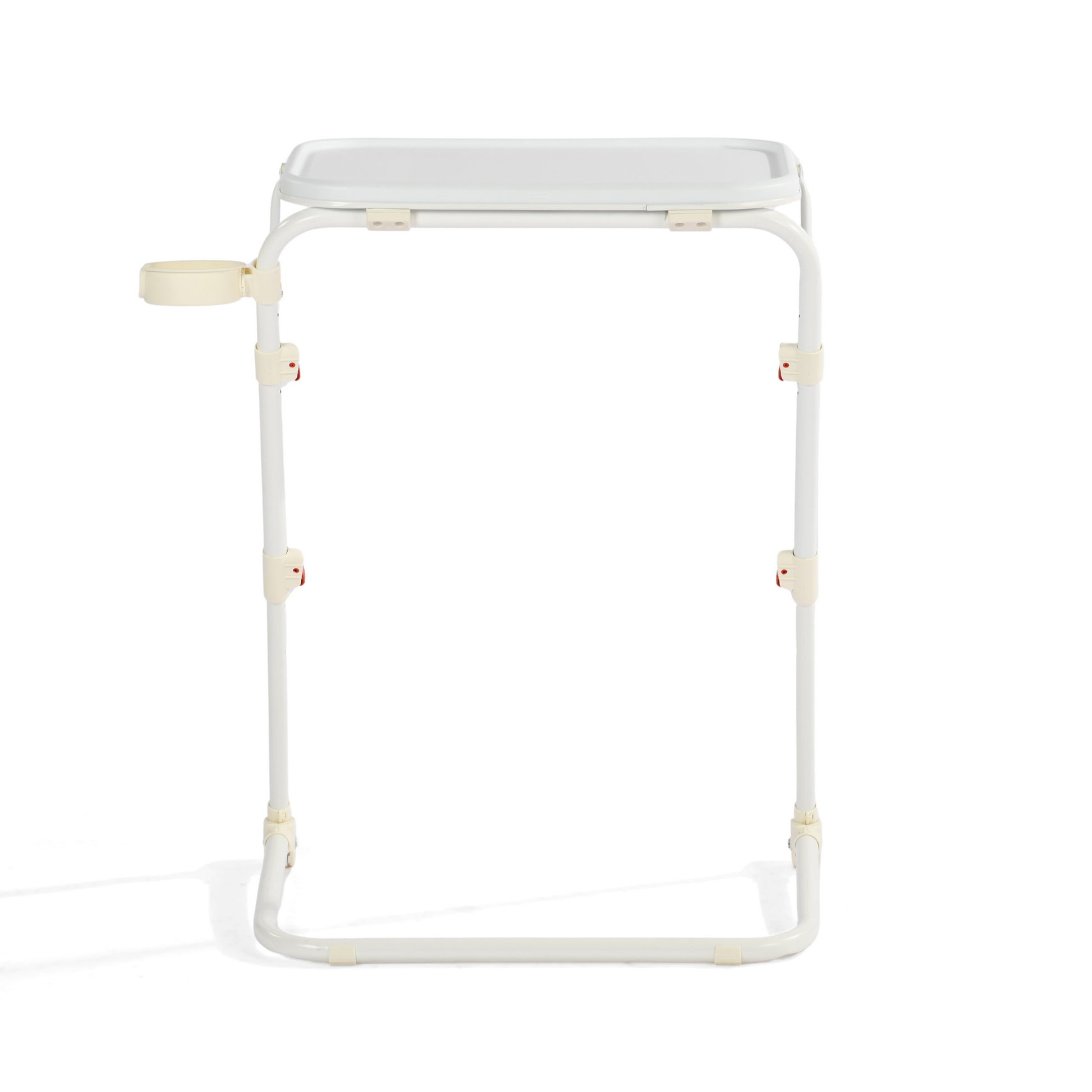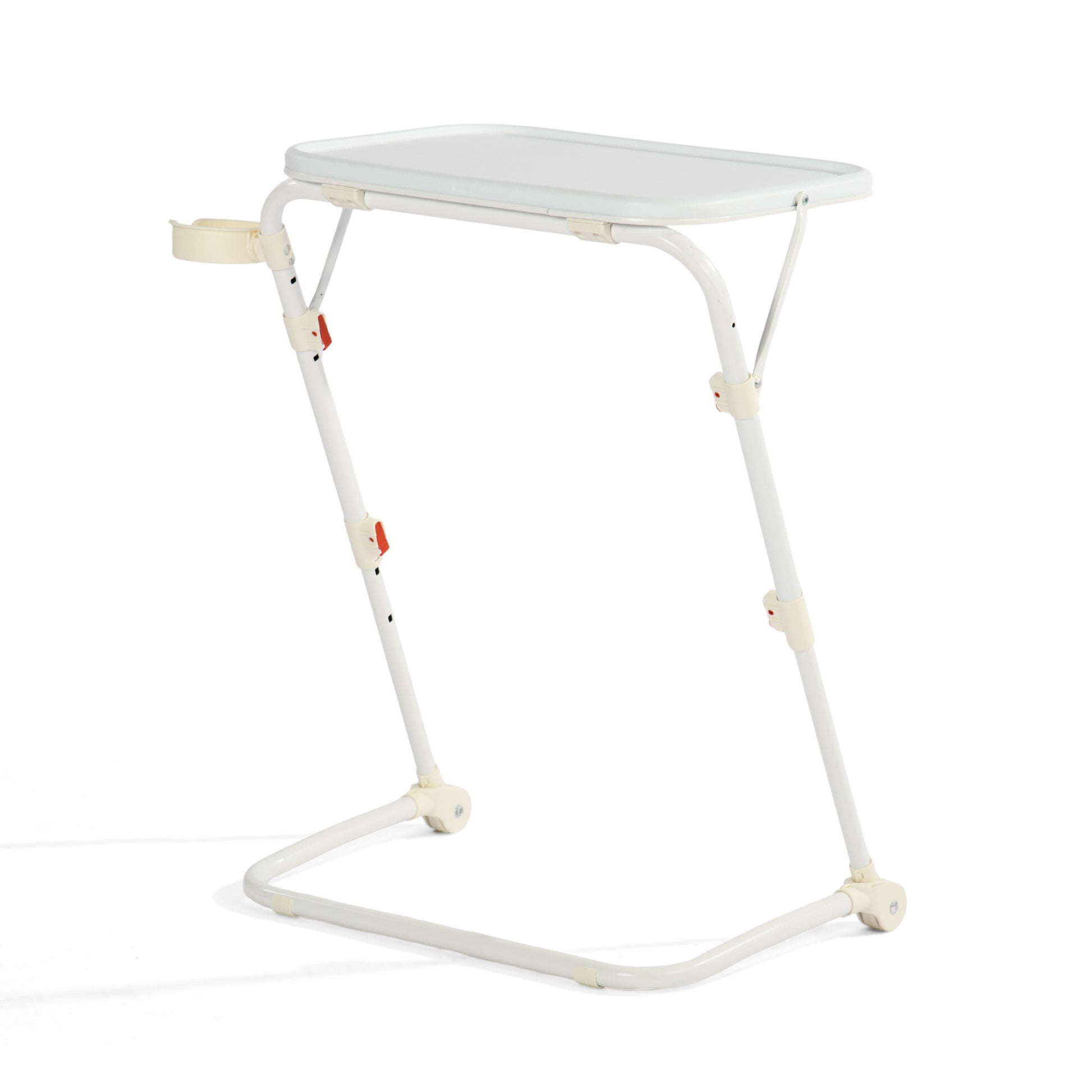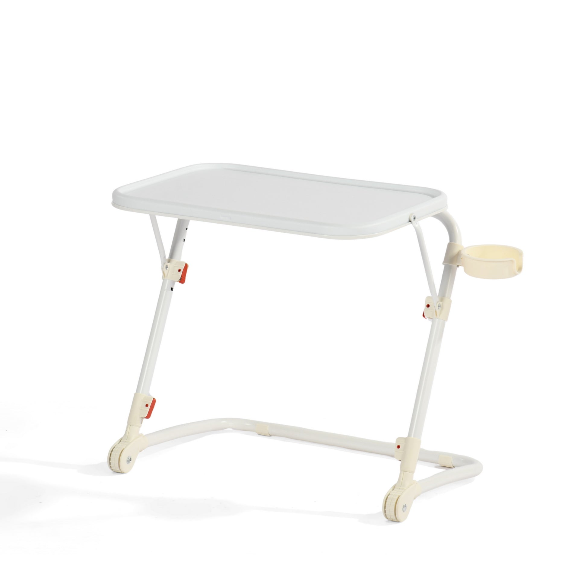 Portable folding side table with rolling base, adjustable height and tilt, handy cup holder, easy to move and store for sofa, bed and small spaces.