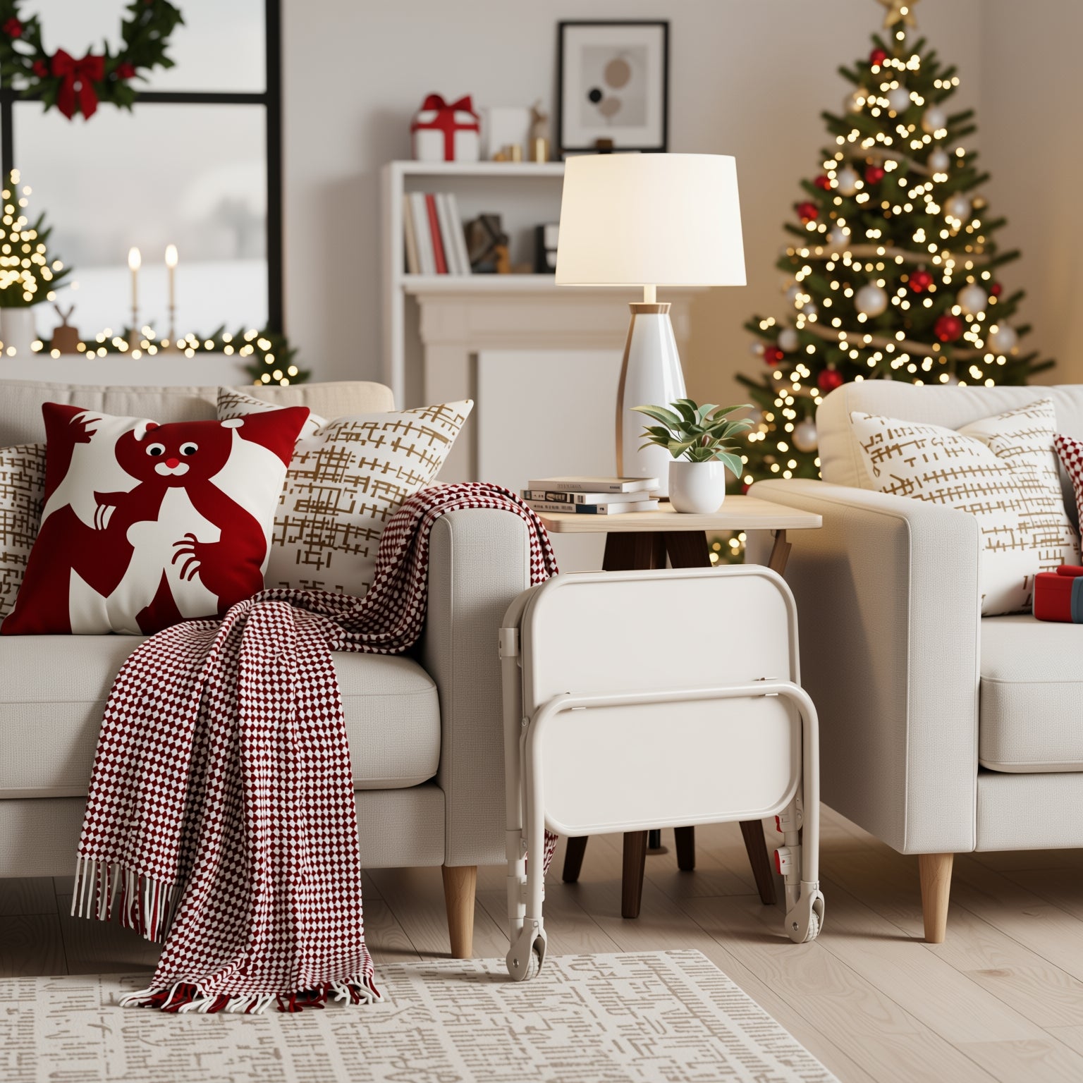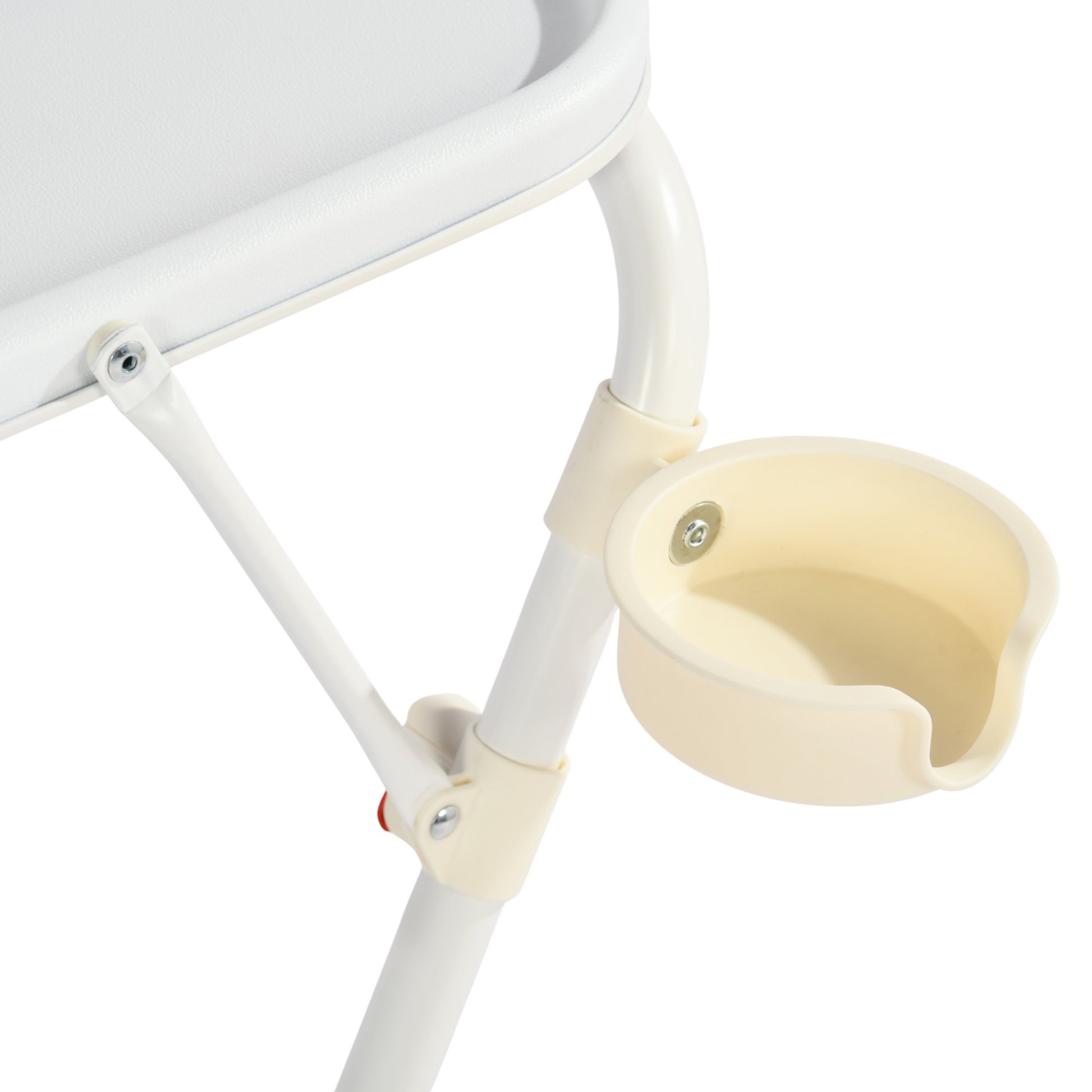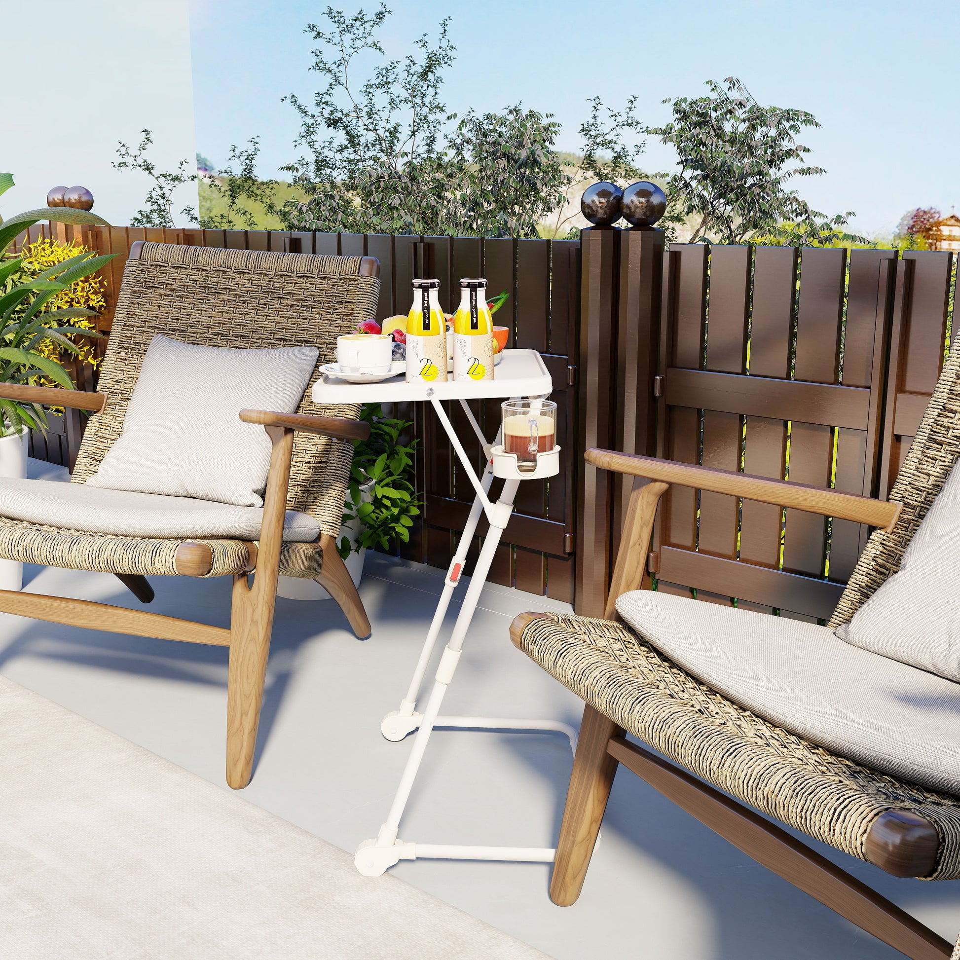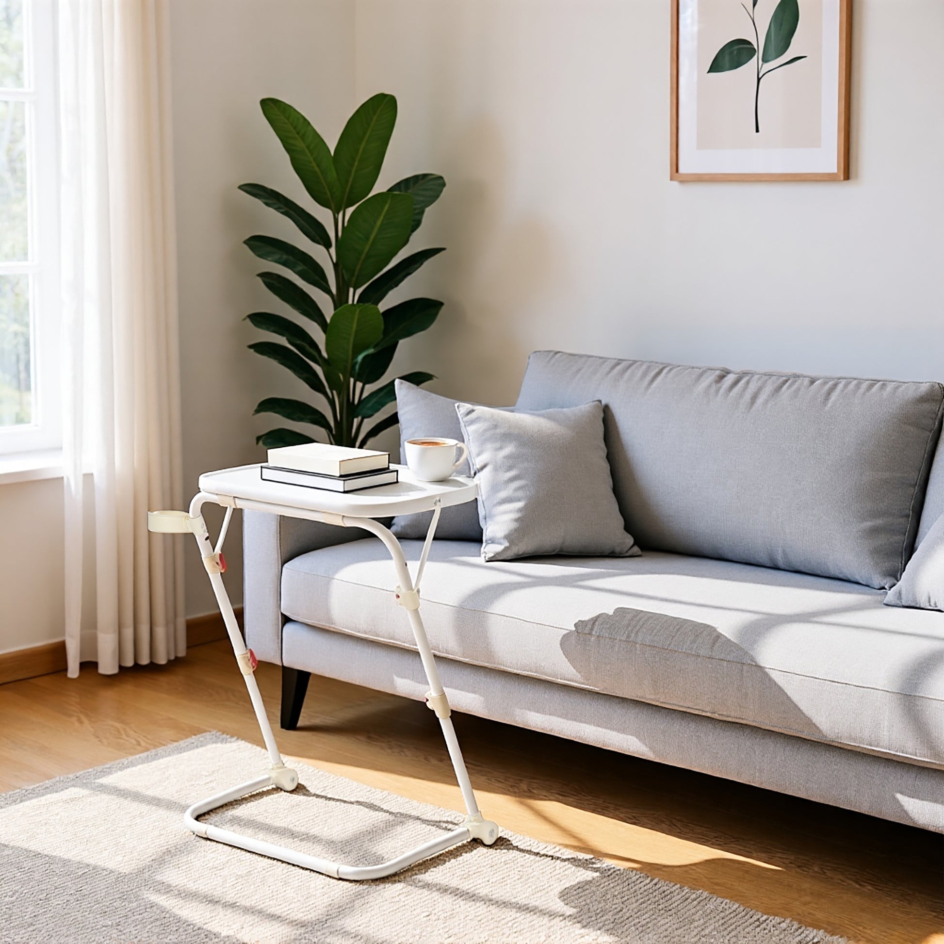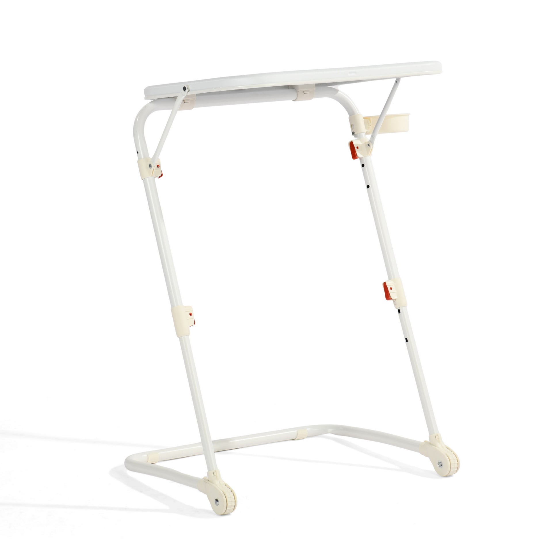 Portable folding side table with rolling base, adjustable height and tilt, handy cup holder, easy to move and store for sofa, bed and small spaces.