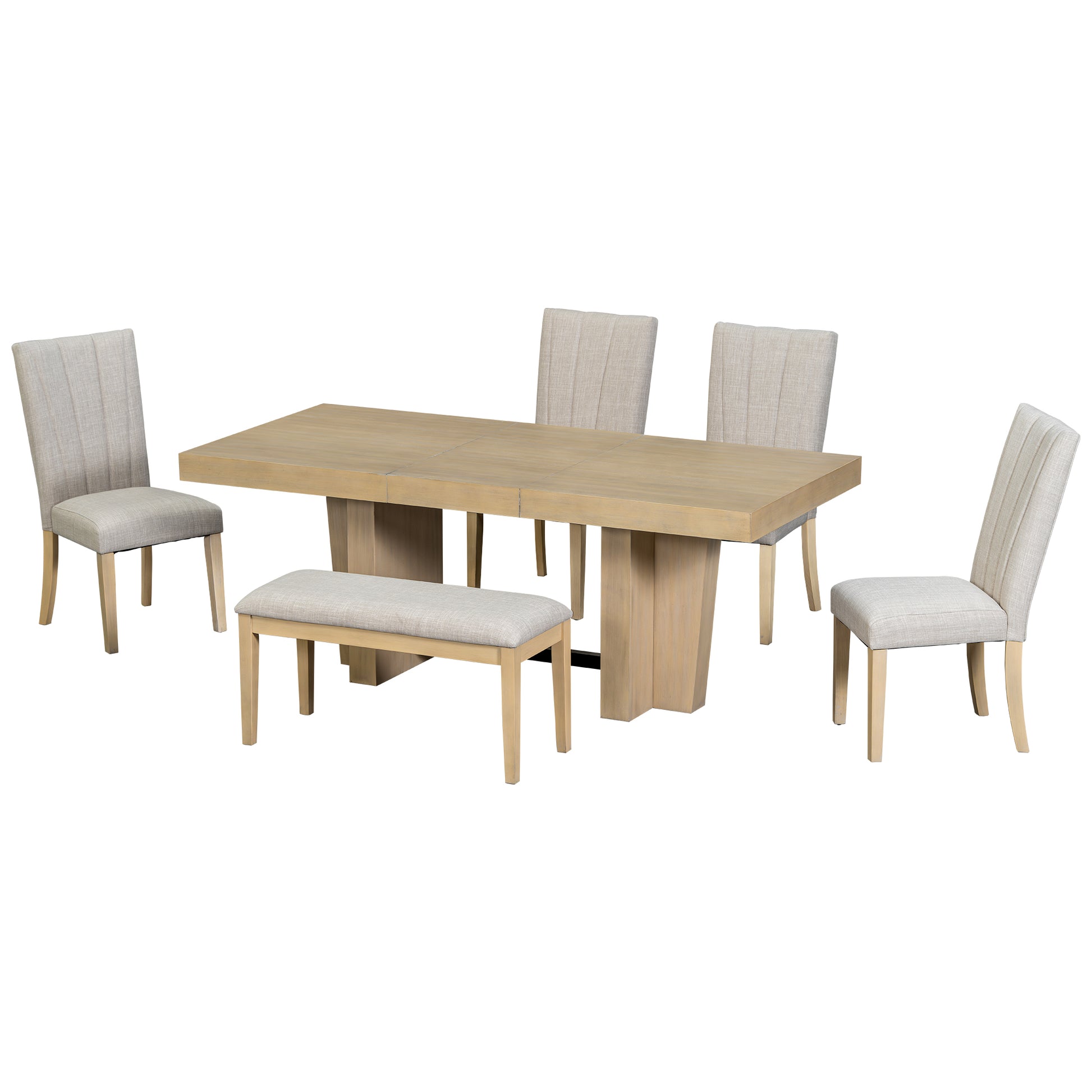 The Batur 6-seat farmhouse dining set combines rustic charm with modern versatility. Featuring an extendable table, upholstered chairs, and a padded bench, it brings warmth and function to every gathering.