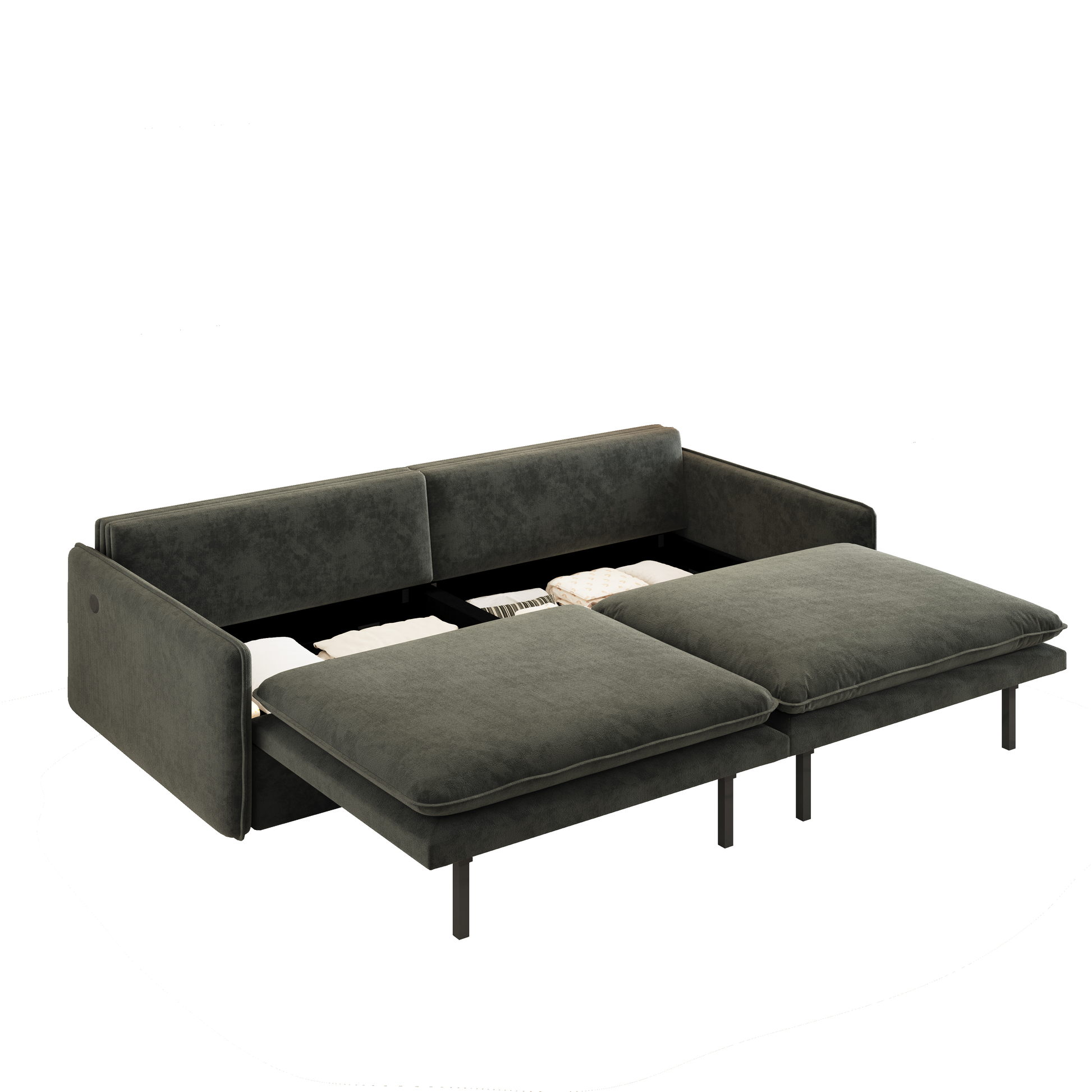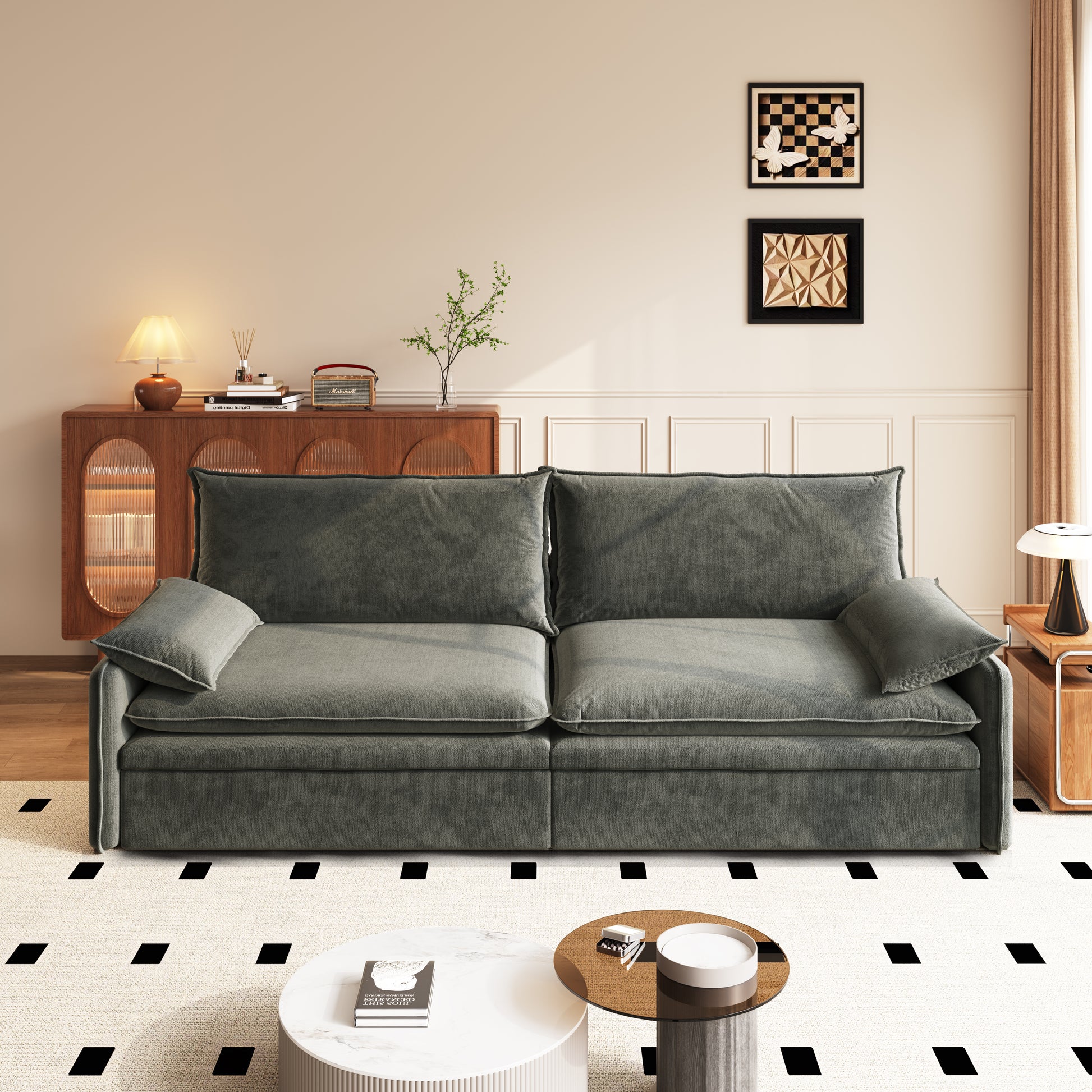 This 81 inch chenille convertible sleeper sofa features a cloud soft seat feel a flexible 3 in 1 layout built in storage and a convenient charging port making it ideal for modern living rooms guest rooms and compact spaces.