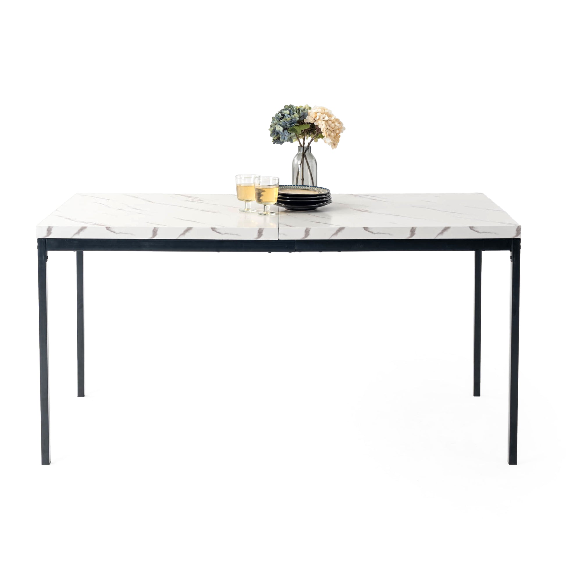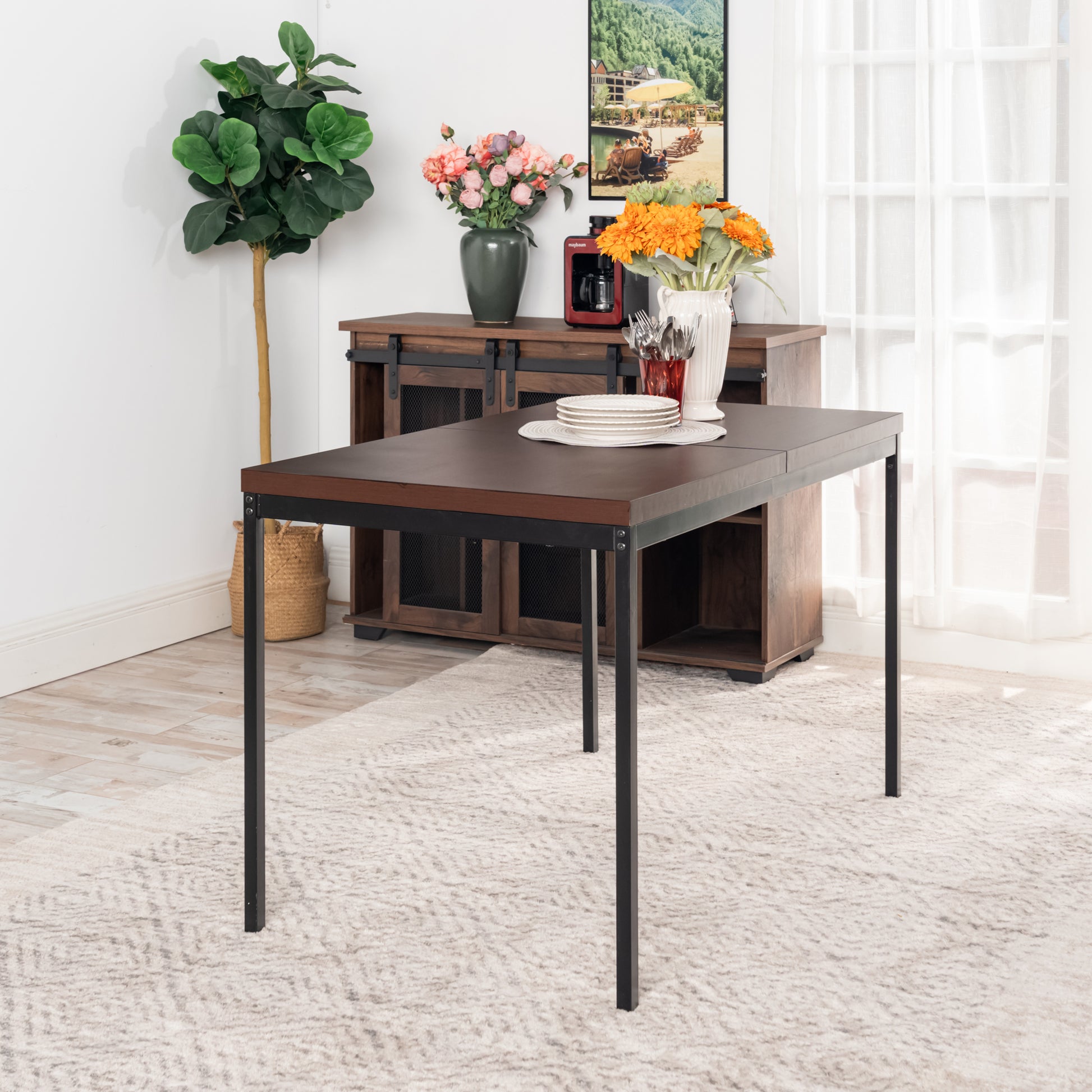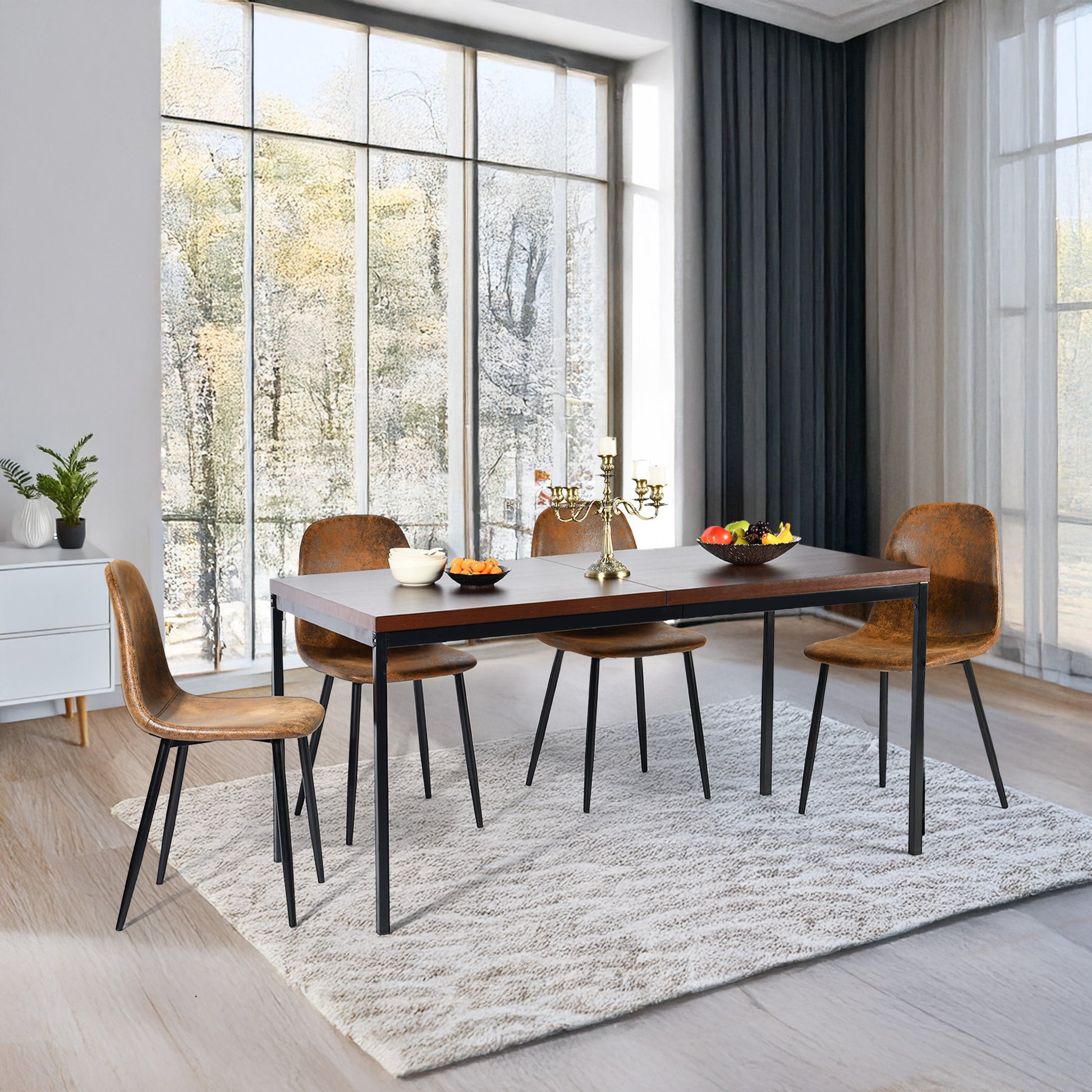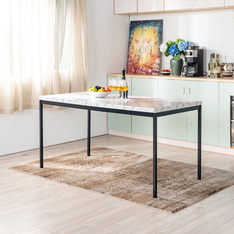 A sleek rectangular dining table with walnut-finished top and black metal frame - ideal for contemporary dining spaces, seating up to 6 comfortably.