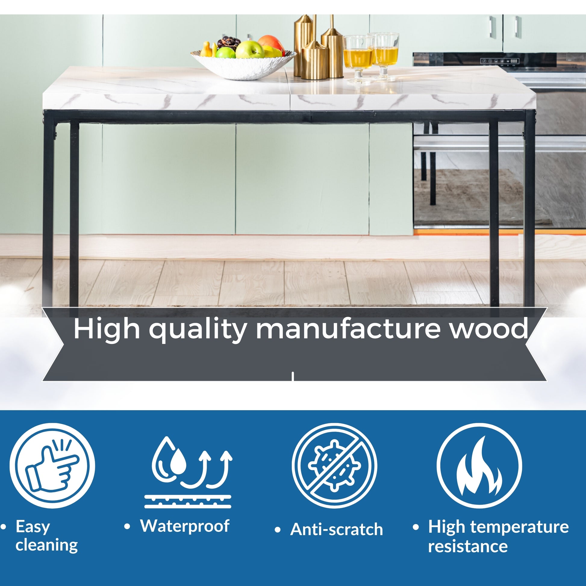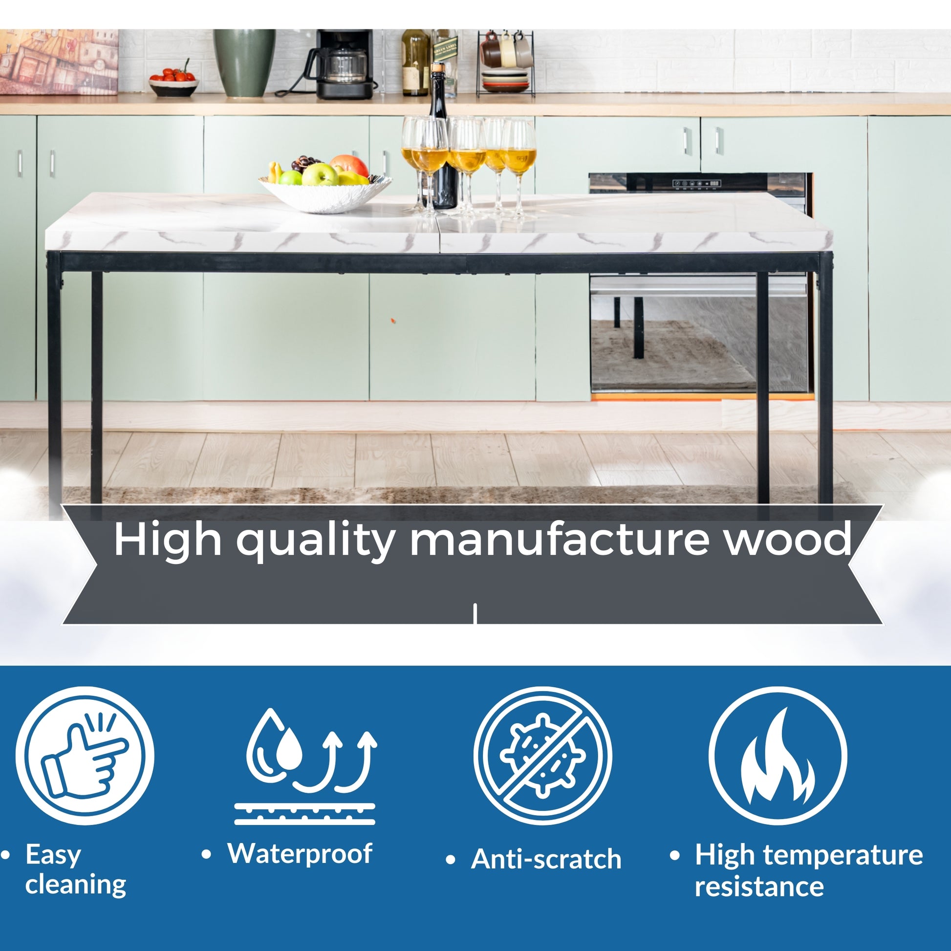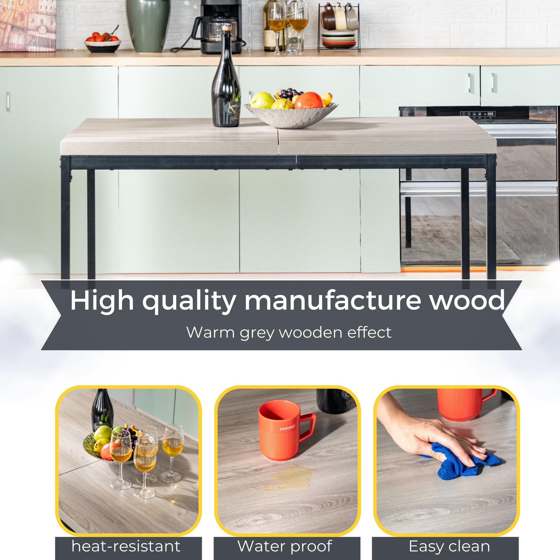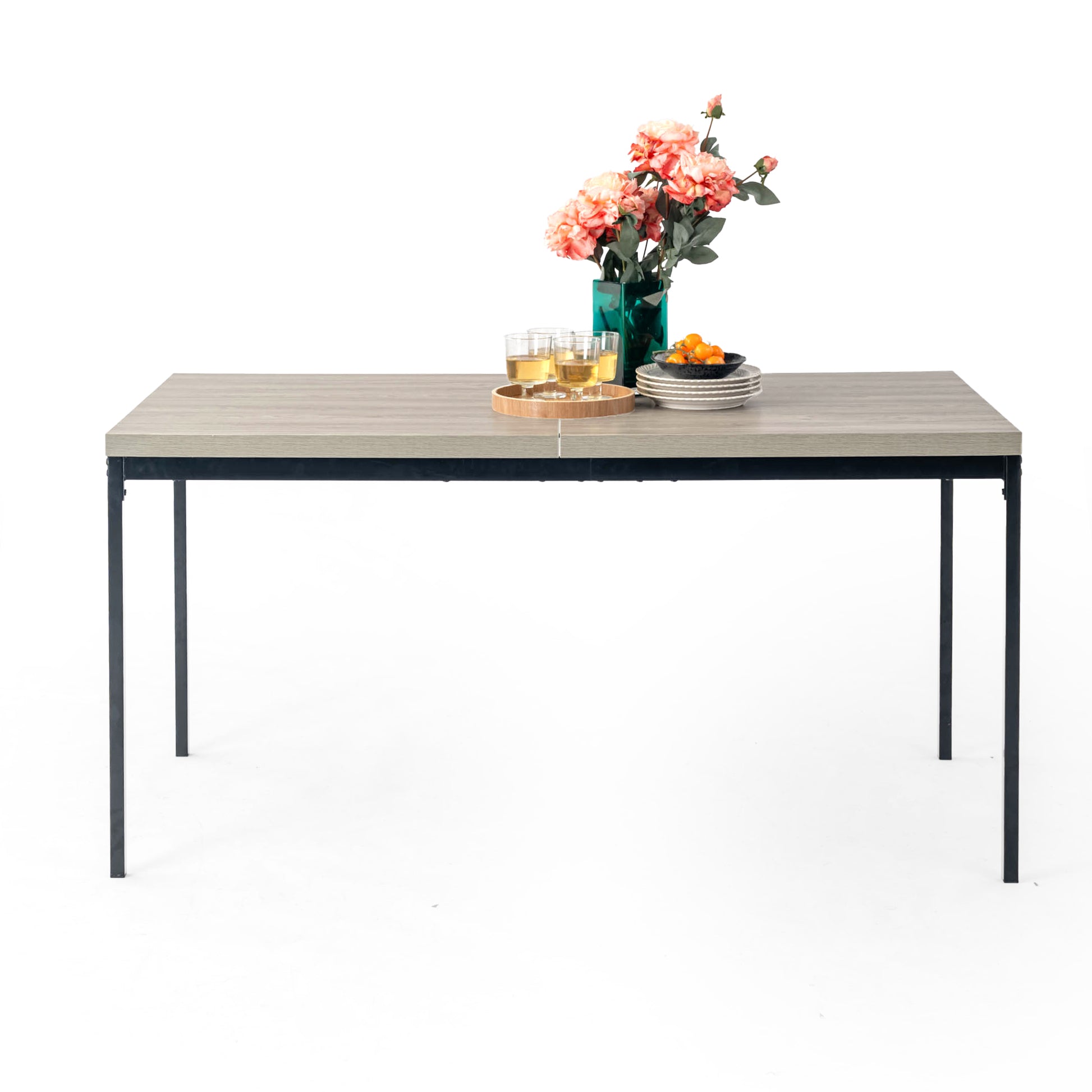 A sleek rectangular dining table with walnut-finished top and black metal frame - ideal for contemporary dining spaces, seating up to 6 comfortably.