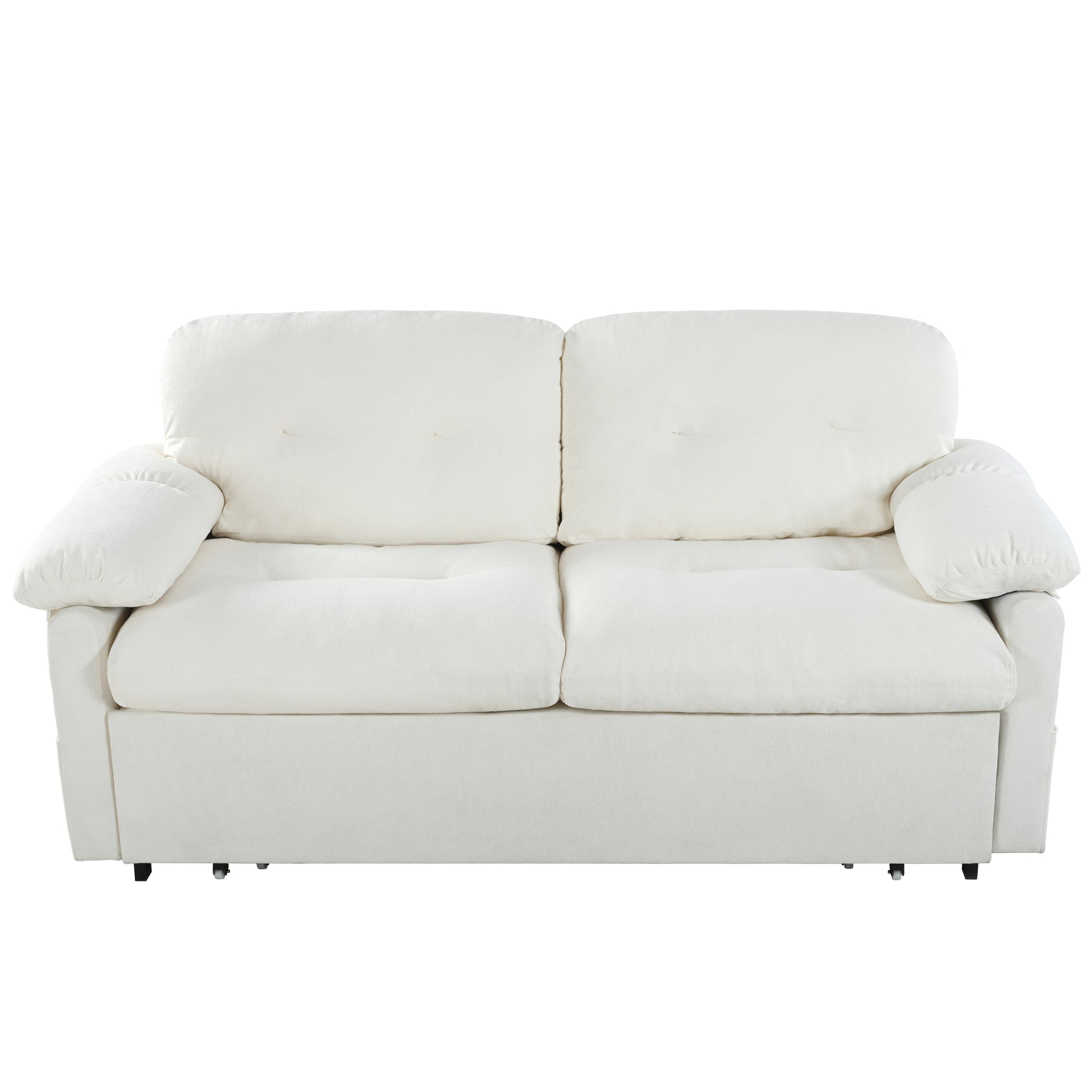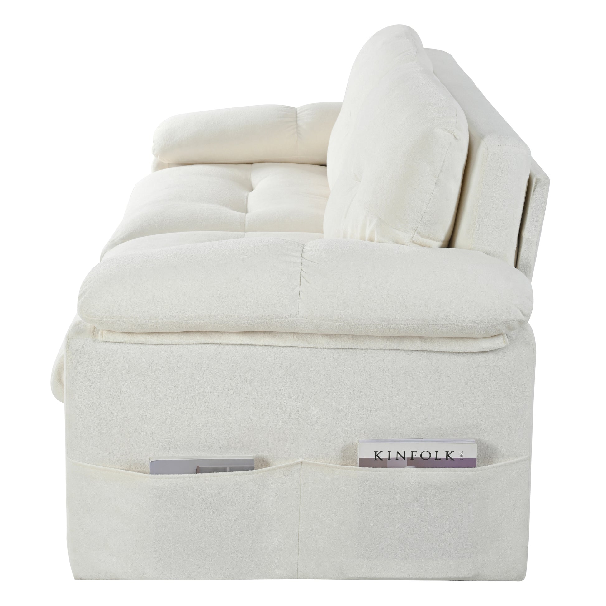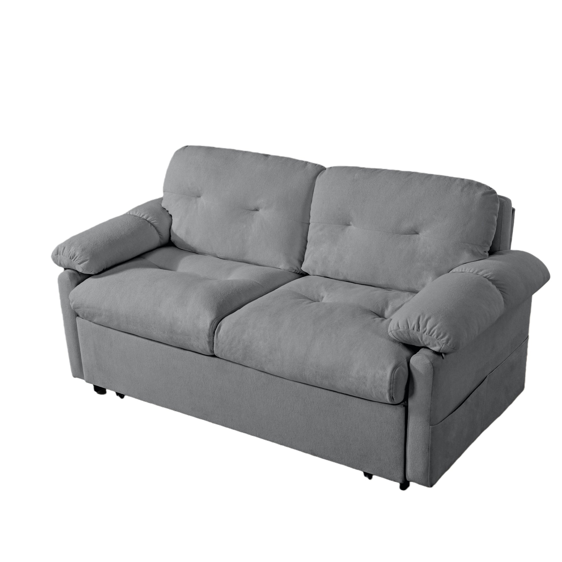 A modern 3-in-1 chenille loveseat sleeper sofa that easily converts from a sofa to a chaise lounge or a queen-size bed. Features plush double-layer back cushions, a sturdy steel frame, smooth-rolling casters, and a convenient side storage pocket, perfect for stylish, space-saving comfort in any living area.