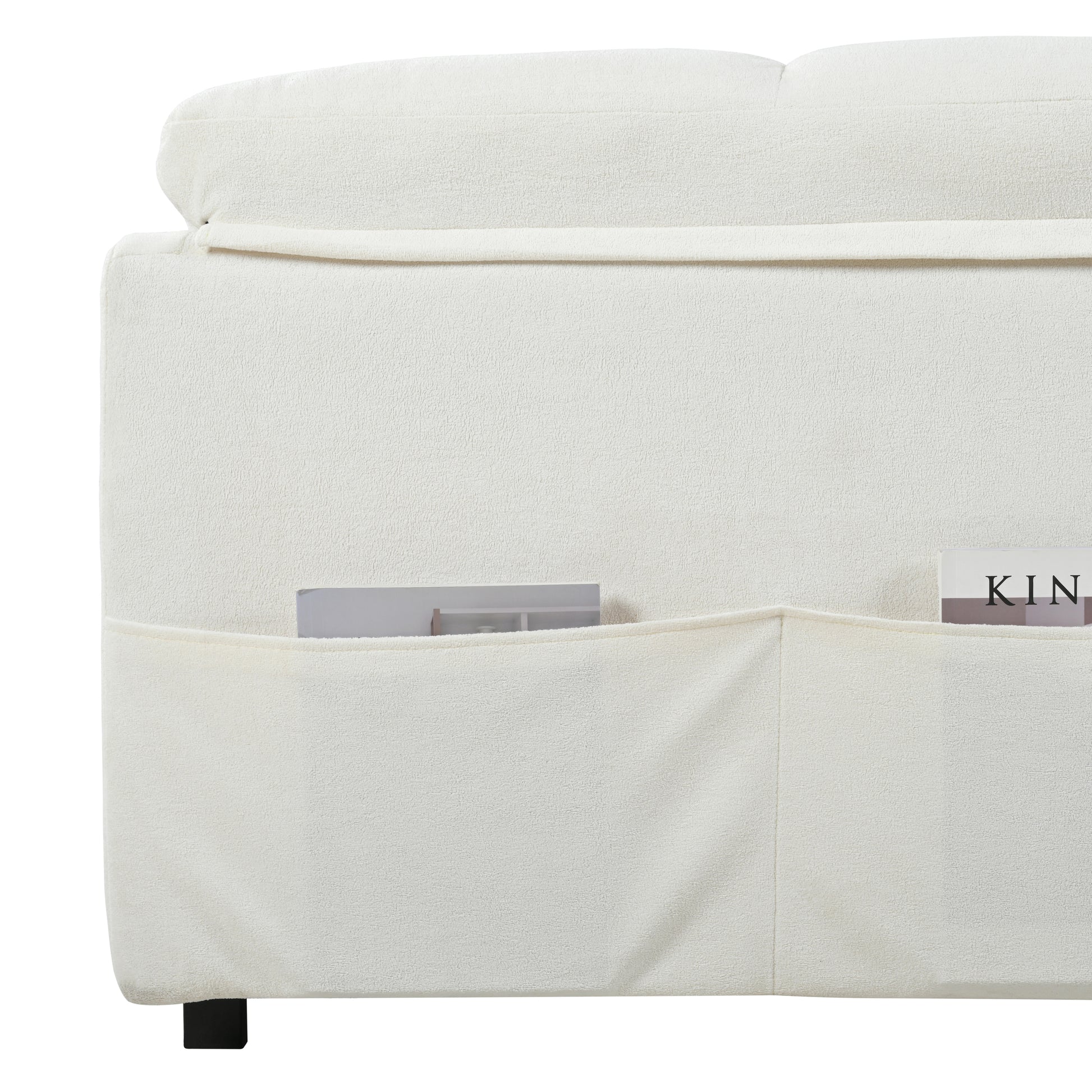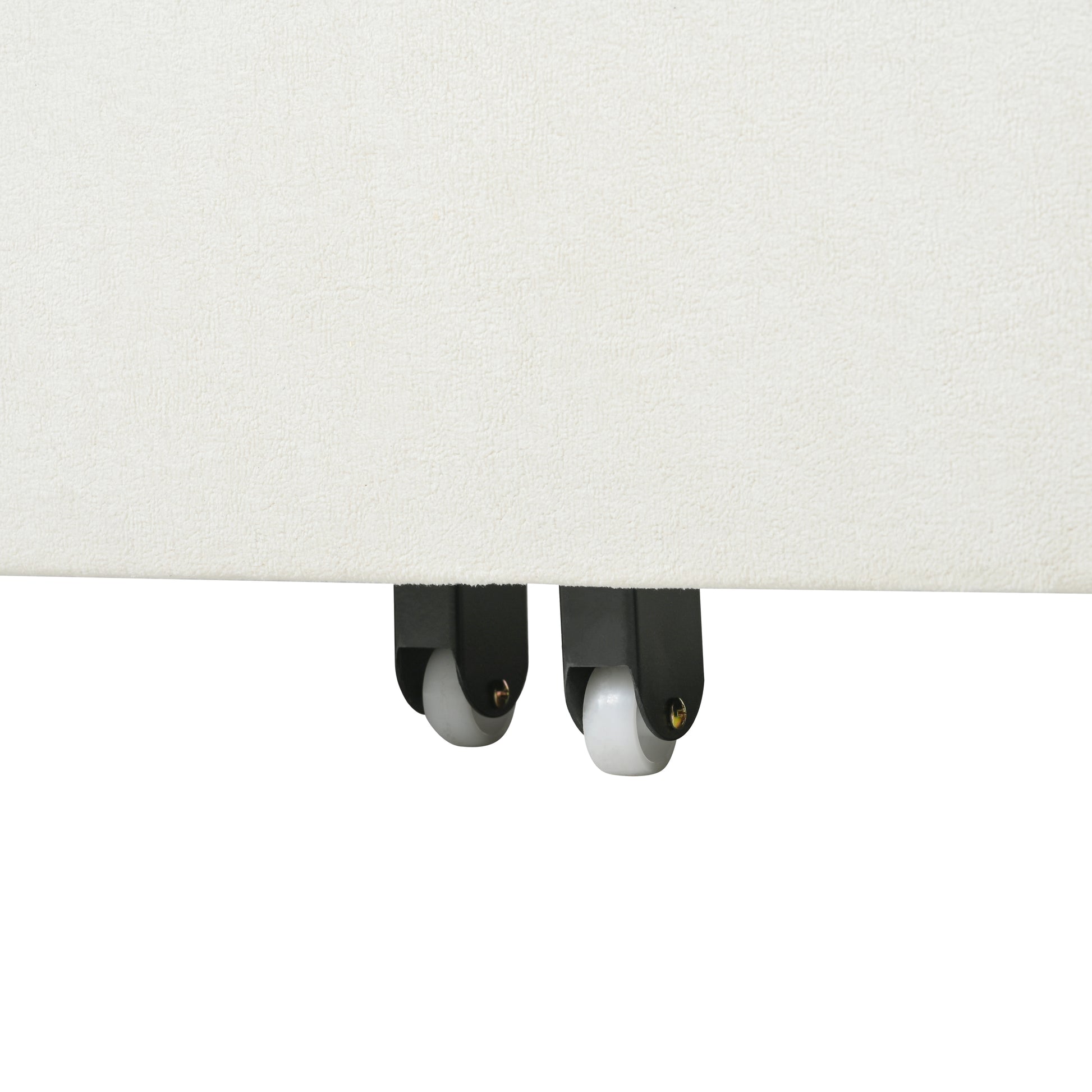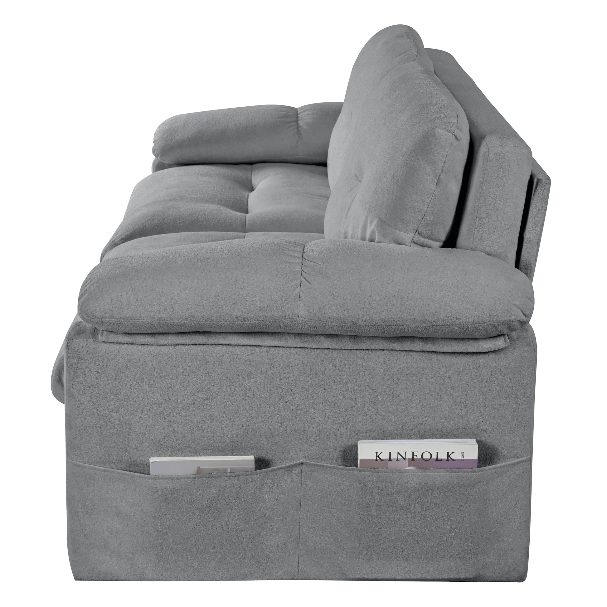 A modern 3-in-1 chenille loveseat sleeper sofa that easily converts from a sofa to a chaise lounge or a queen-size bed. Features plush double-layer back cushions, a sturdy steel frame, smooth-rolling casters, and a convenient side storage pocket, perfect for stylish, space-saving comfort in any living area.