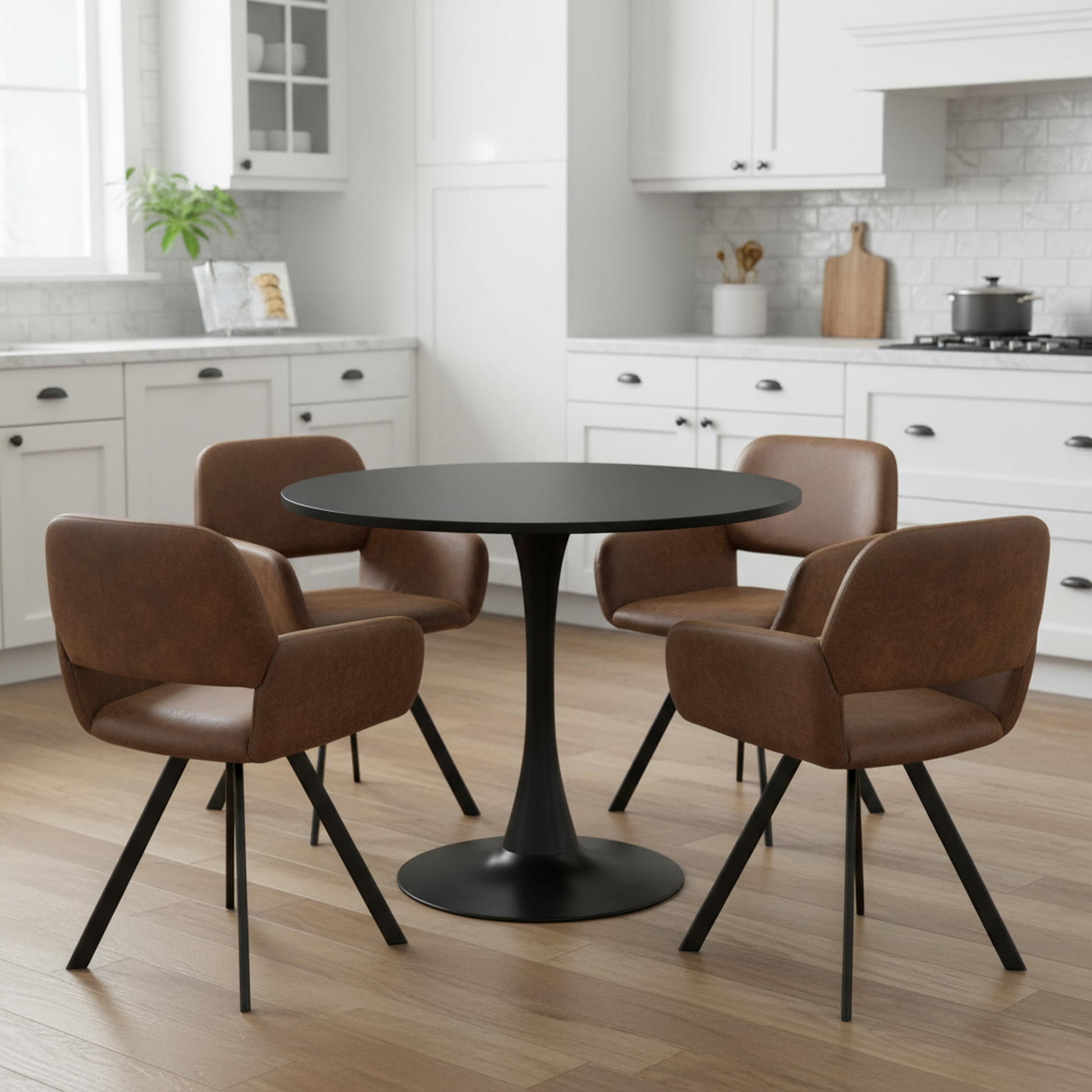 Gather friends and family around this modern 5-piece dining set, featuring a round black pedestal table and four California chairs in warm brown suede. Designed for both style and comfort, this set is ideal for daily meals, celebrations, or casual gatherings in any dining space.