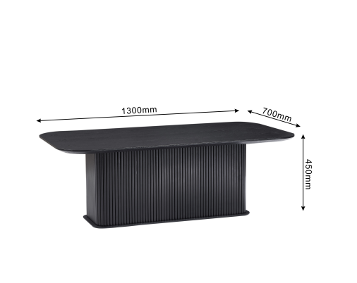 Modern rectangular coffee table in black with a ridged pedestal base and metal support. Durable oak look top wipes clean and anchors living rooms with style.