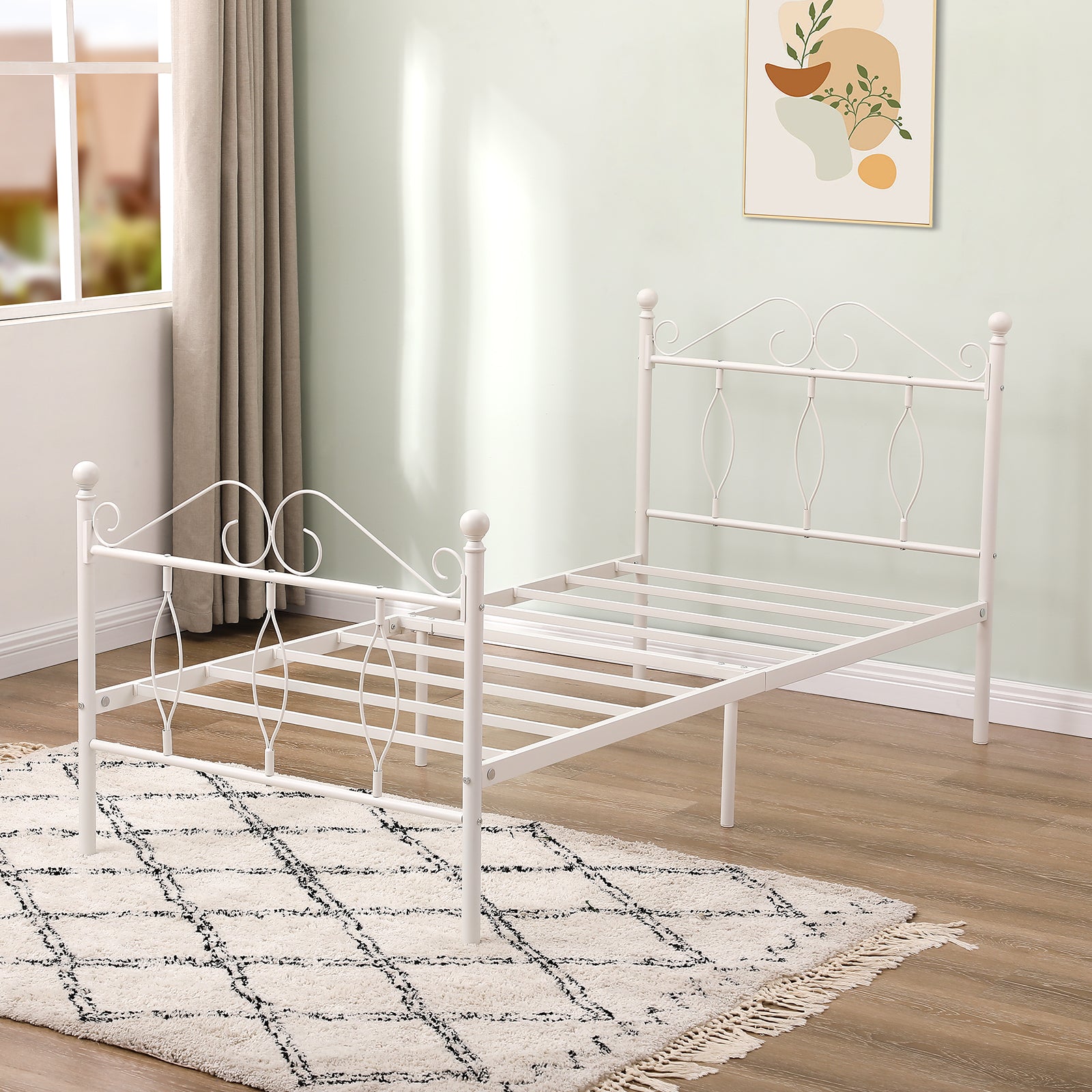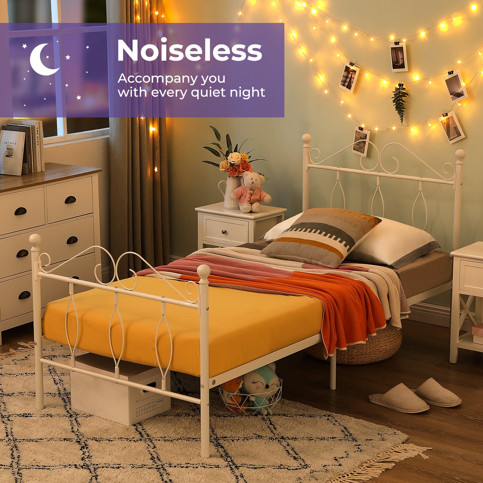 DANDY Twin Metal Bed Frame with Headboard and Footboard, Victorian Scroll Design, Steel Slats, No Box Spring, White