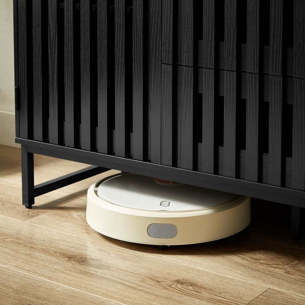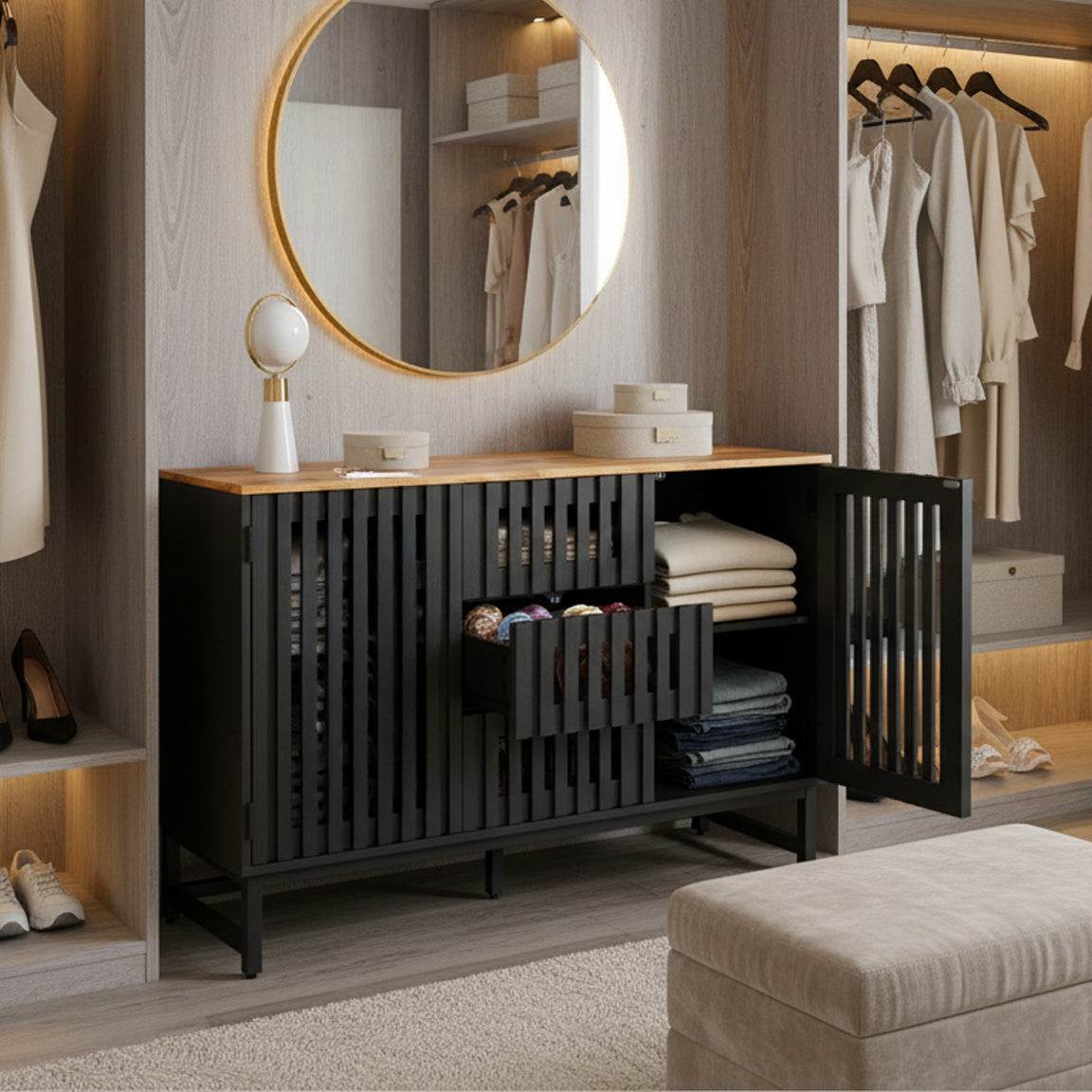 Add modern sophistication and practical storage to your space with this dresser, featuring three drawers and four shelves behind slatted grille doors, crafted from high-quality MDF with a striking black and brown finish.