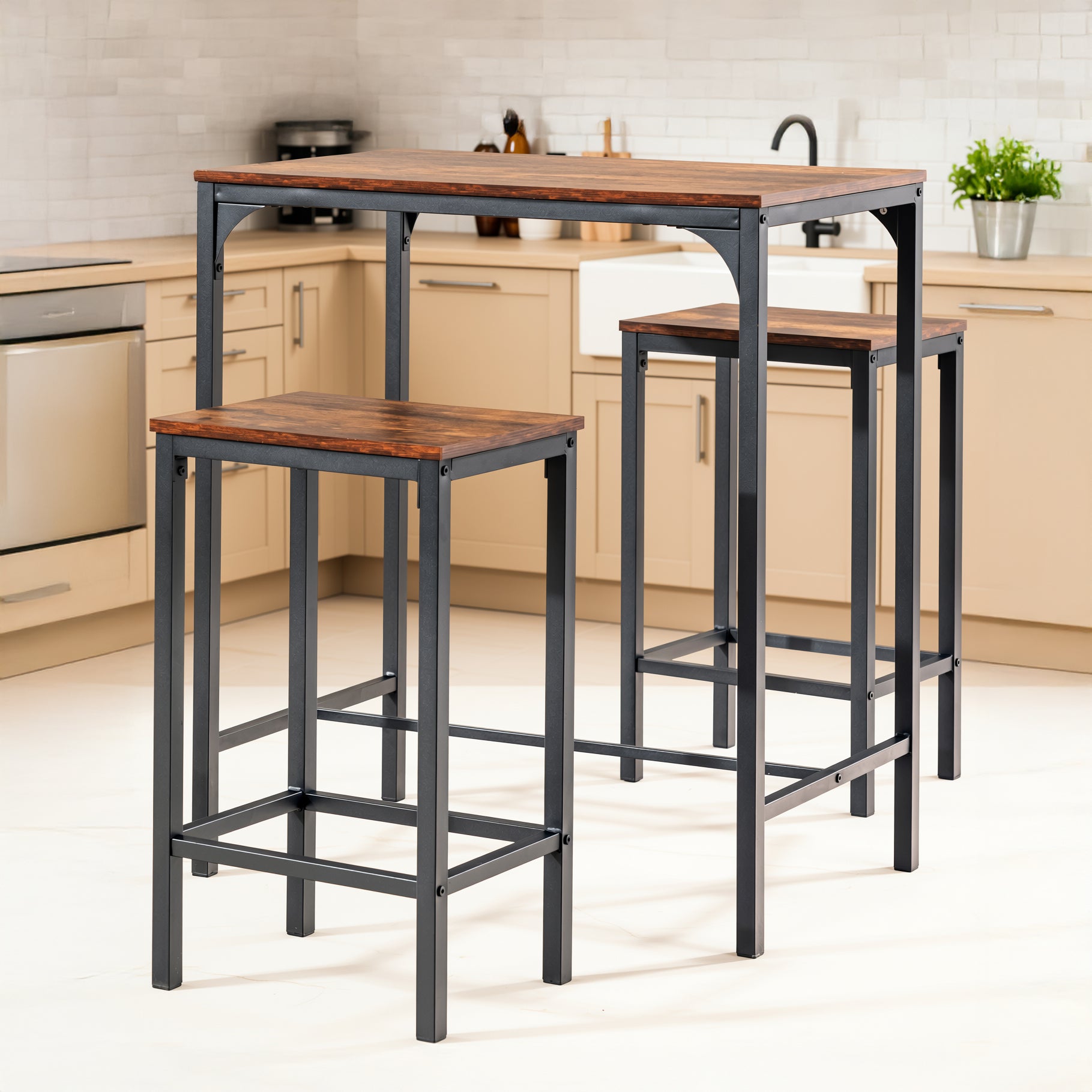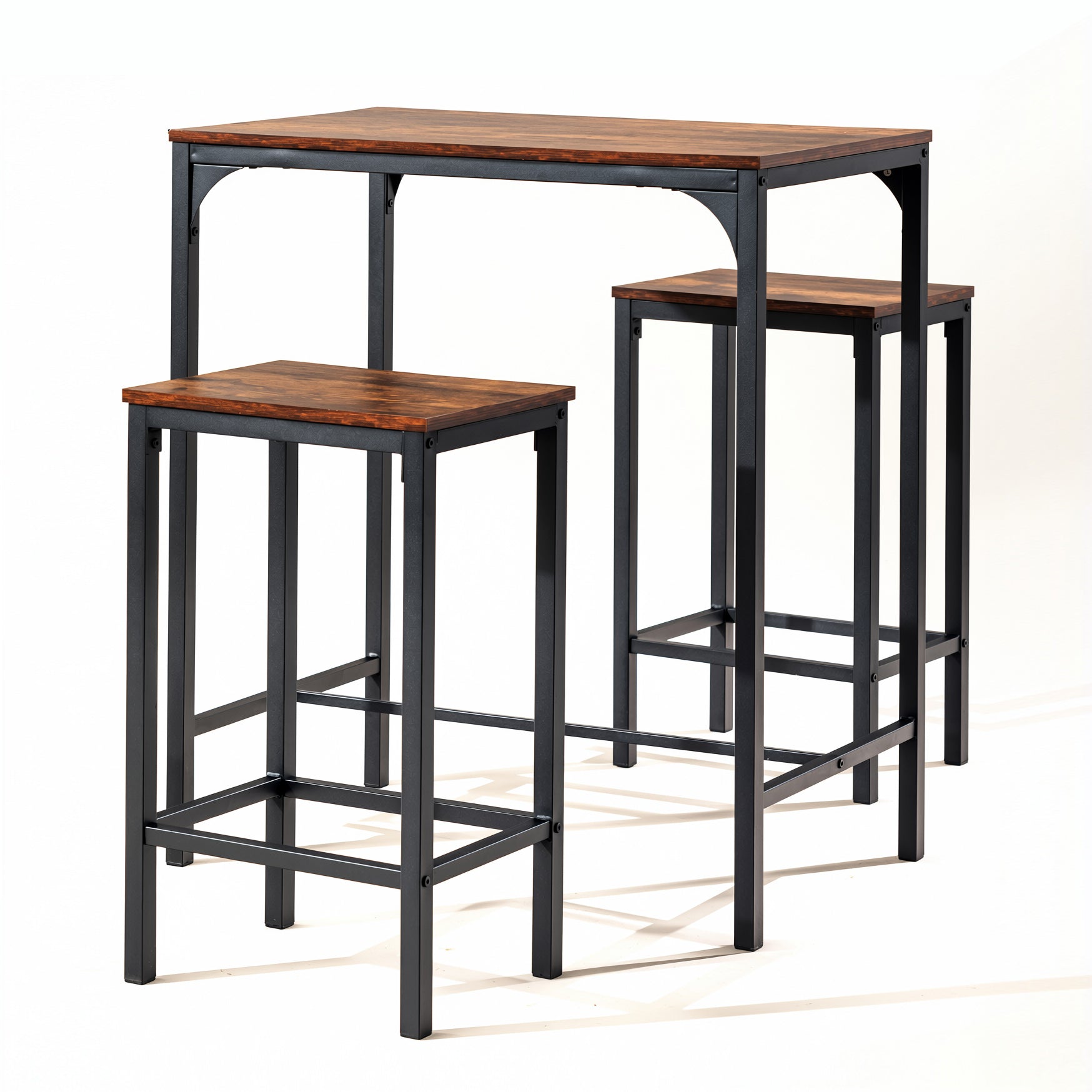Rustic 3-piece counter dining set with metal frame and vintage wood top. Compact, sturdy, and ideal for kitchens or small apartments.