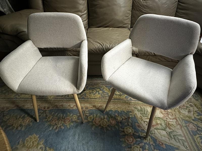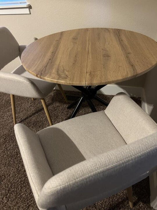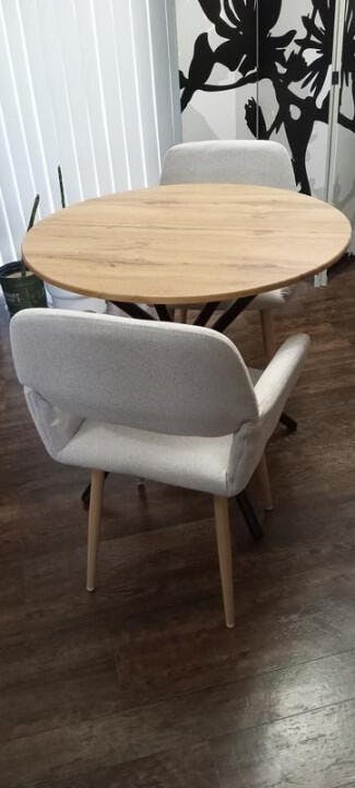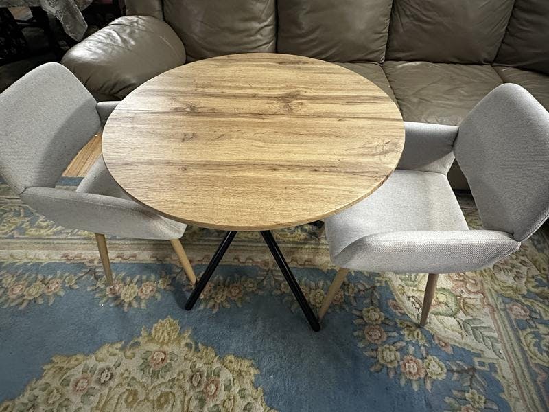 A cozy 3-piece dining set featuring an oak-finish round table and two Mayfair upholstered chairs in beige or brown, perfect for small-space dining with modern elegance.