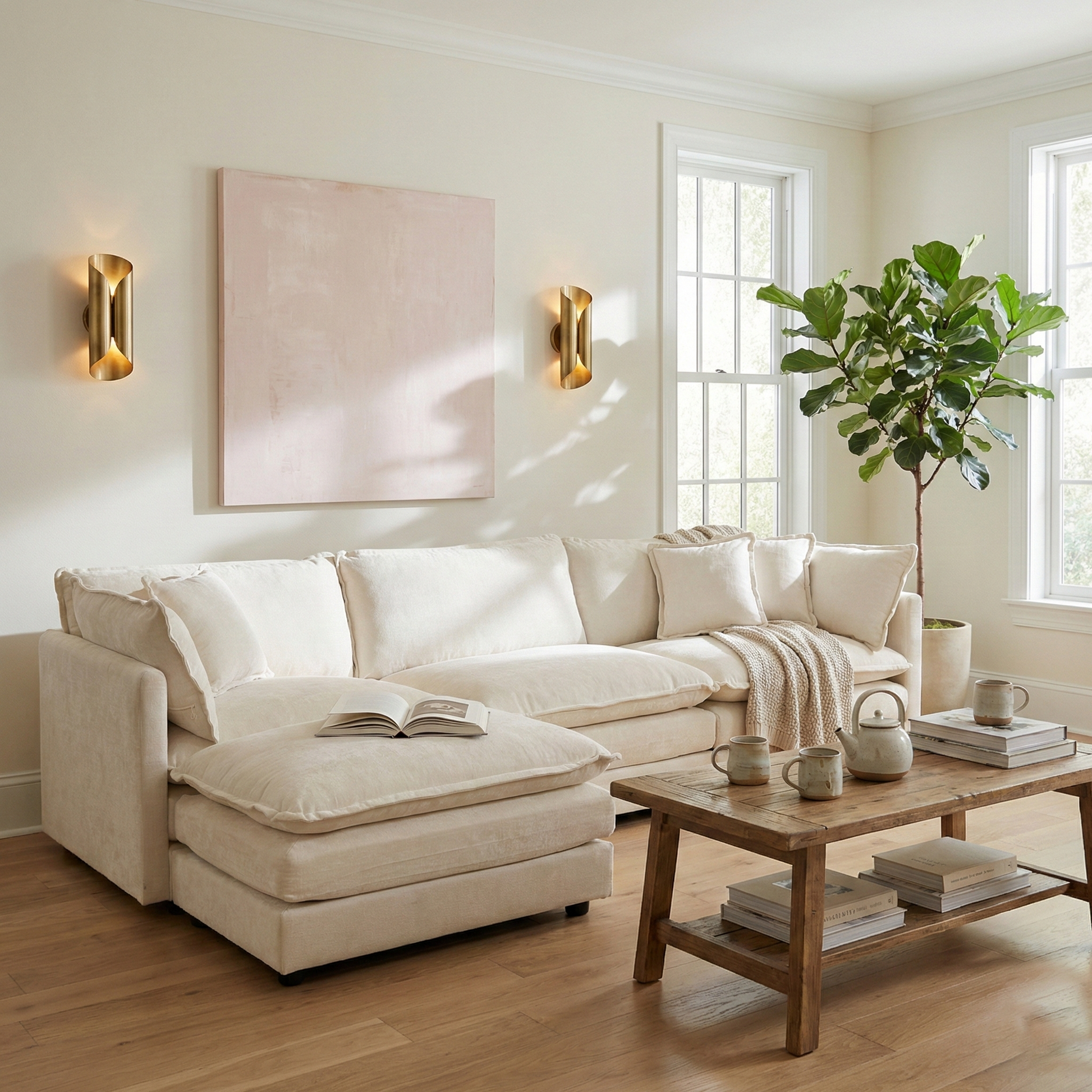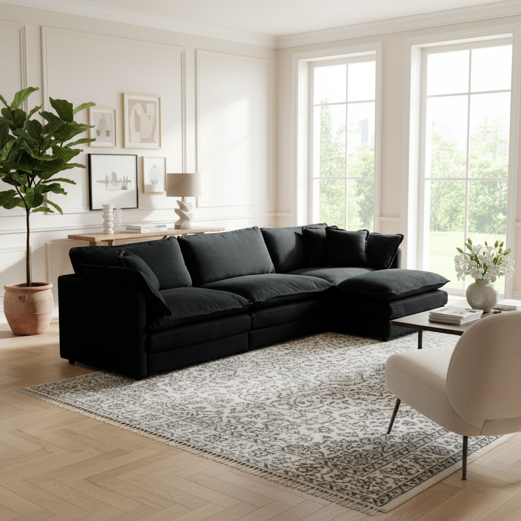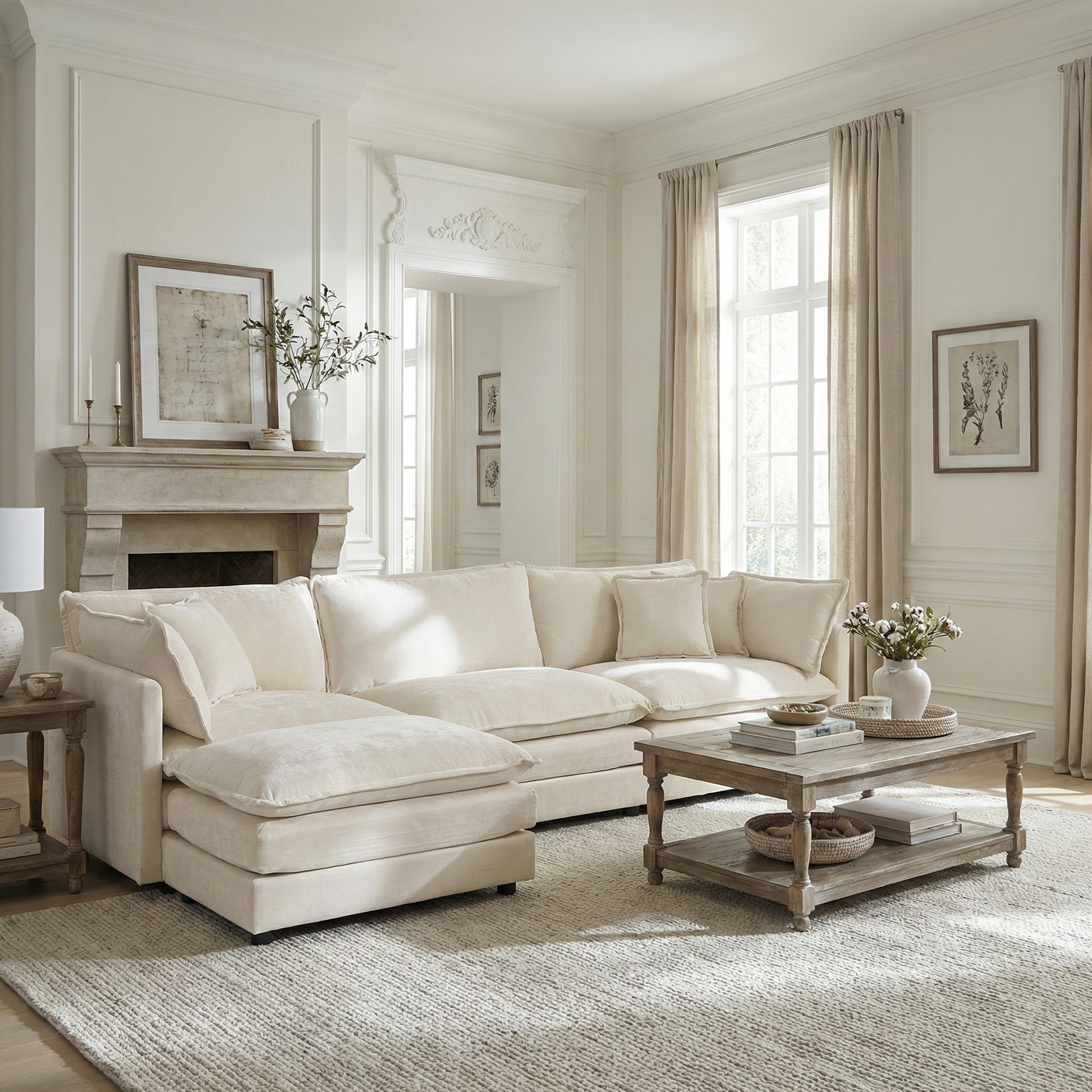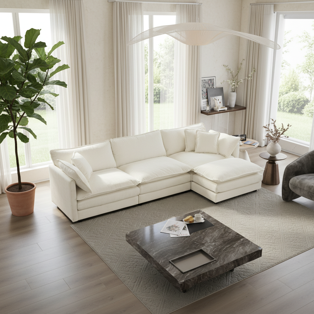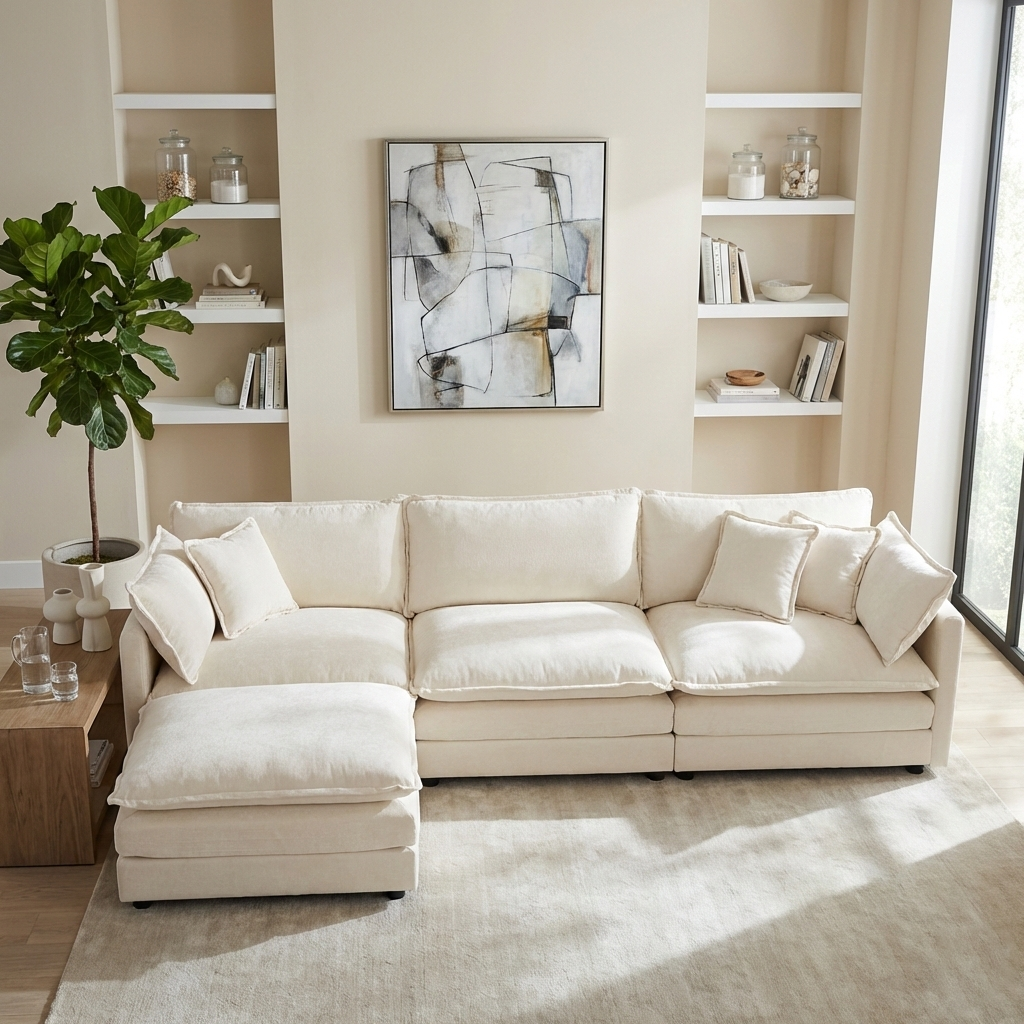 Modern chenille modular U-shaped sectional sofa with ottomans, designed for flexible living room layouts and deep, supportive comfort. This spacious sectional is perfect for family rooms, home theaters, or open-plan spaces seeking a cozy, adaptable seating solution.